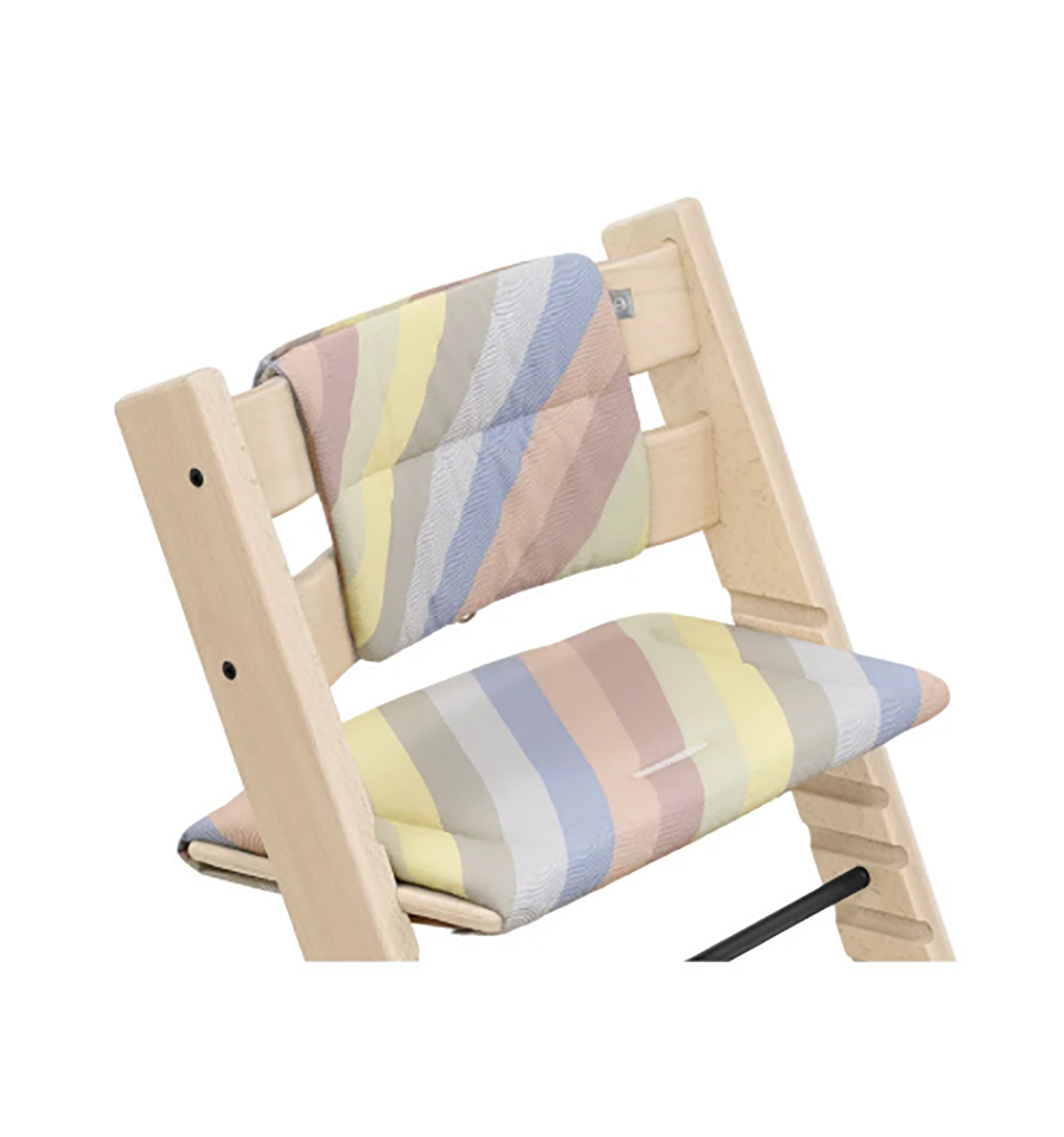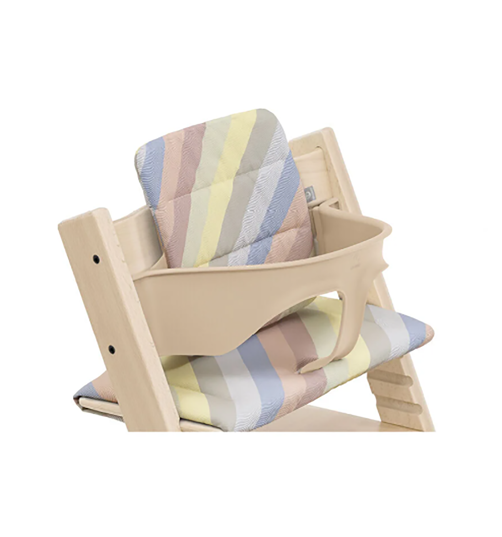 El coixí Tripp Trapp® millora la comoditat i el suport de la trona, amb un ajustament perfecte, teixit hidròfug i materials sostenibles fàcils de netejar.