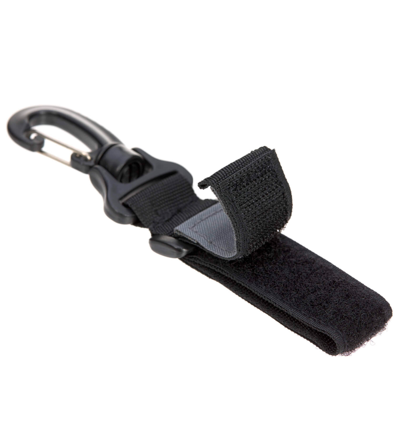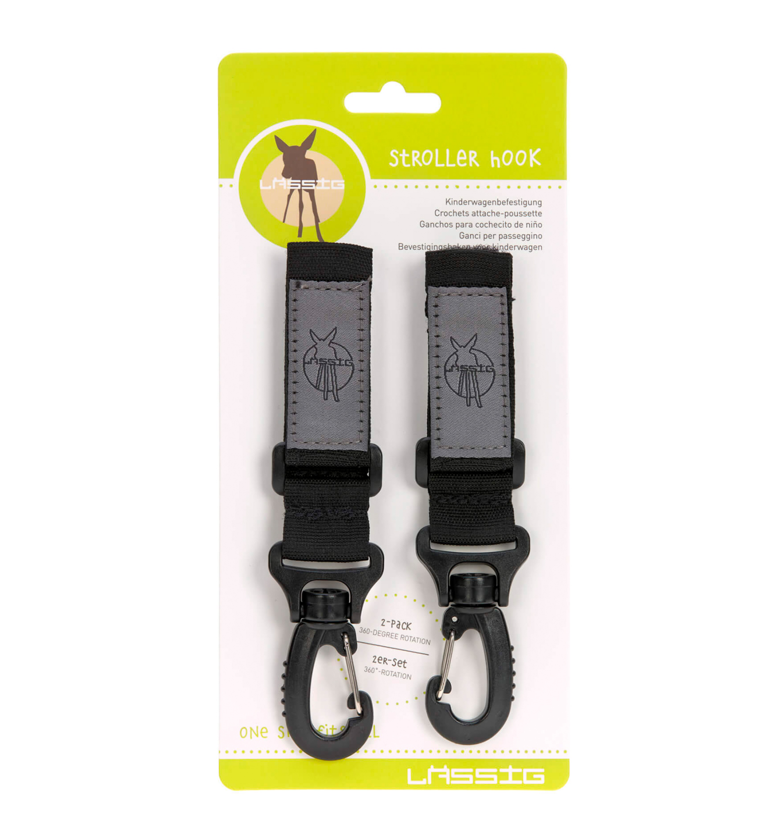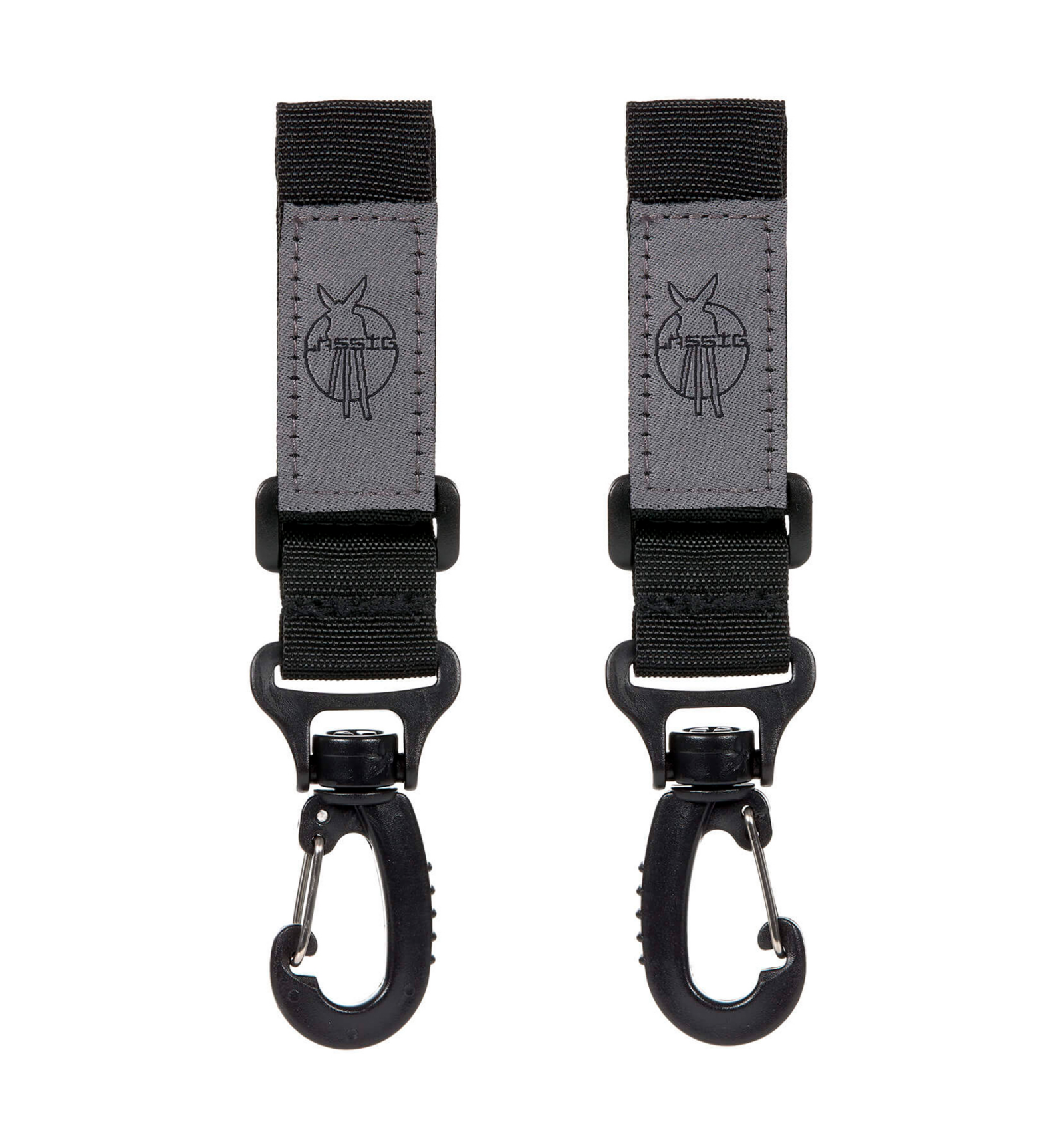 Pràctics ganxos per a penjar bosses de la cadireta de passeig. Dues corretges amb banda de velcro i mosquetons, aptes per a gairebé qualsevol model de cotxet. De 16 cm de llarg x 3,5 cm d'ample.
