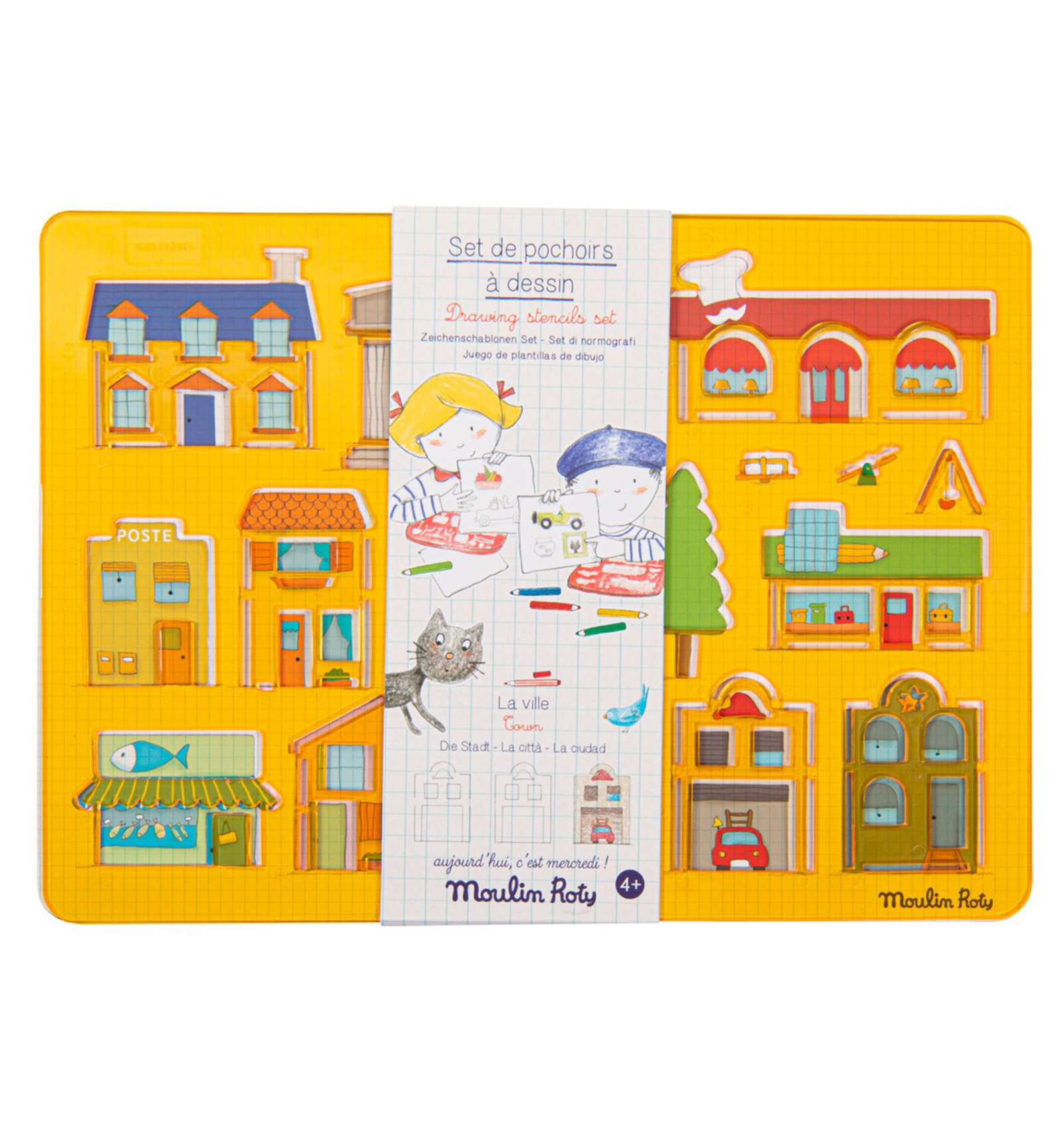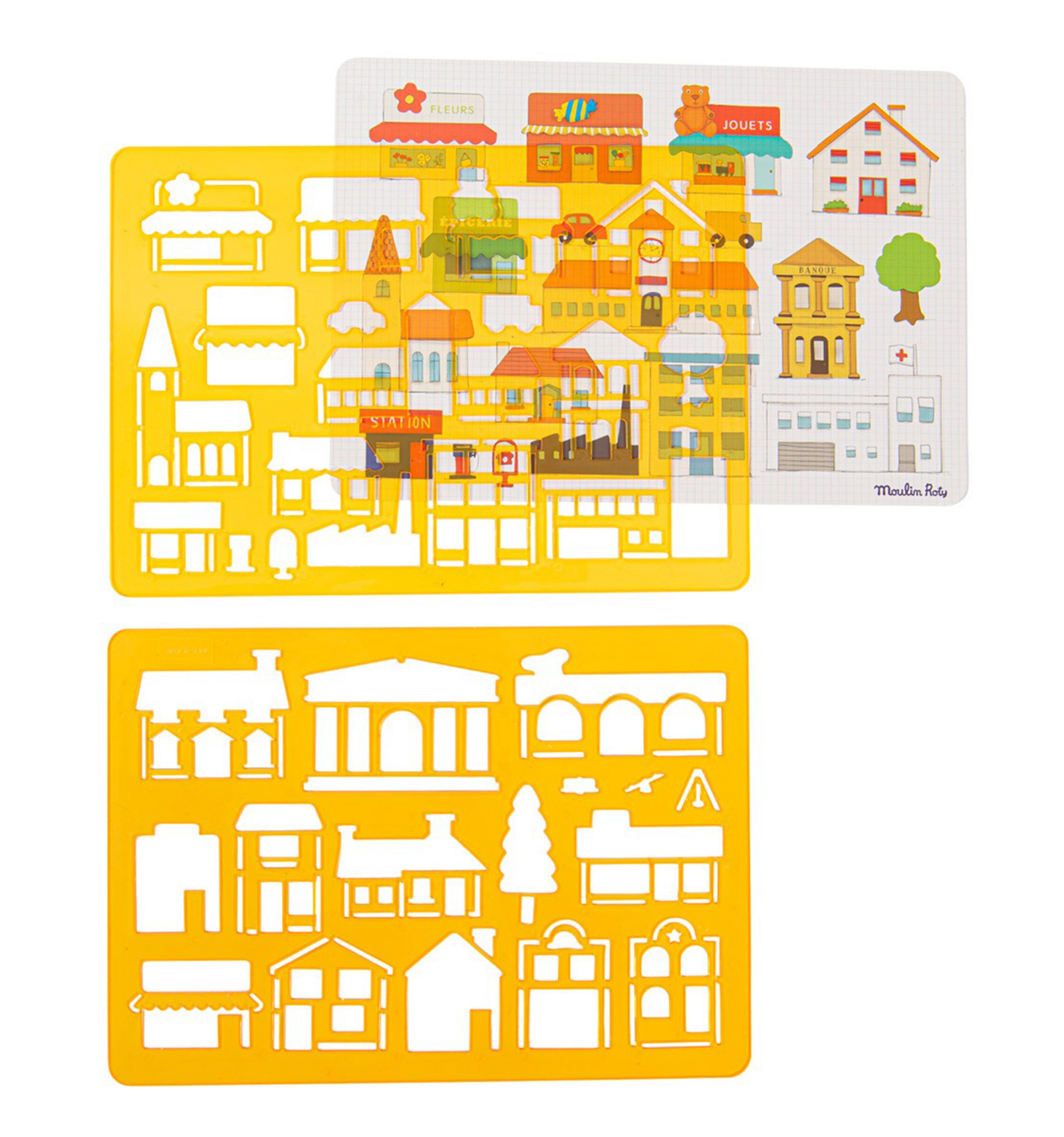 Tot un clàssic que no falla. Set de dues plantilles perquè les criatures dibuixin fàcilment els elements de la ciutat, pintant en infinites combinacions els carrers, els parcs, les botigues,... Les dues plantilles són de plàstic dur, rentables i reutilitzables. Dimensions; 27 x 19 cm. A partir dels 3 anys.