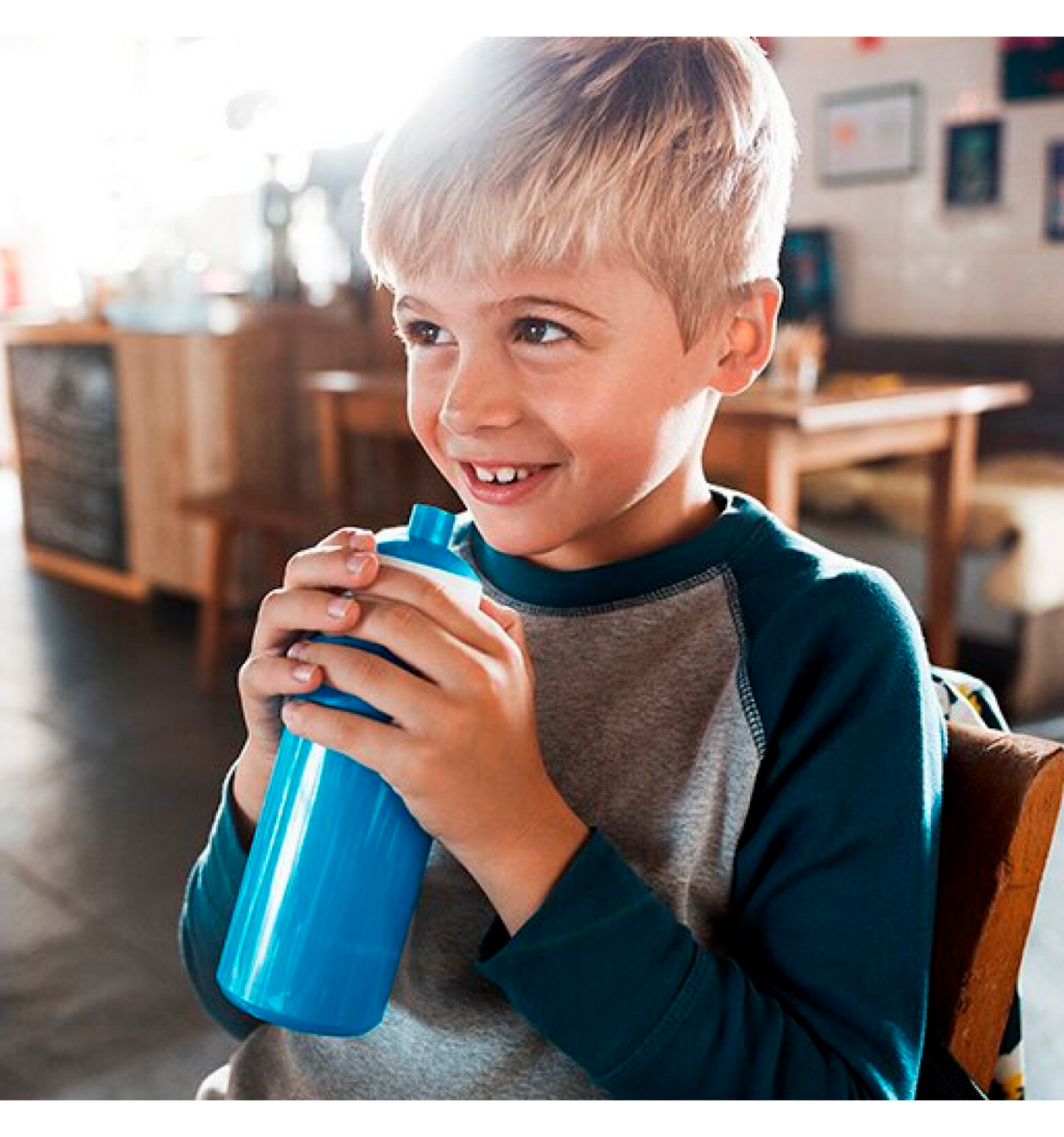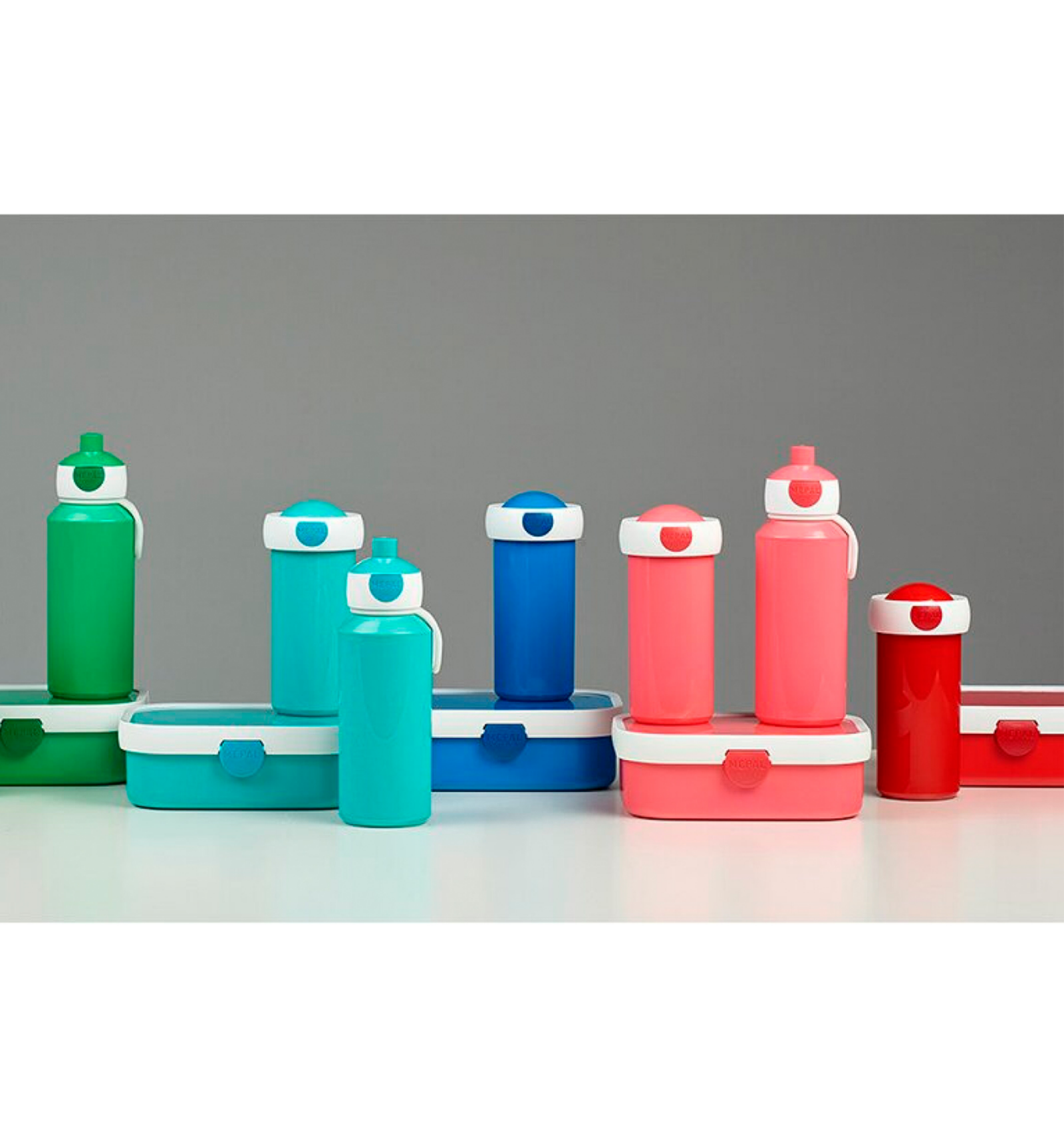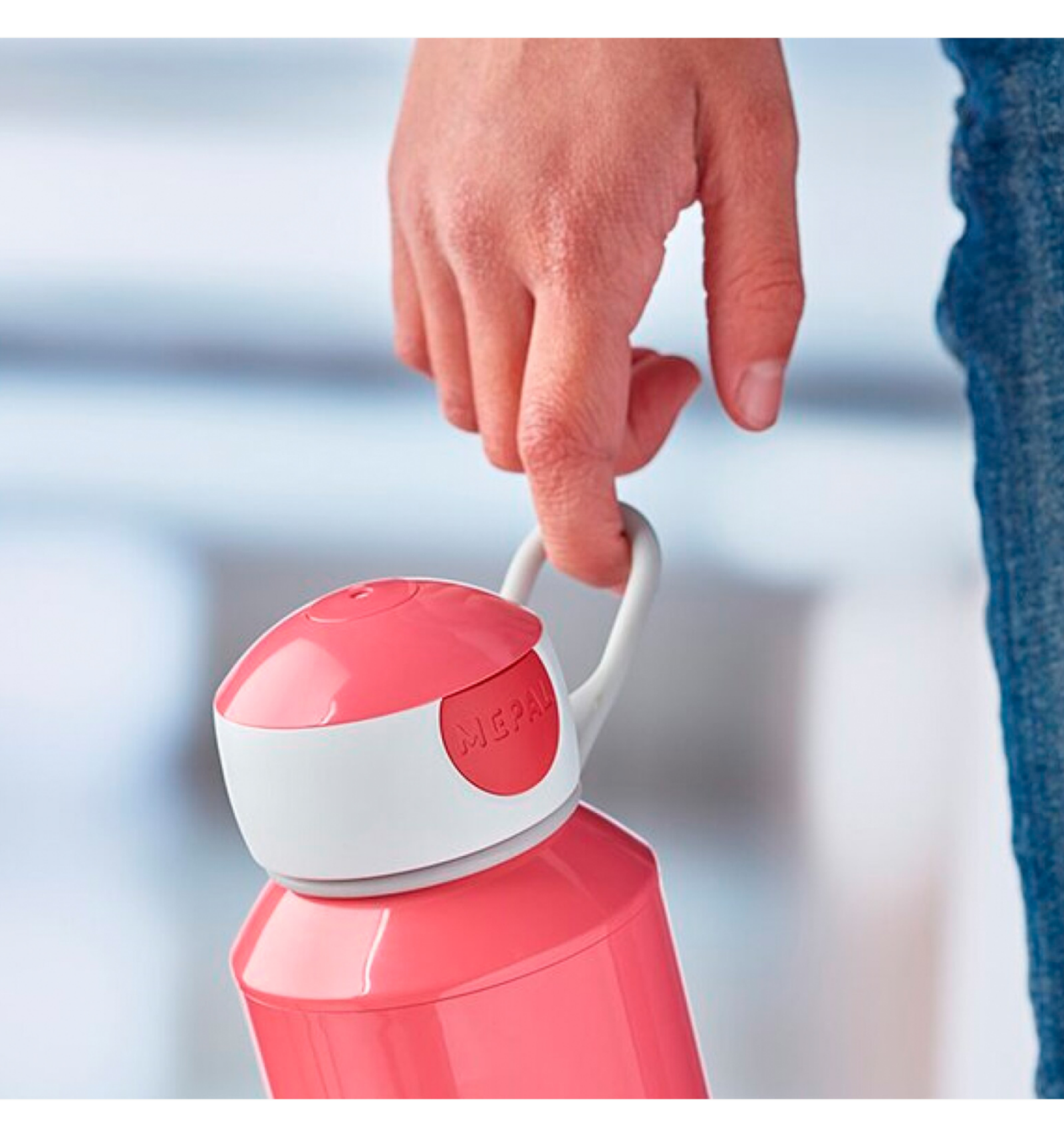 Una ampolla fàcil d'usar per als més petits/es de la casa. Tan sols han de pitjar el botó (el vermell, on posa Mepal) i sortirà el broc pel qual beure. Una vegada baixat, l'ampolla queda completament estanca i a prova de fuites.