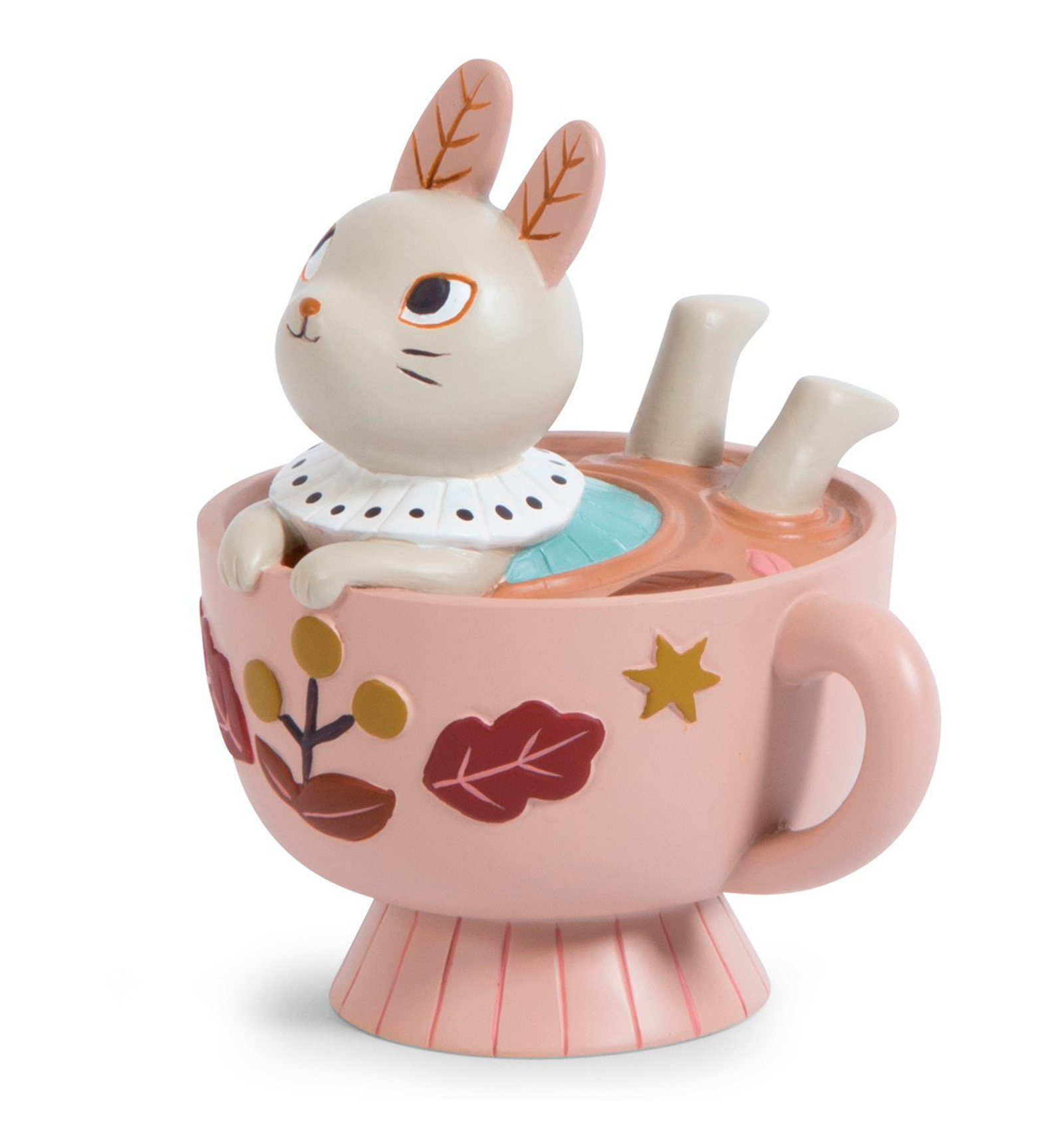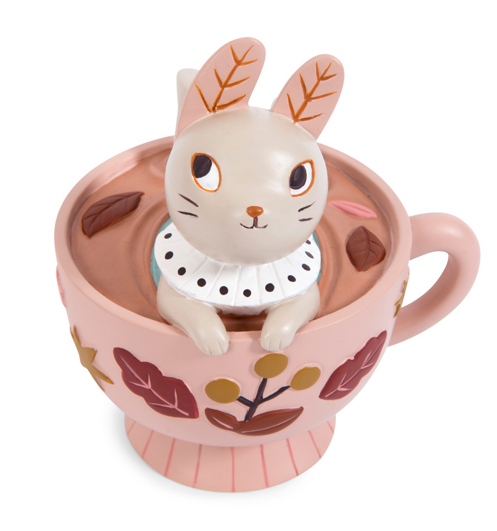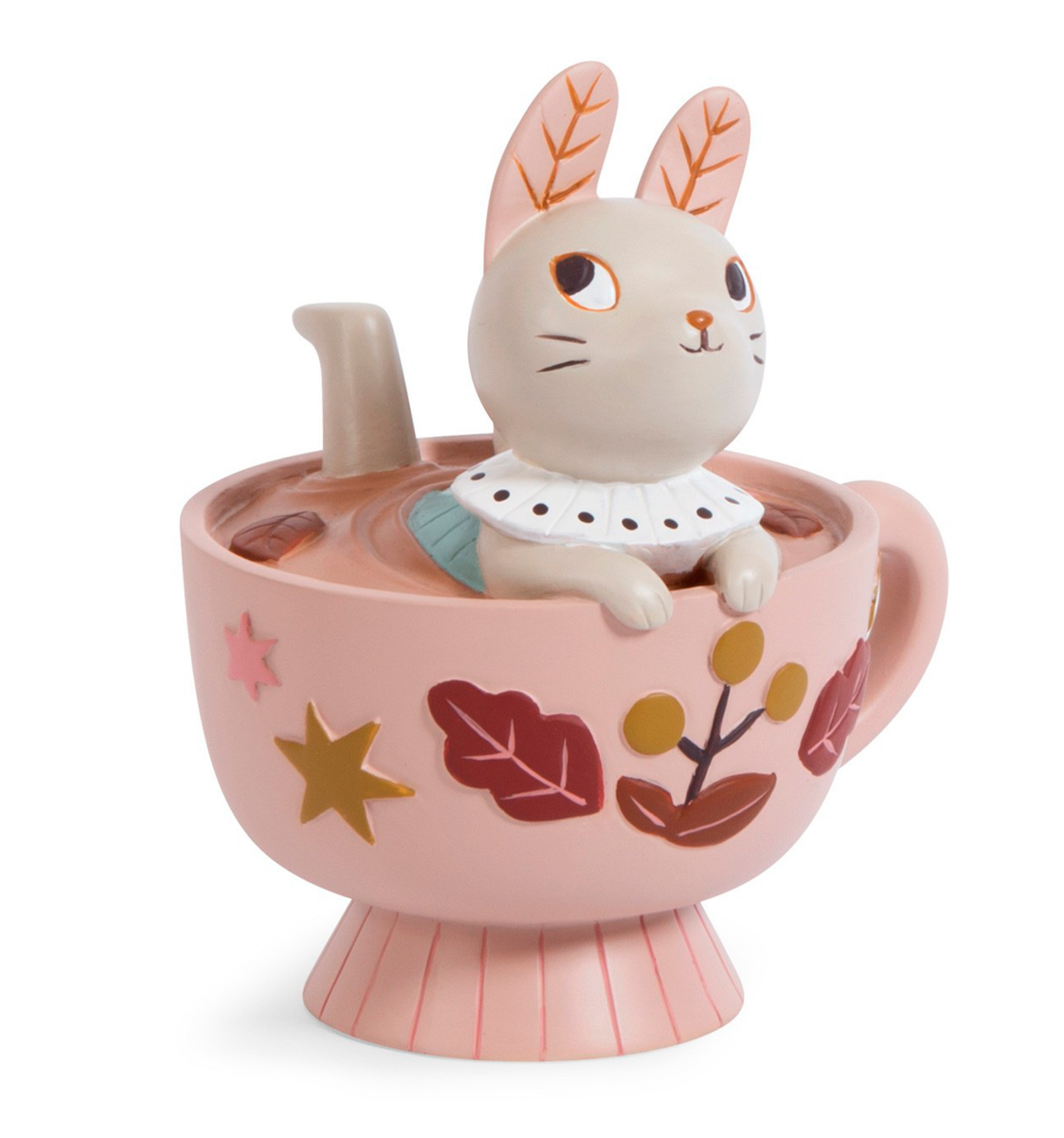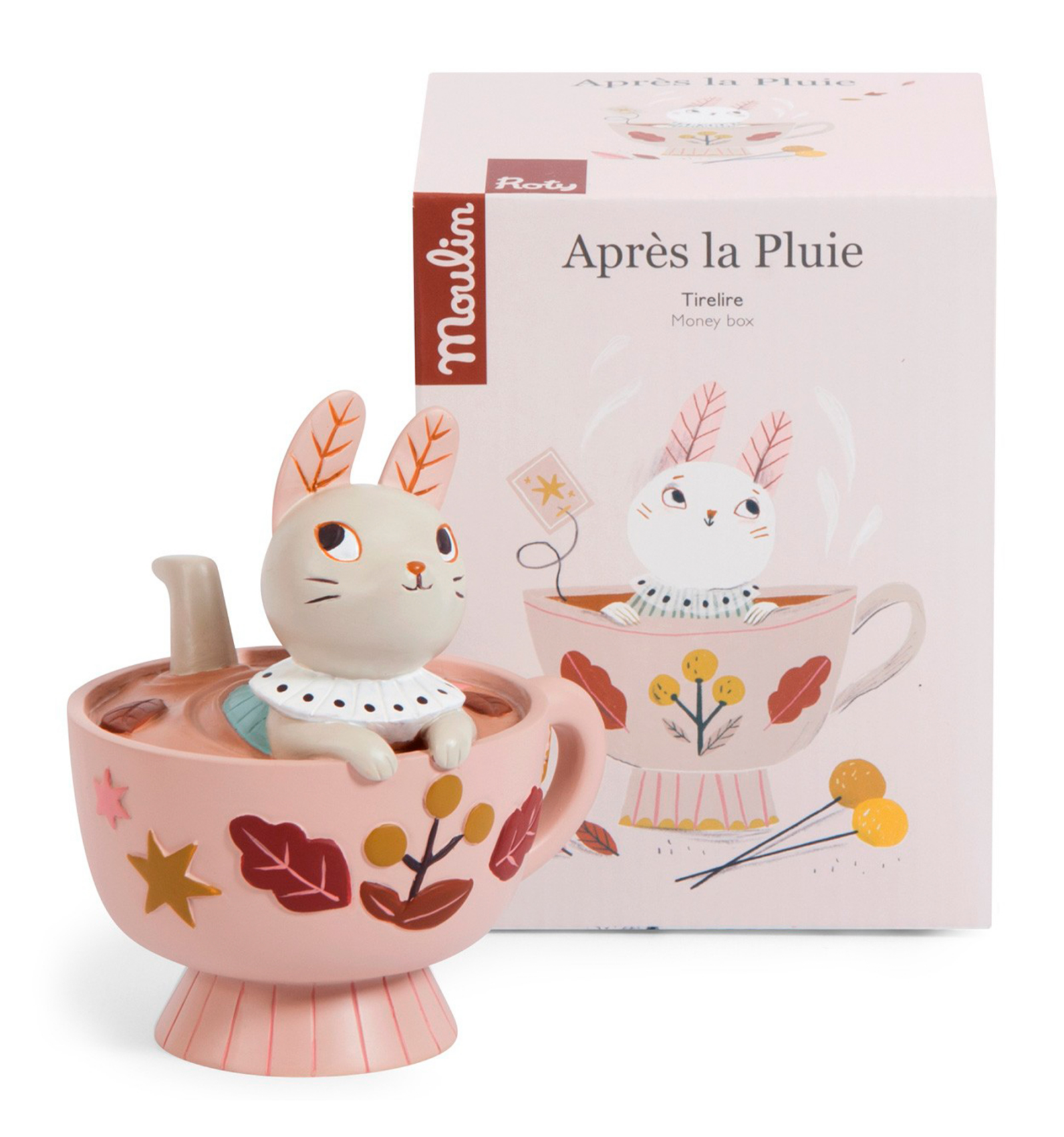 Ensenya a estalviar als teus fills amb aquesta decorativa guardiola. Feta de resina en colors tardorencs, pintada a mà, on el conill de Moulin Roty es banya en una bonica tassa de xocolata. Un excel·lent regal per a nens i nenes de totes les edats. Dimensions 13x11x14 cm.