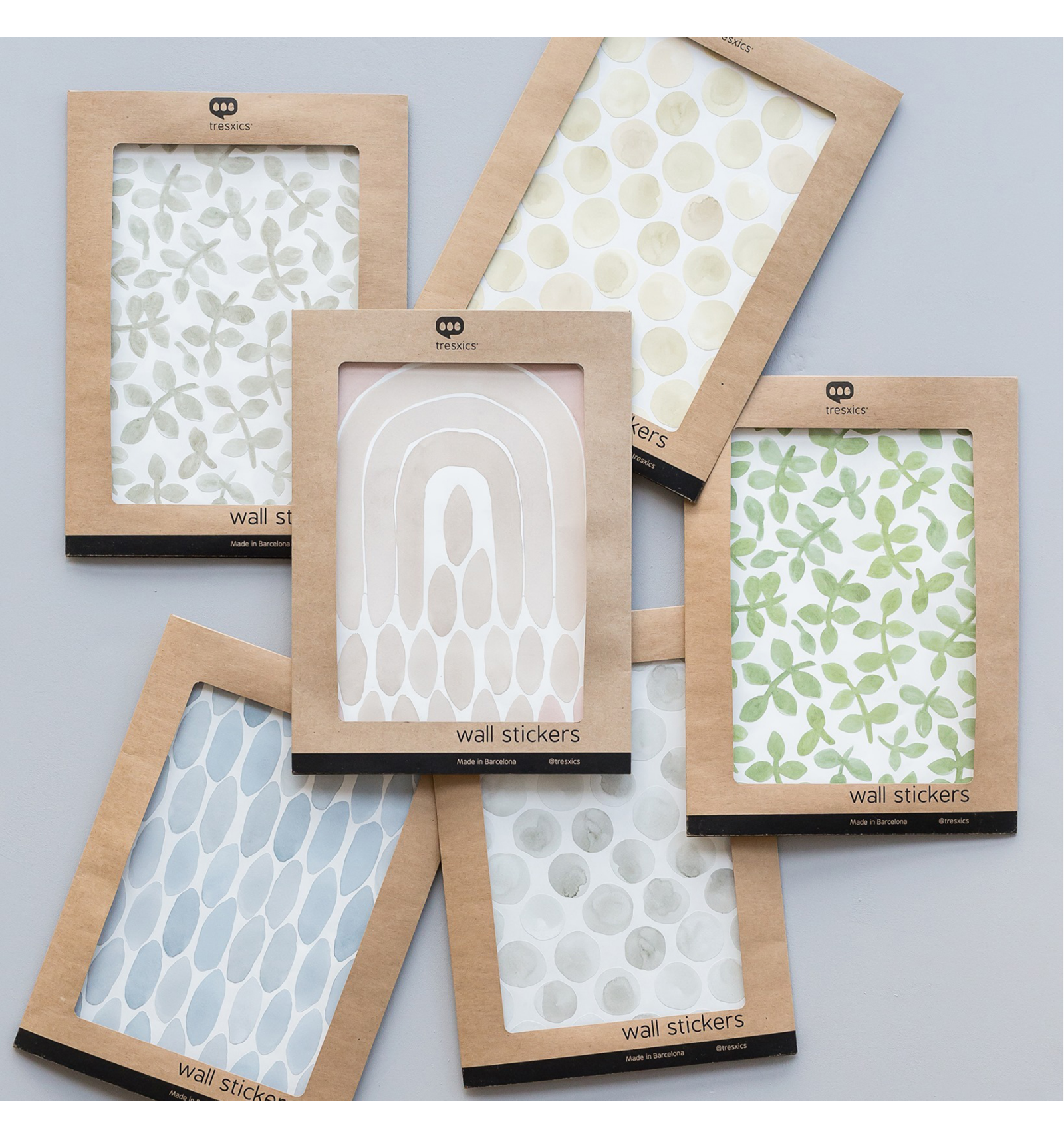 Dibuix original pintat en aquarel·la i impresos sobre un adhesiu d'alta qualitat. Amb un acabat texturitzat i mat, crea un efecte que sembla pintat directament sobre la paret. A més, aquest adhesiu d'alta qualitat et permetrà enganxar i treure per a rectificar la col·locació sense perdre gens d'adherència. S'adhereix perfectament sobre parets amb gotelé, sempre que aquest no sigui molt pronunciat. A més ho podràs retirar, encara que passin anys, sense problema.