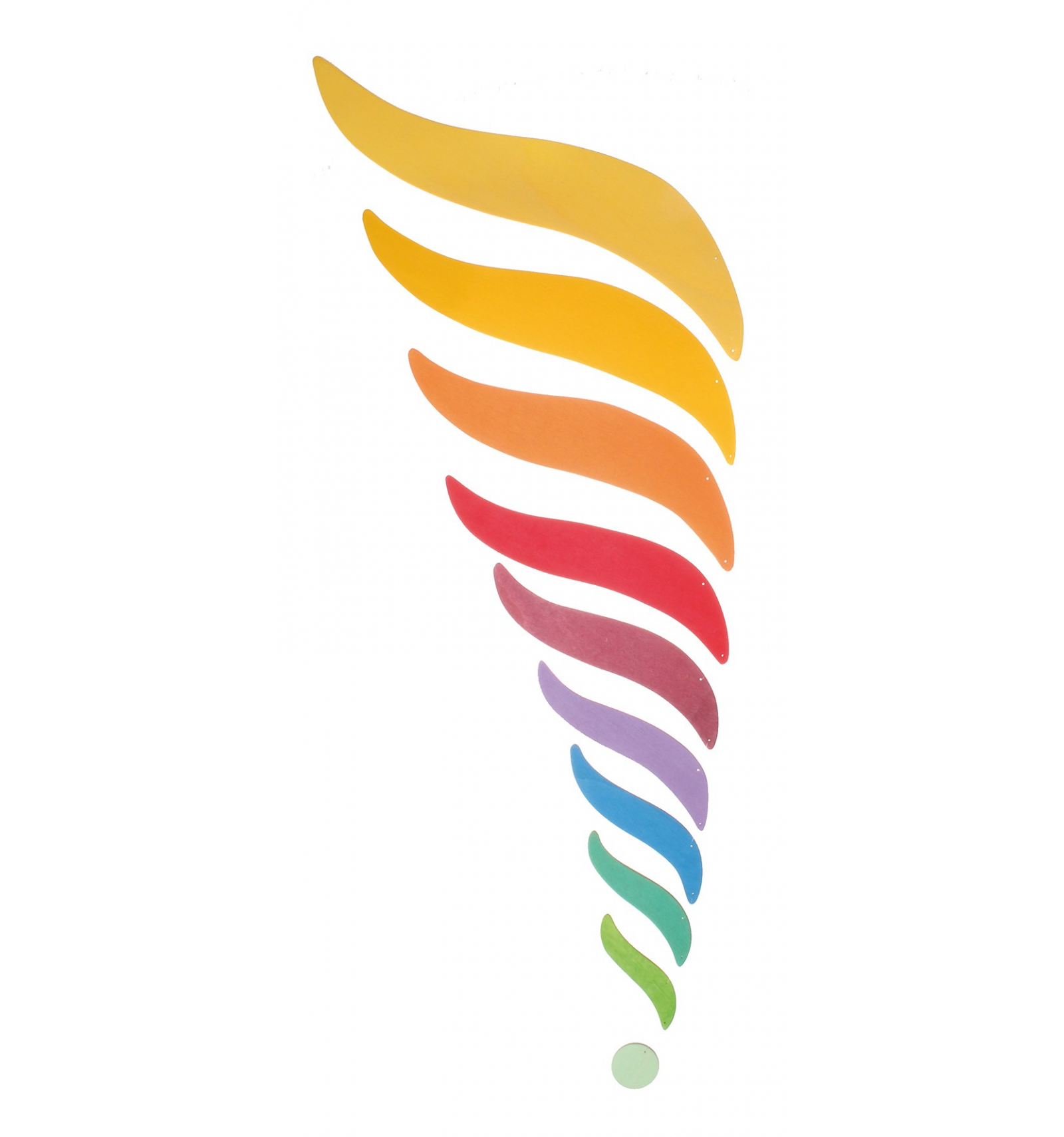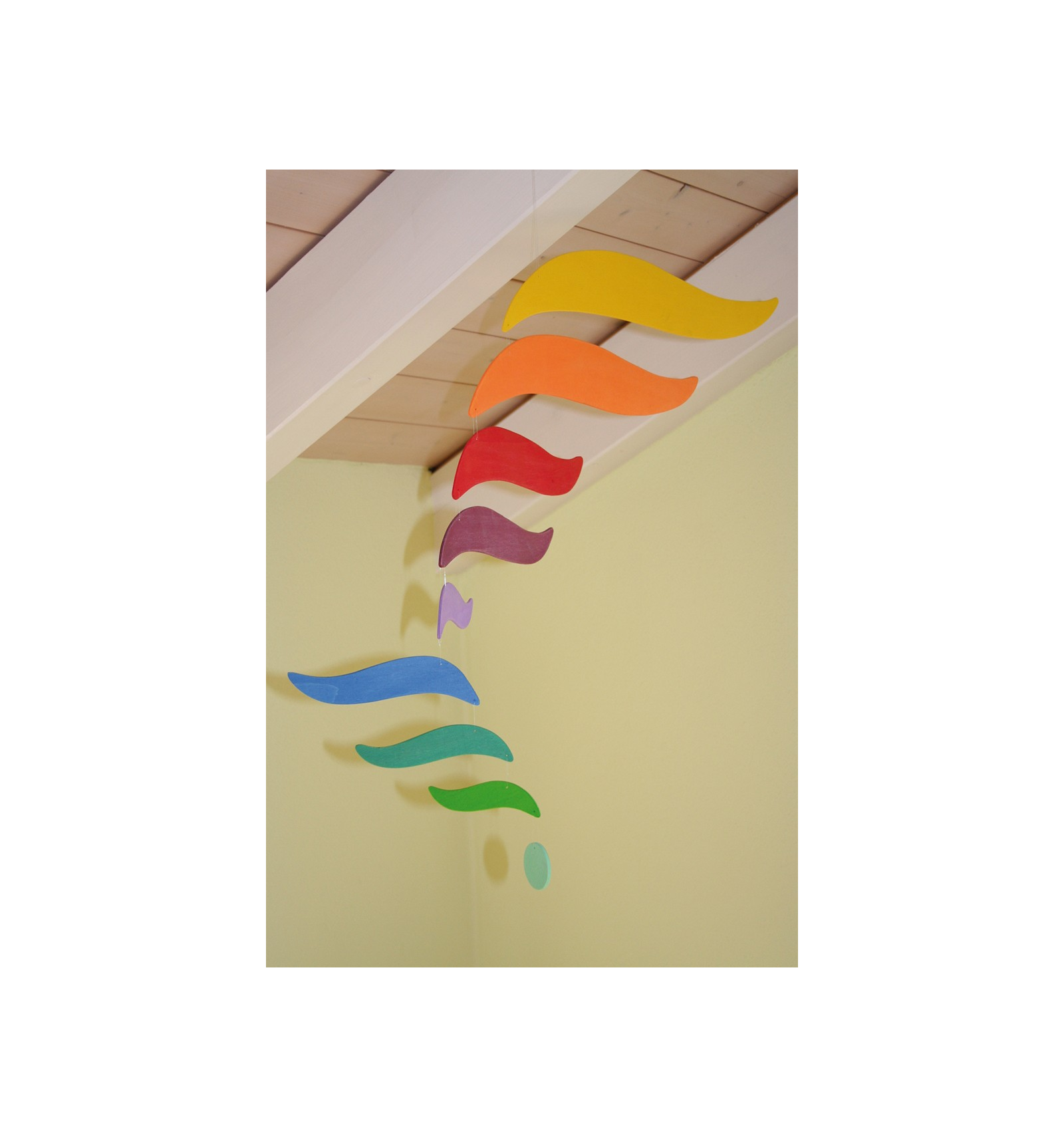 Els mòbils són molt apreciats perquè fan fluir l'energia de la sala on són col·locats. Aquest a més aporta màgia i color a l'estar fet d'un material natural com és la fusta, tallat amb formes ondulants que van girant i pintat amb colors vibrants.