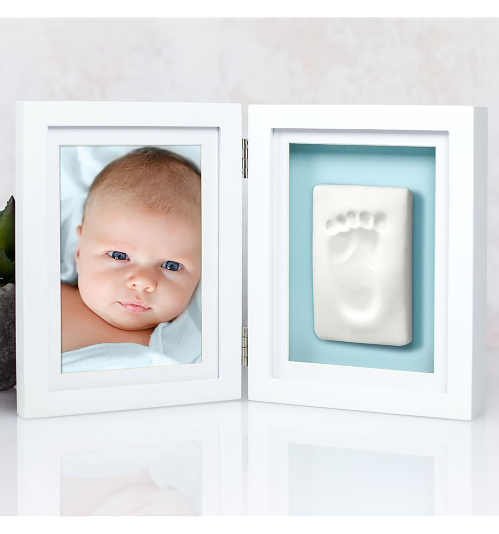 Només has de pressionar la seva mà o peu en l'argila, deixar-la assecar i fixar-la al marc amb la cinta adhesiva inclosa. A més, incorpora un tauler reversible en rosa i blau, perquè puguis personalitzar el fons al teu gust.