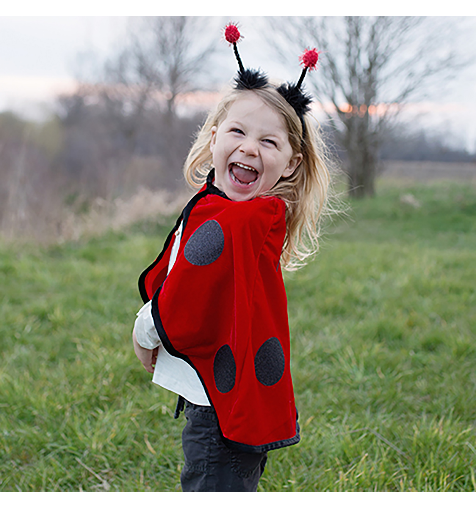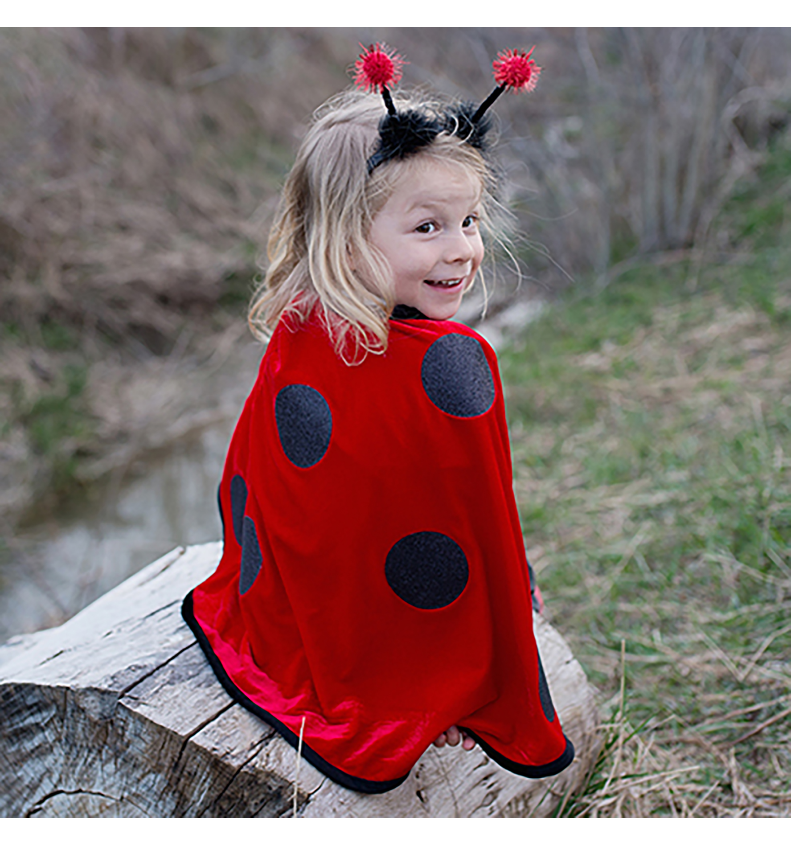 Capa vermella infantil amb topets negres i diadema amb antenes de pompó. Ideal per a jocs de fantasia i activitats a l'aire lliure.