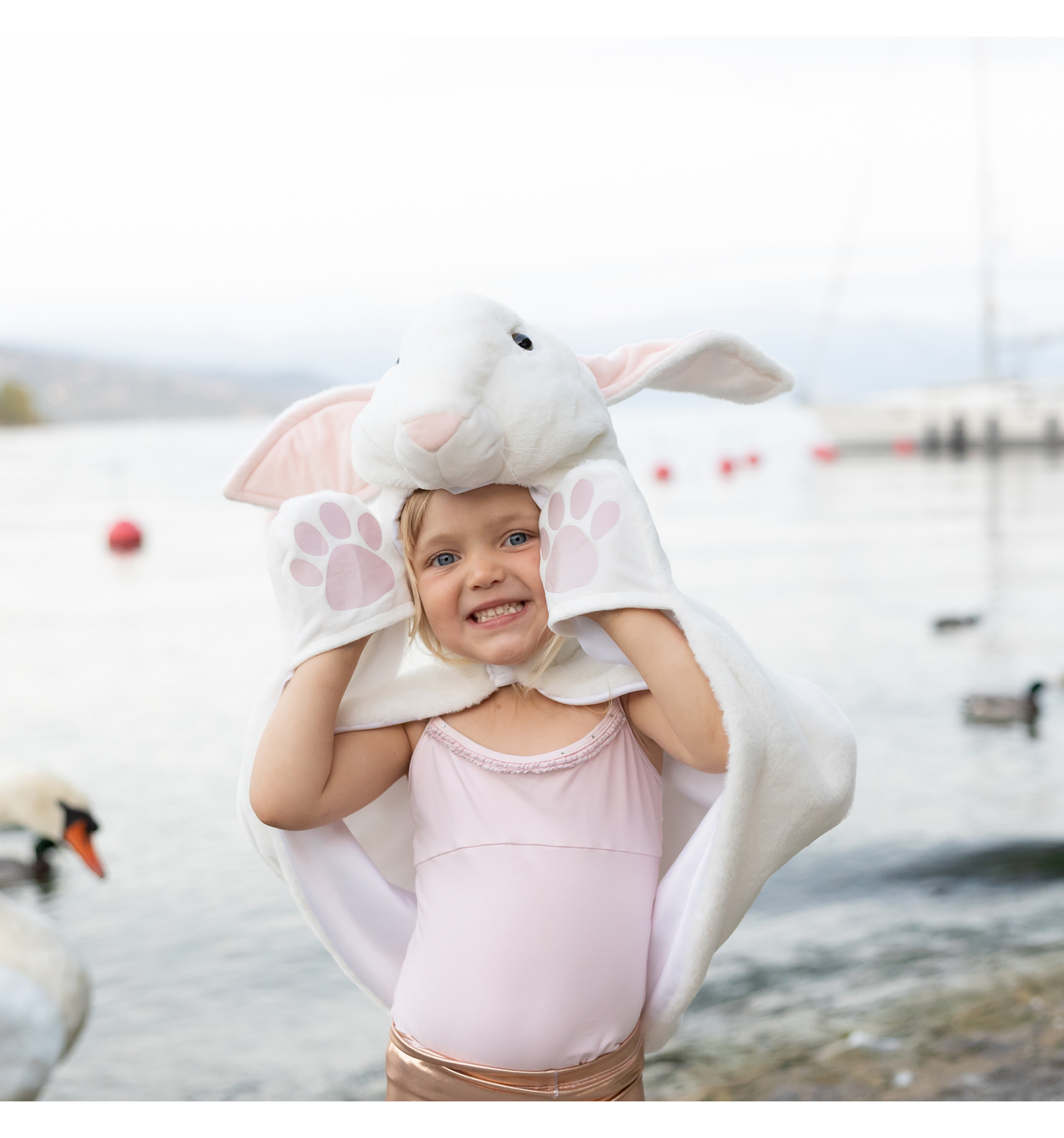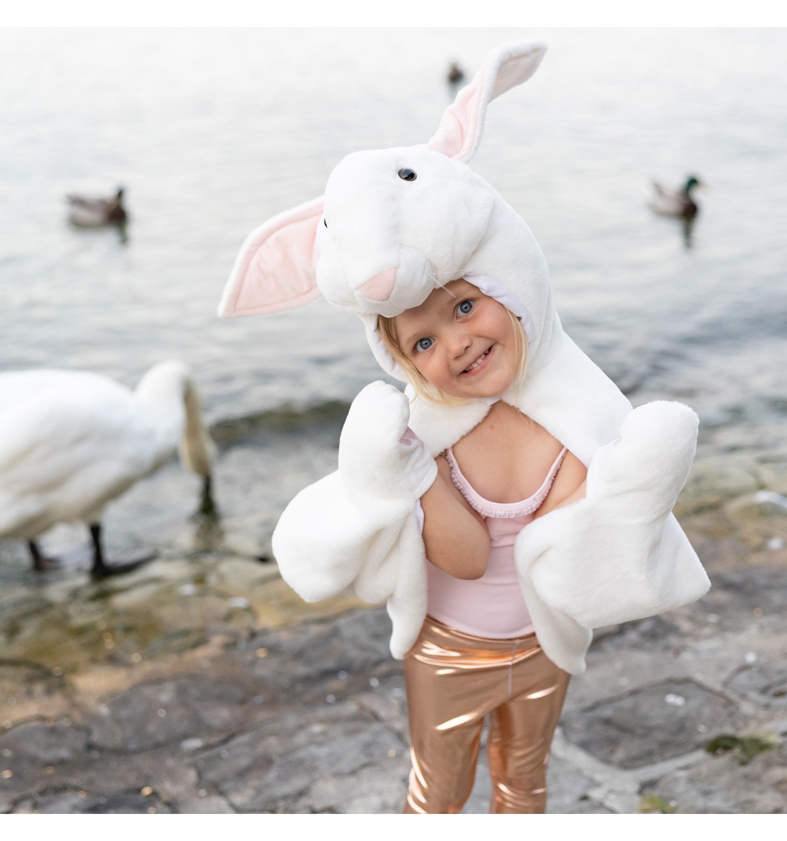 Salta a la diversió amb la nostra encantadora capa de conillet! Confeccionada en suau pell blanca com la neu, transforma al teu petit en l'amic més tendre. La caputxa amb cap de conill de peluix i orelles alçades afegeix un toc encantador, mentre que les butxaques en forma de poteta completen el look perfecte per a explorar, jugar i gaudir d'aventures màgiques. Talla 2-3 anys.