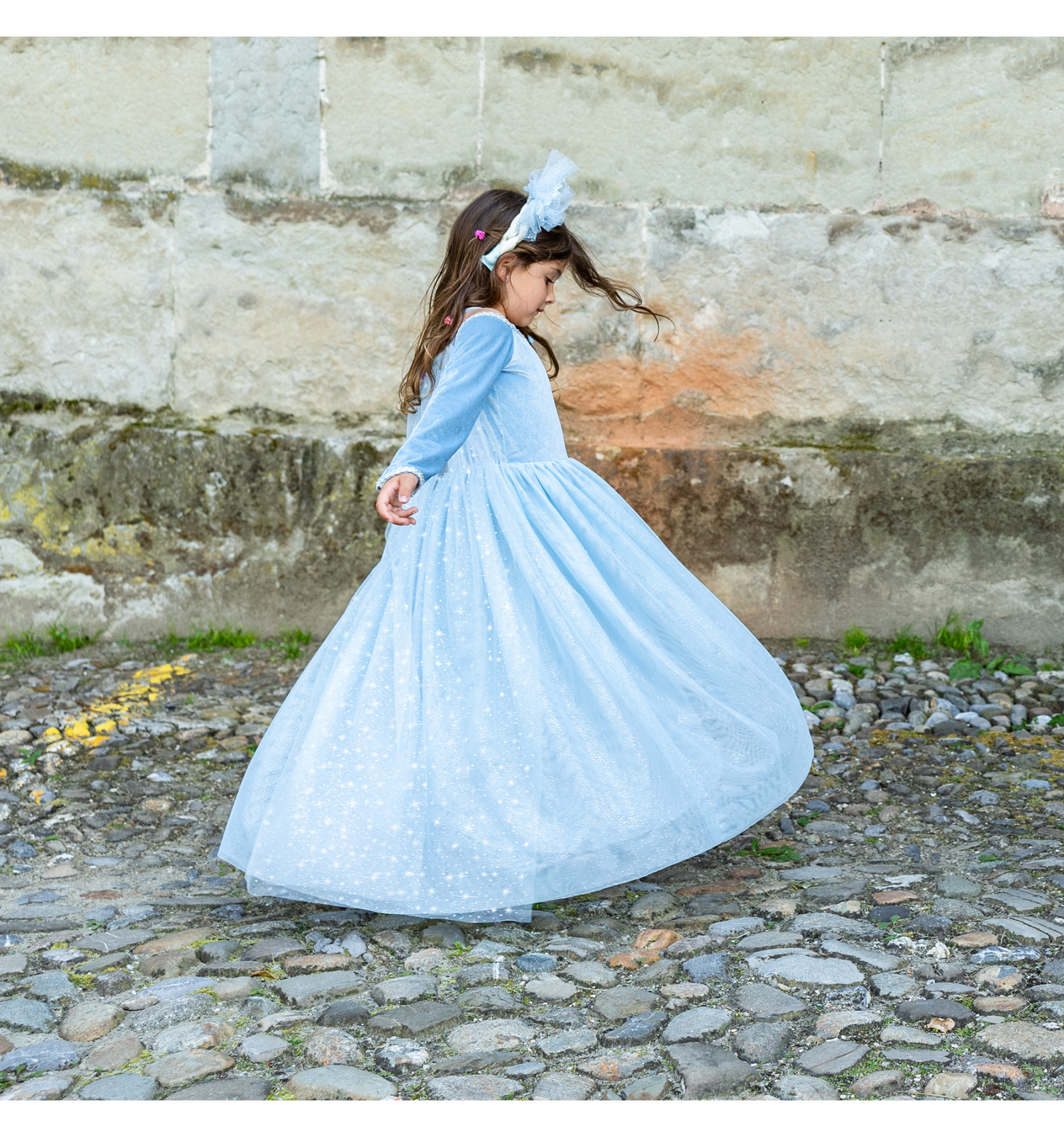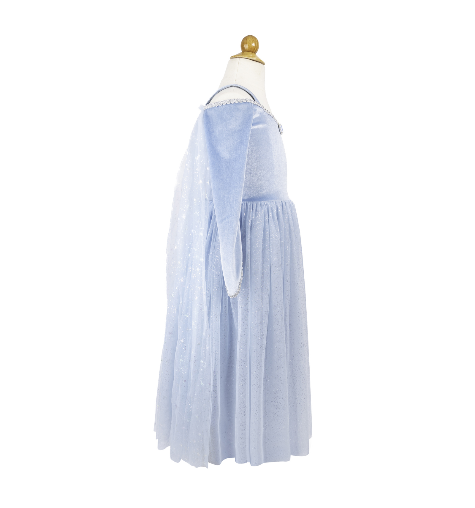 La capa de malla unida a l'esquena, estampada amb cristalls brillants, li atorga un aire majestuós digne d'una princesa de la neu. La faldilla de tul suau convida a girar i ballar amb gràcia. Perfecte per a qualsevol ocasió especial o jocs plens de fantasia, aquest vestit portarà al teu petit directe al seu propi conte de fades.