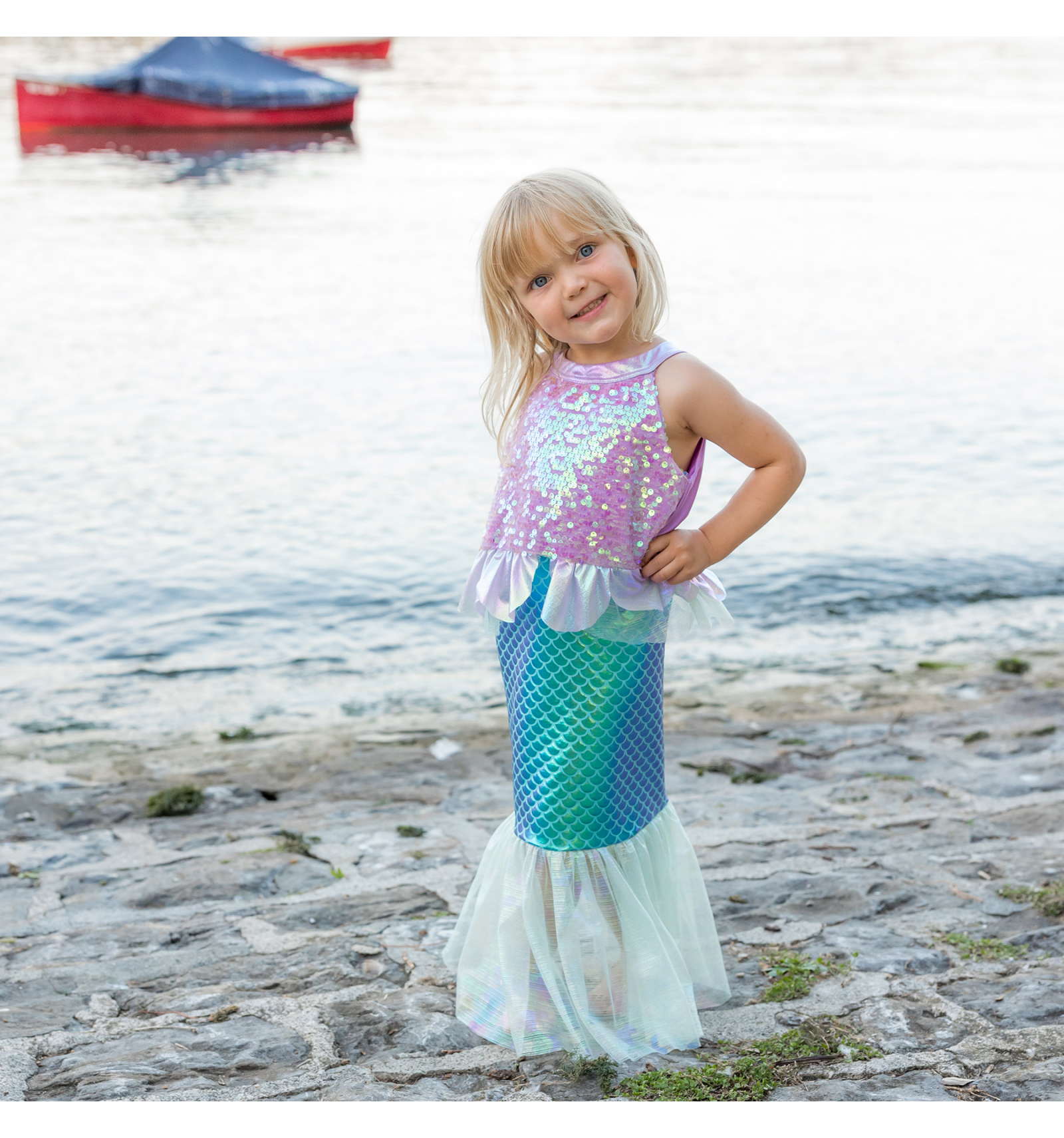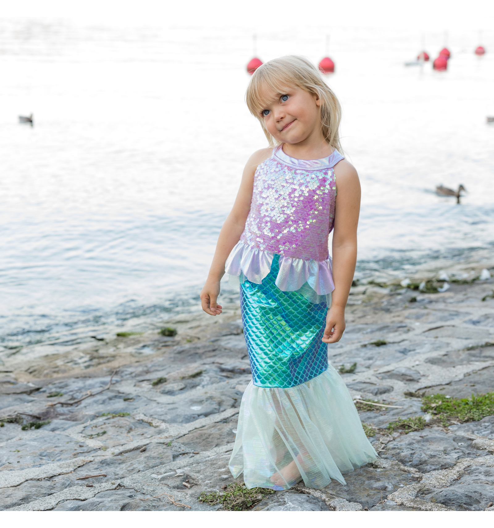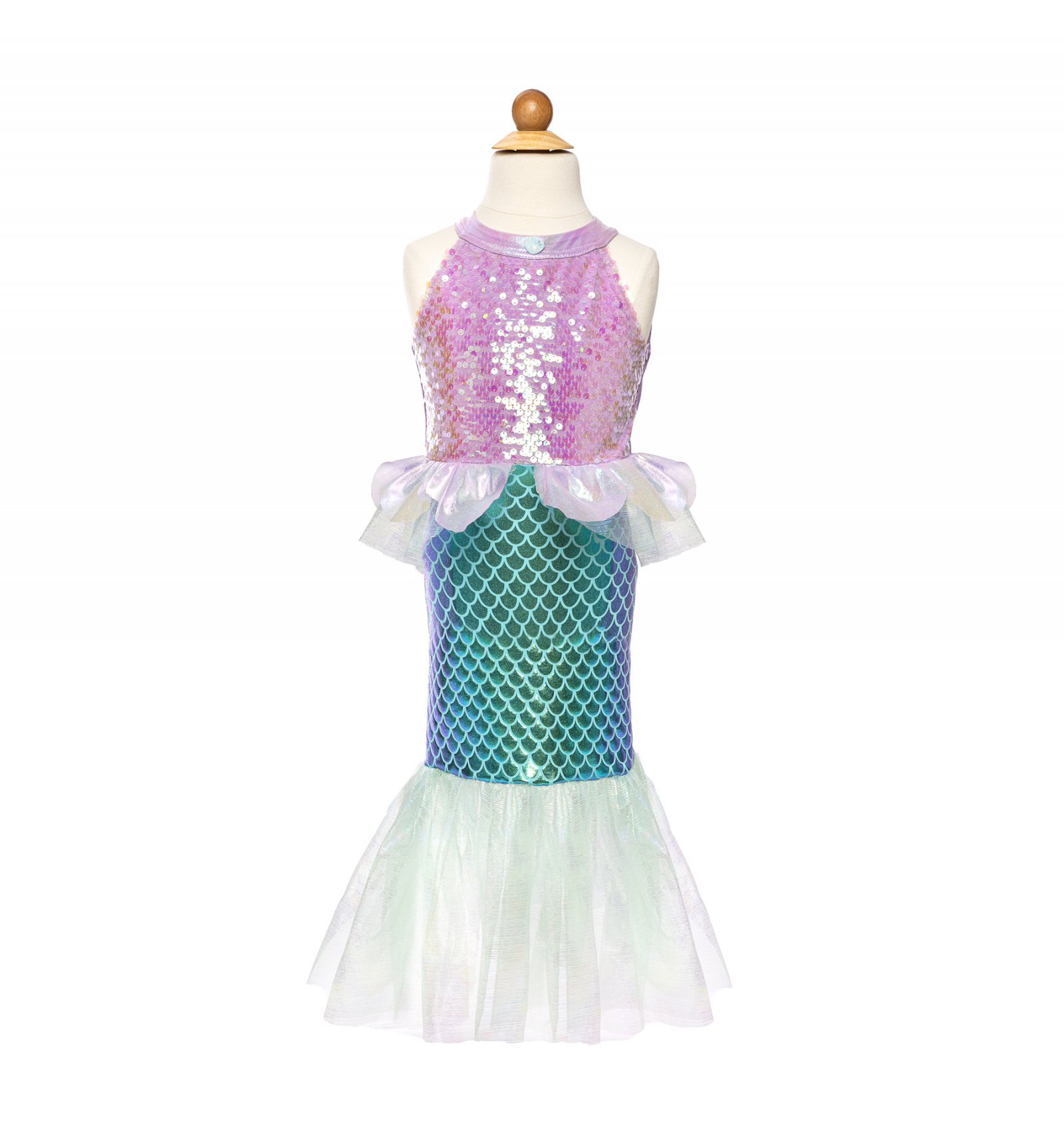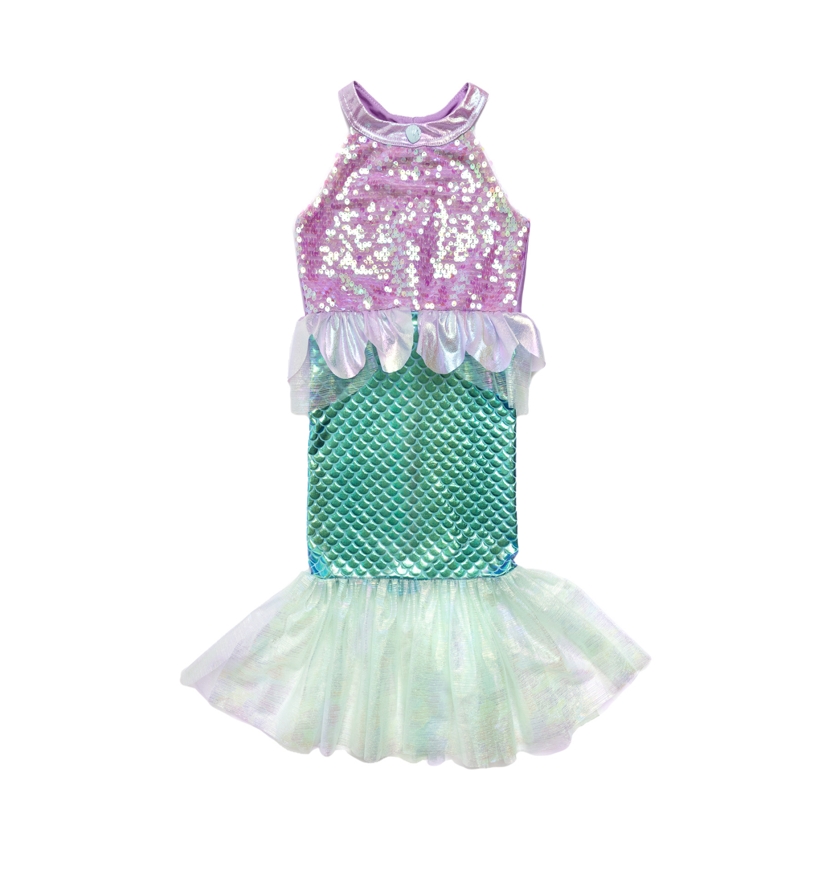 L'estampat d'escates vibrants i l'acabat brillant fan que aquest vestit sigui perfecte per a jocs imaginatius, sessions de fotos o qualsevol ocasió especial. Ideal per als qui somien amb ser princeses de la mar.