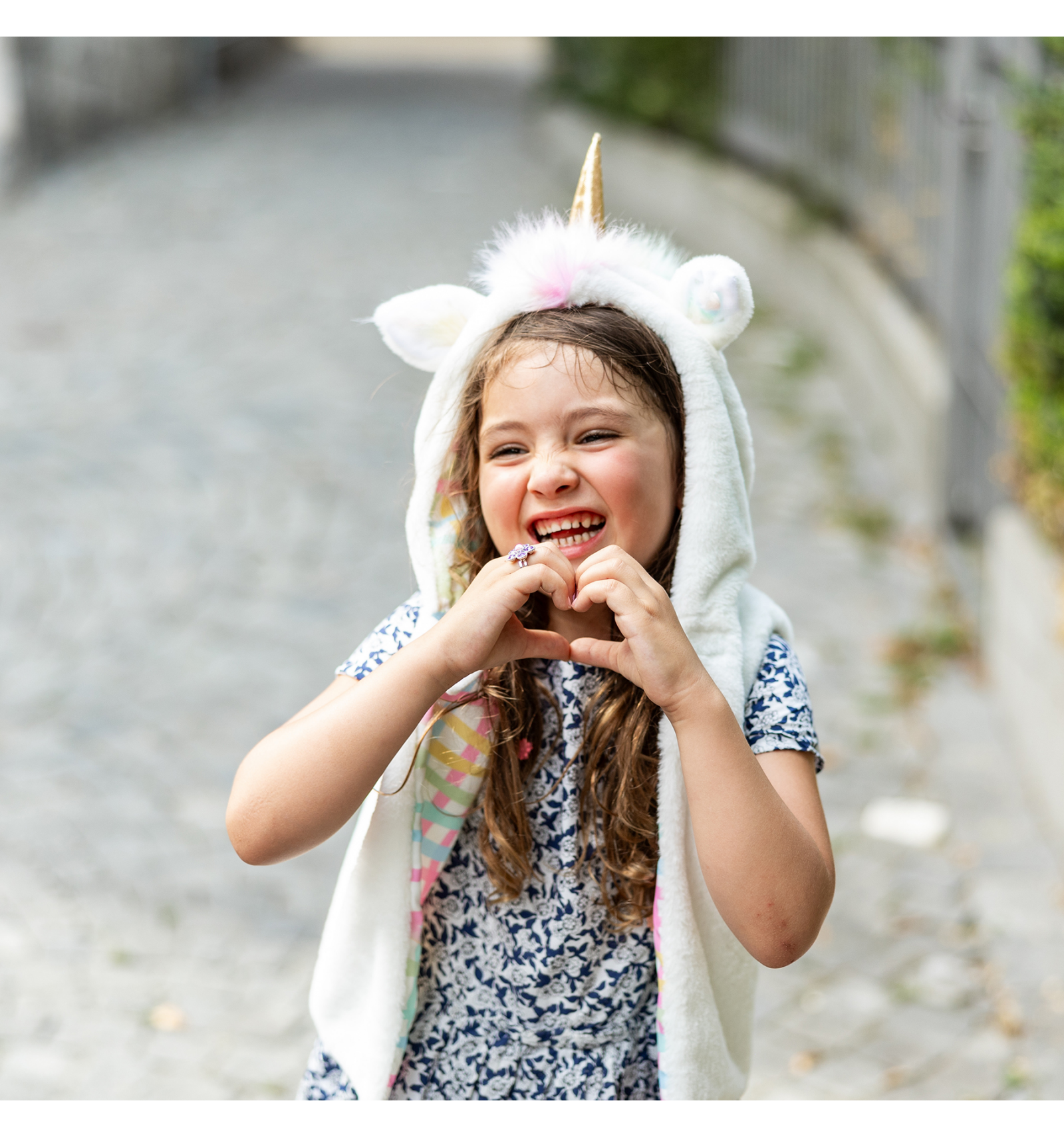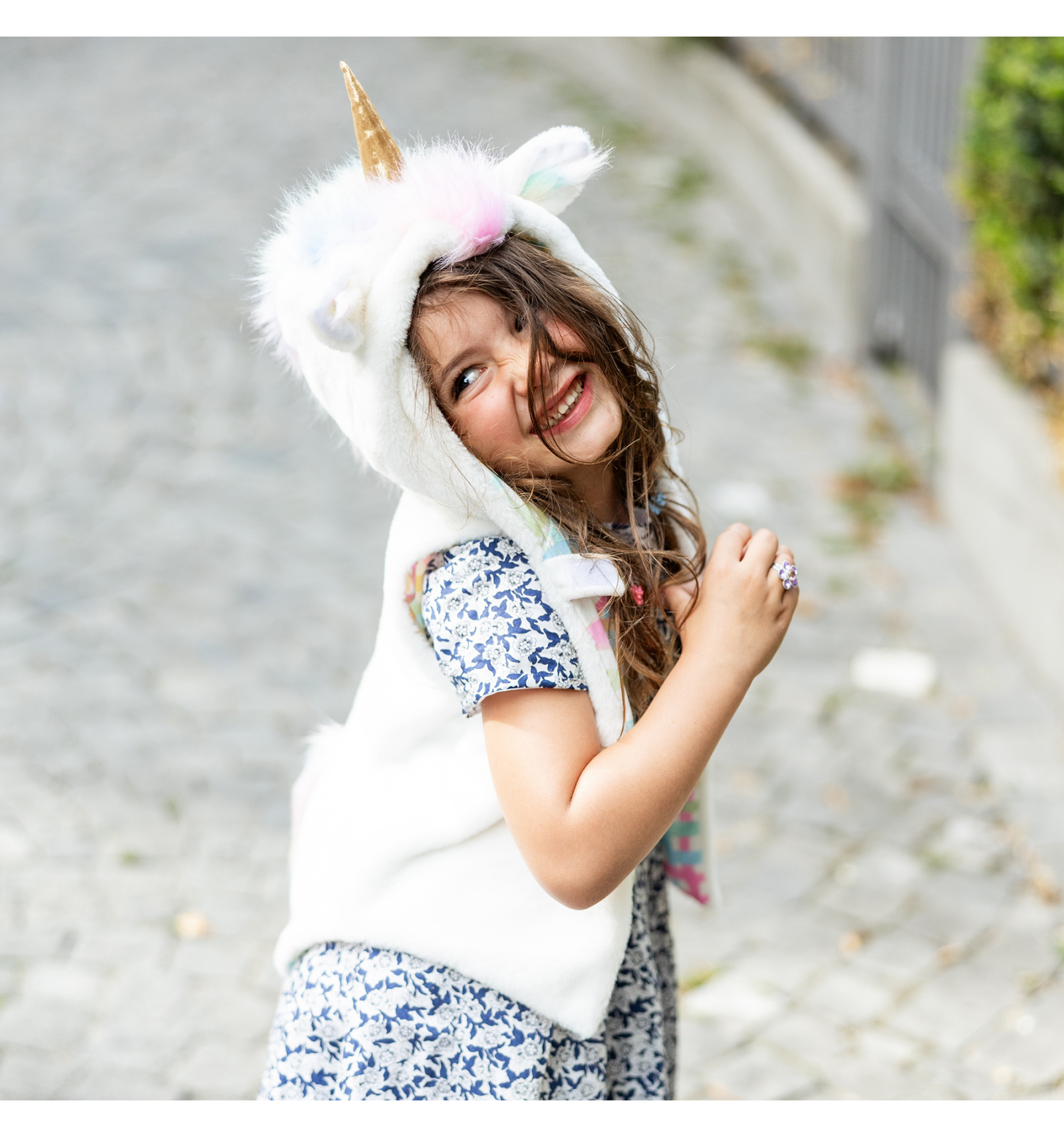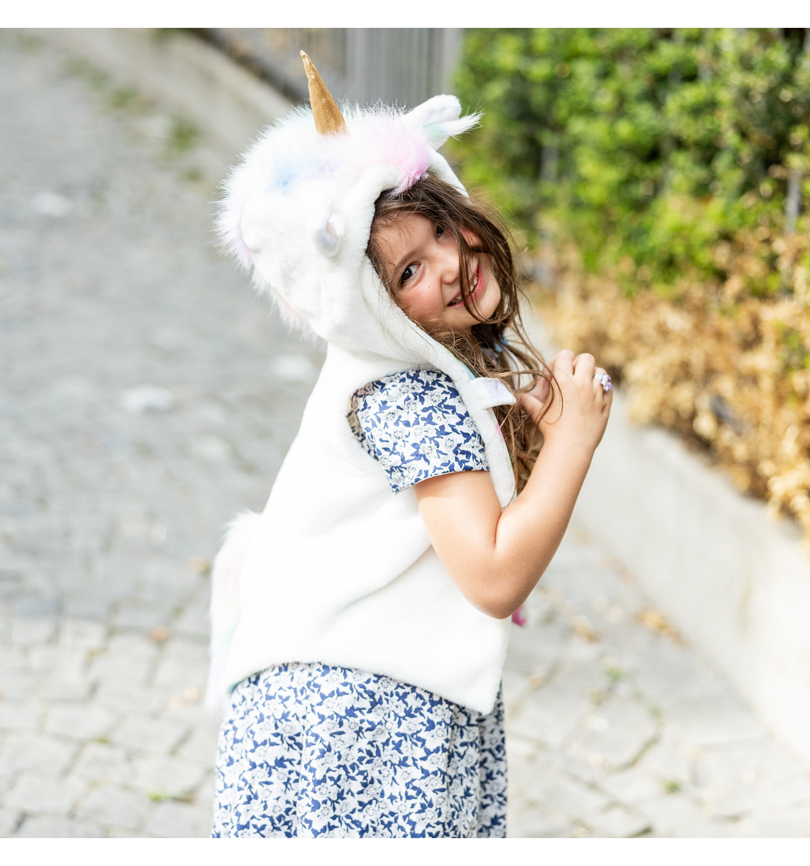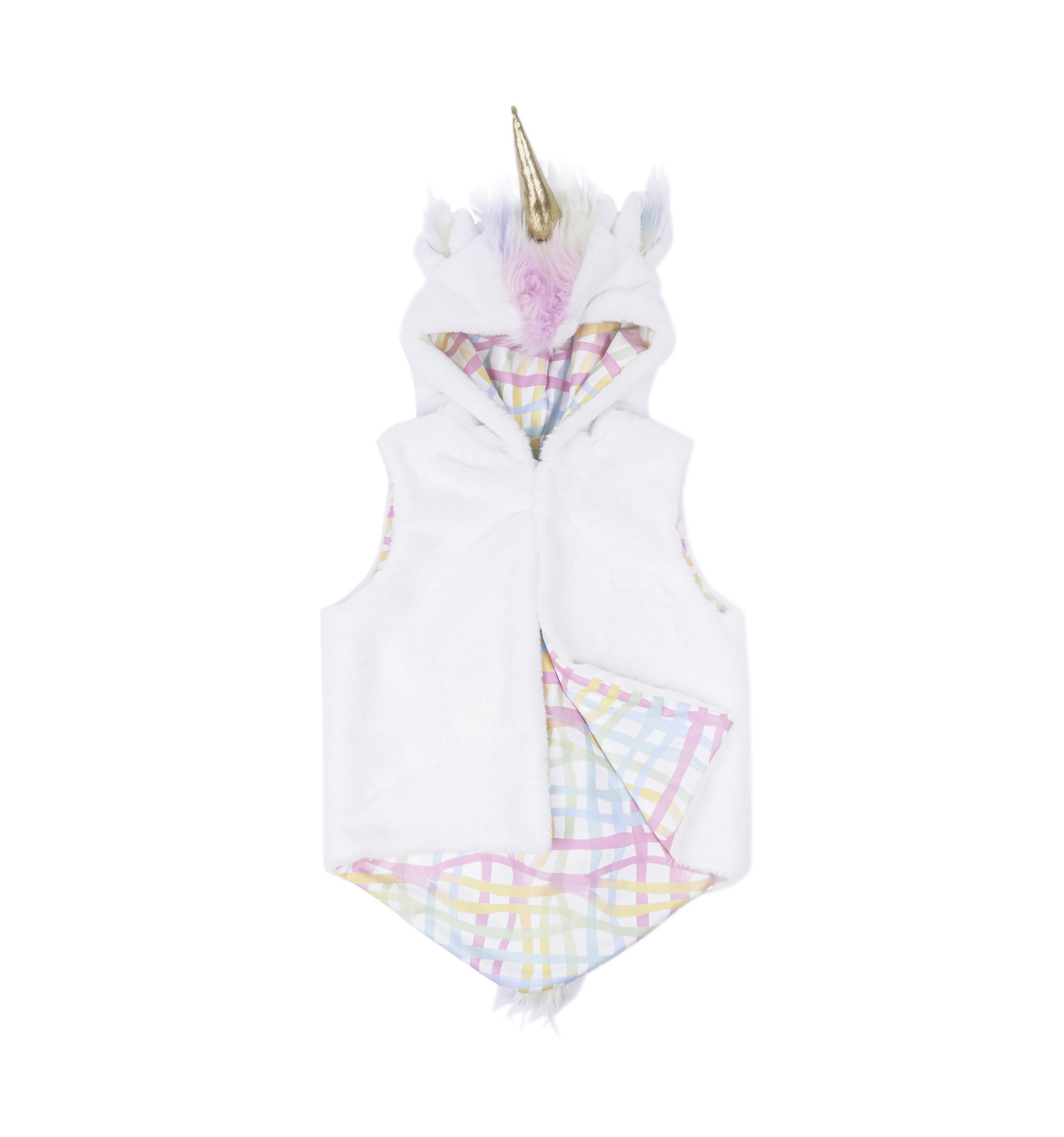 Feix que cada dia sigui màgic amb l'armilla d'unicorn All Day Everyday! Amb pell blanca suau, banya daurada brillant i un folre de quadres vichy pastel, és perfecte per a aventures plenes de fantasia. Talla 3-4 anys.