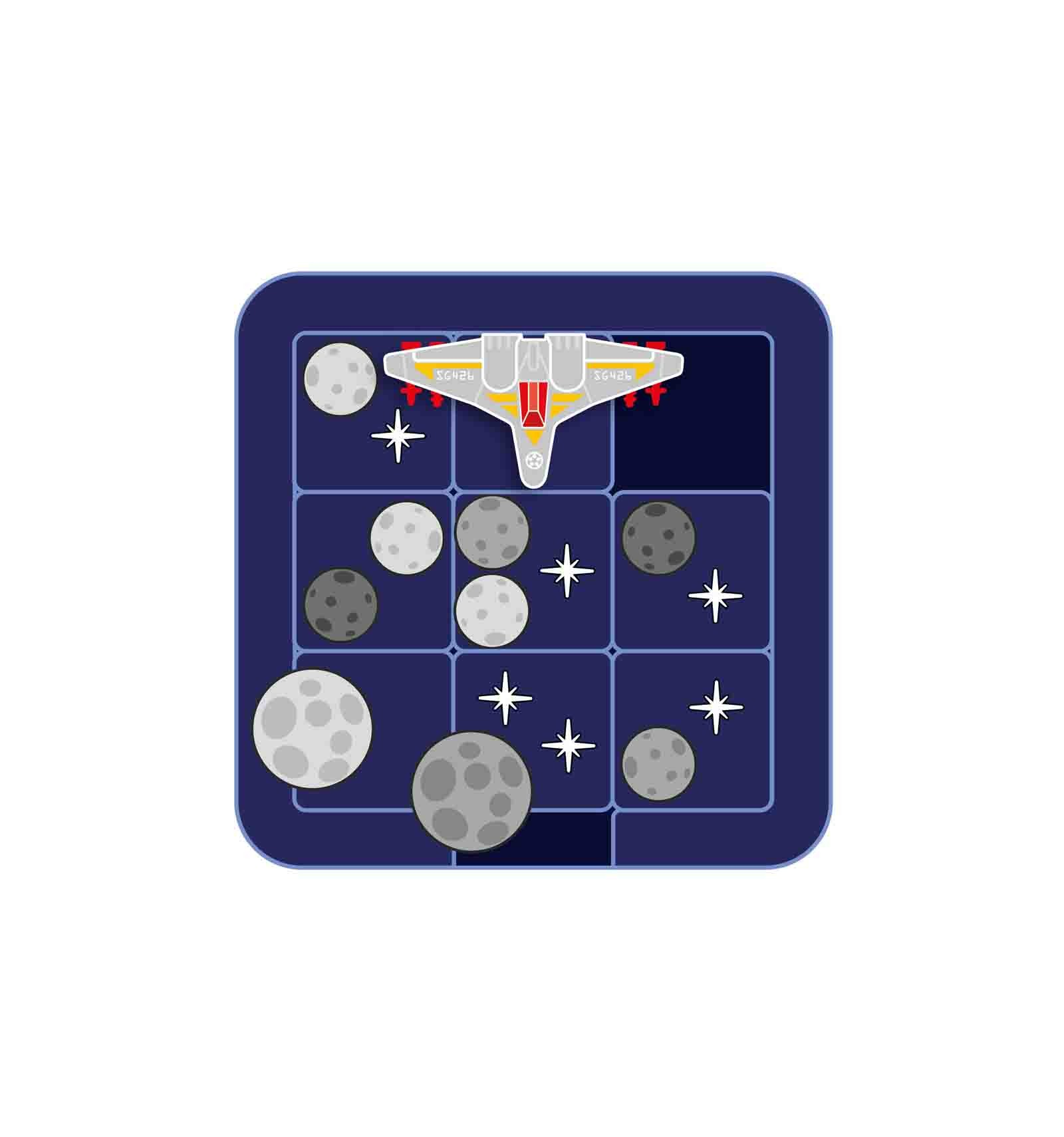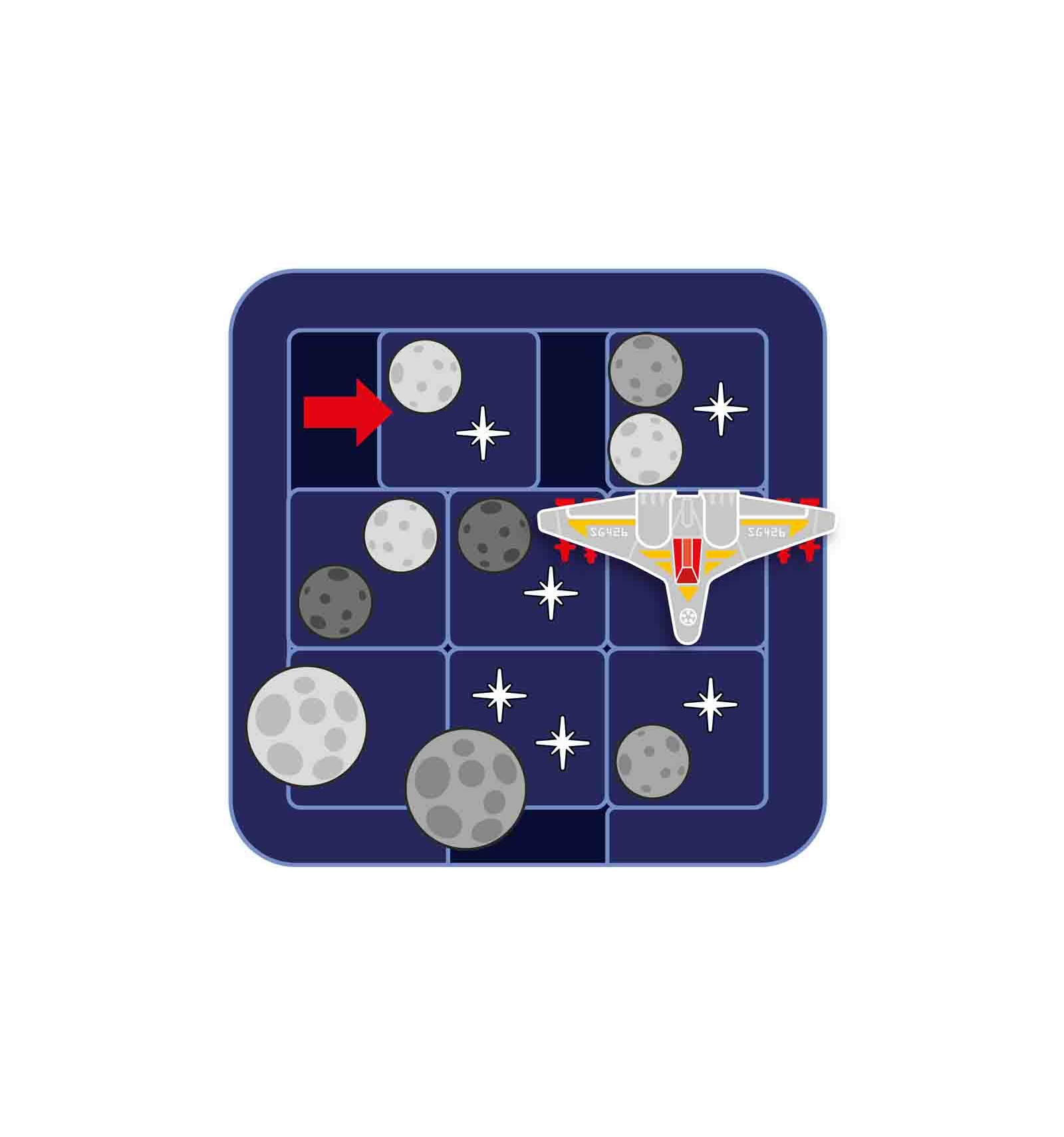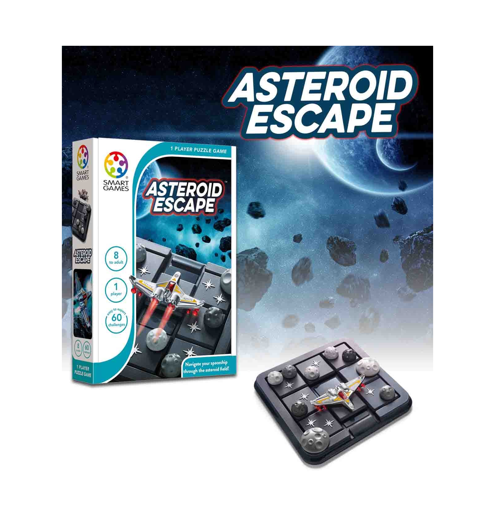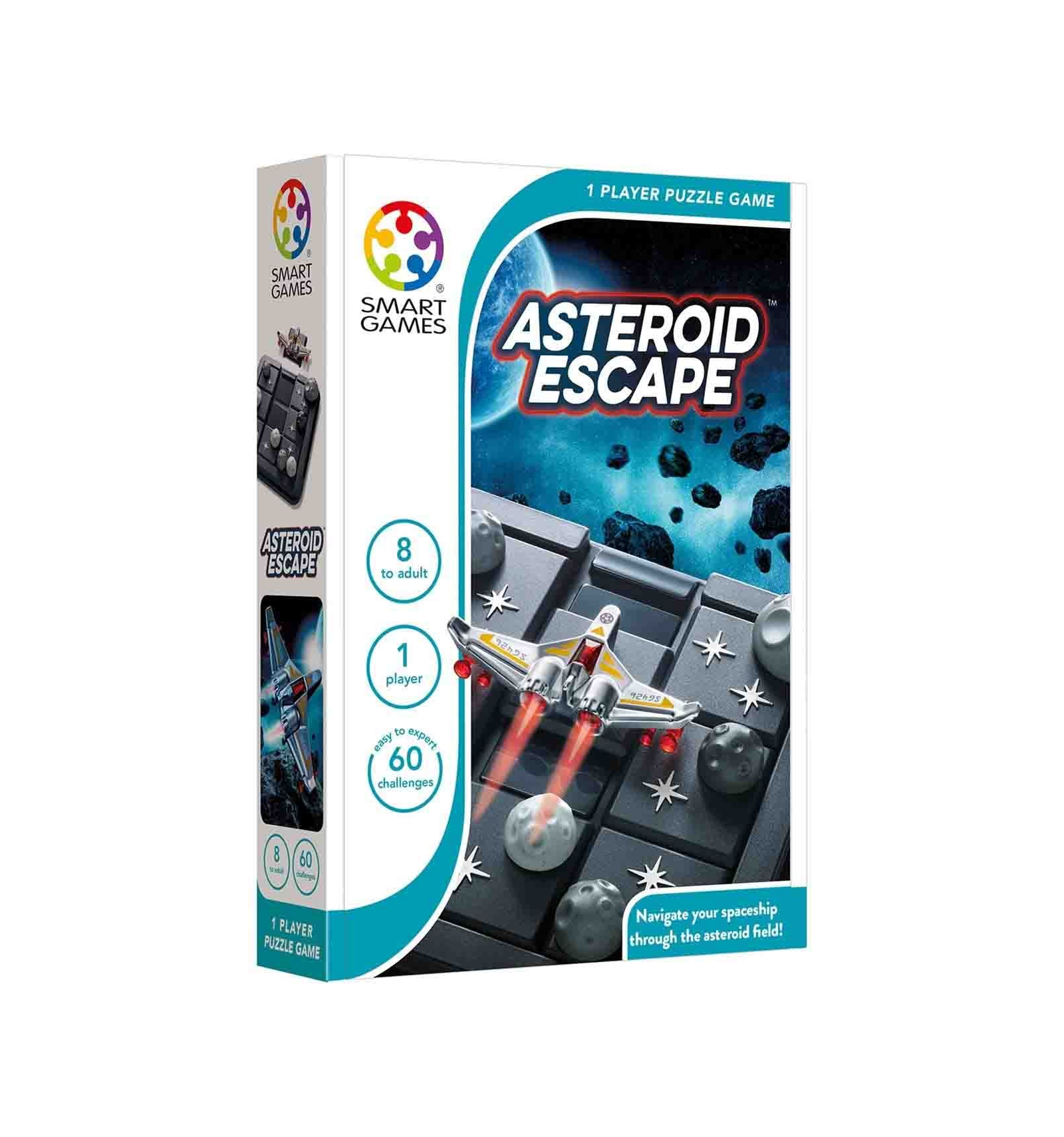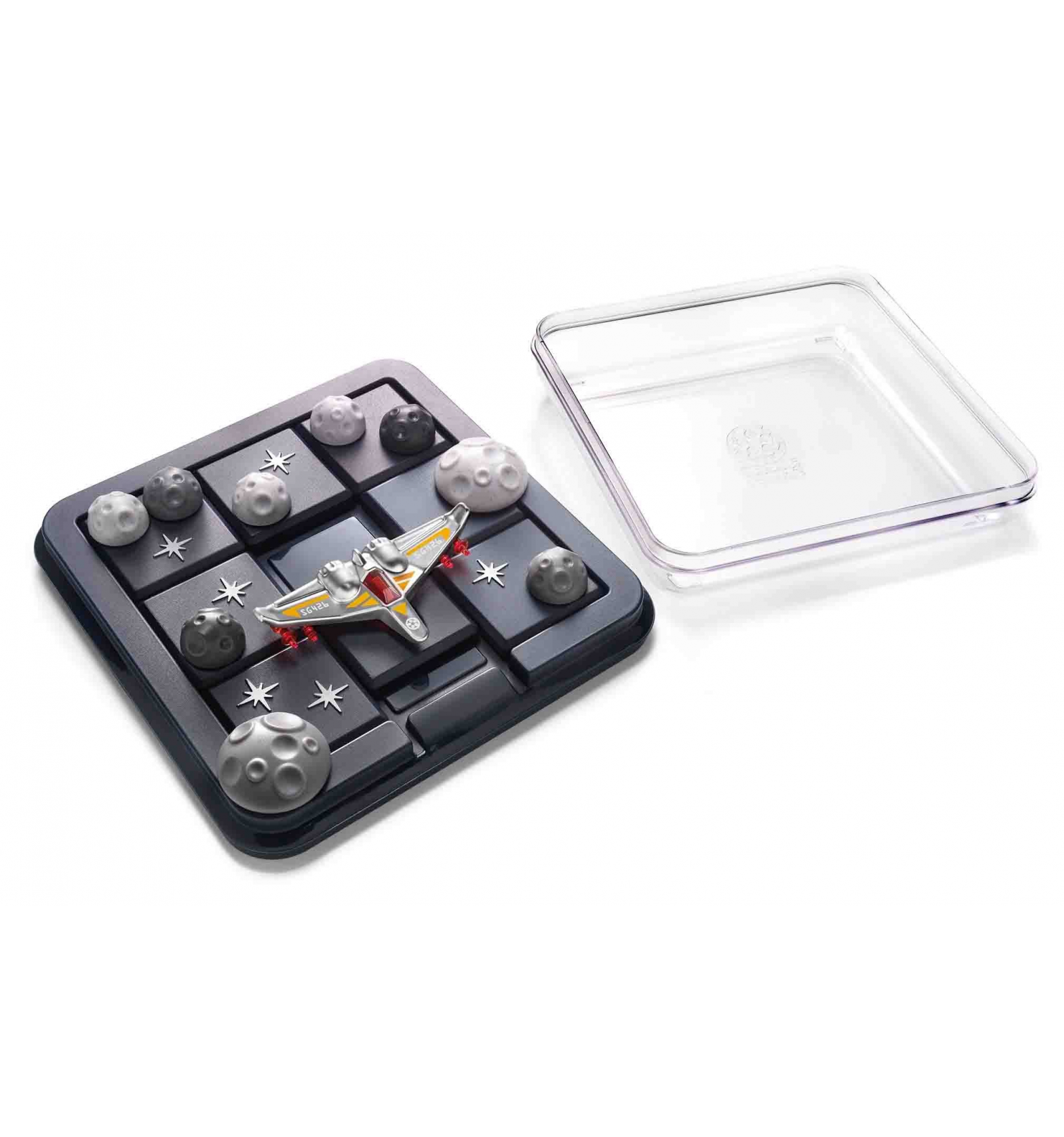 La caixa conté: un tauler de joc compacte i transportable, una nau espacial, 7 peces de puzle amb asteroides i un llibret amb 60 reptes i les solucions. p>