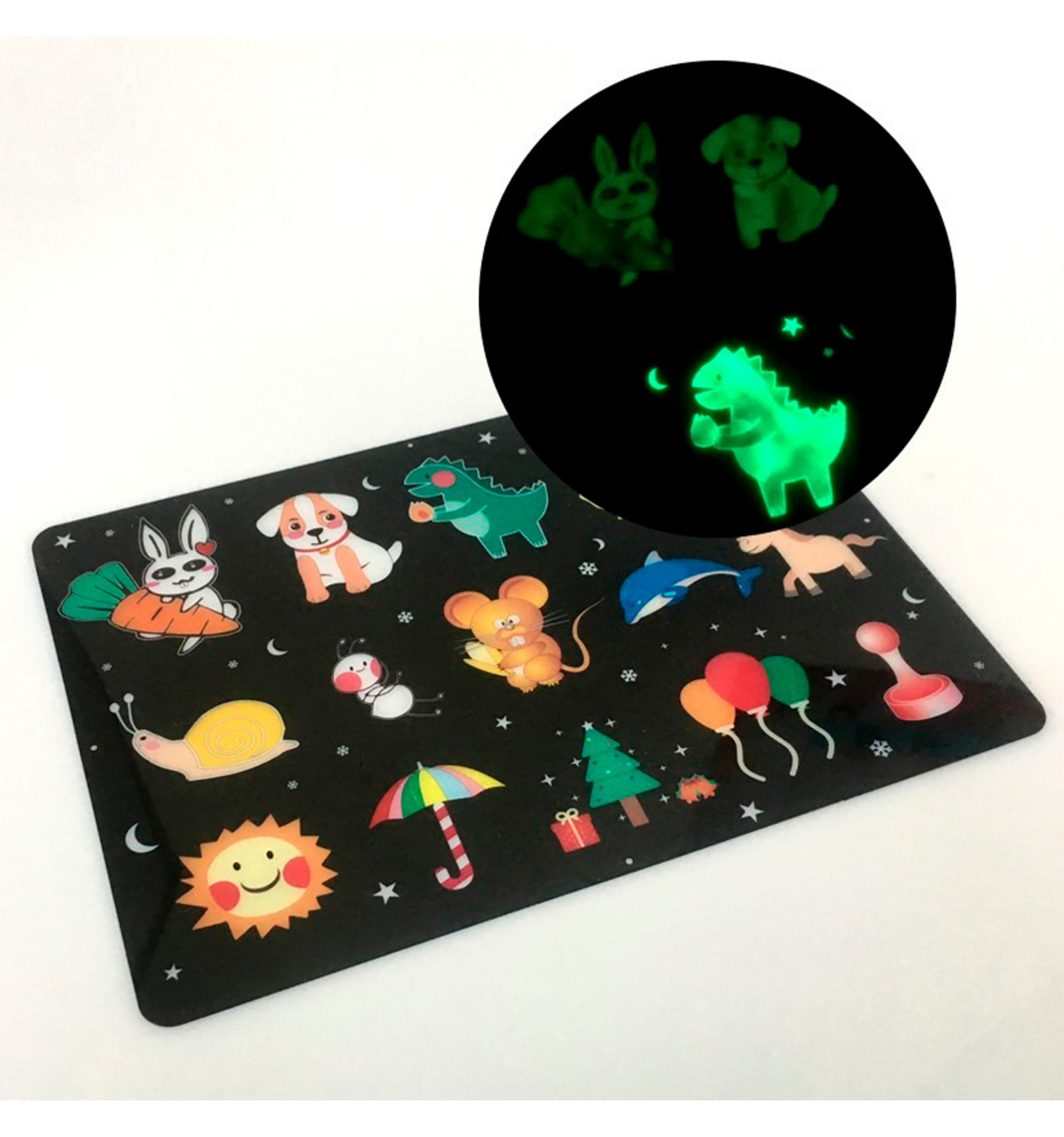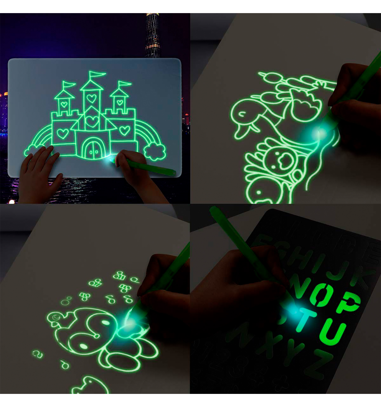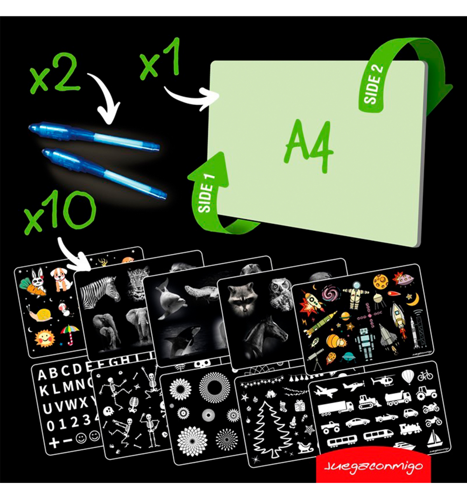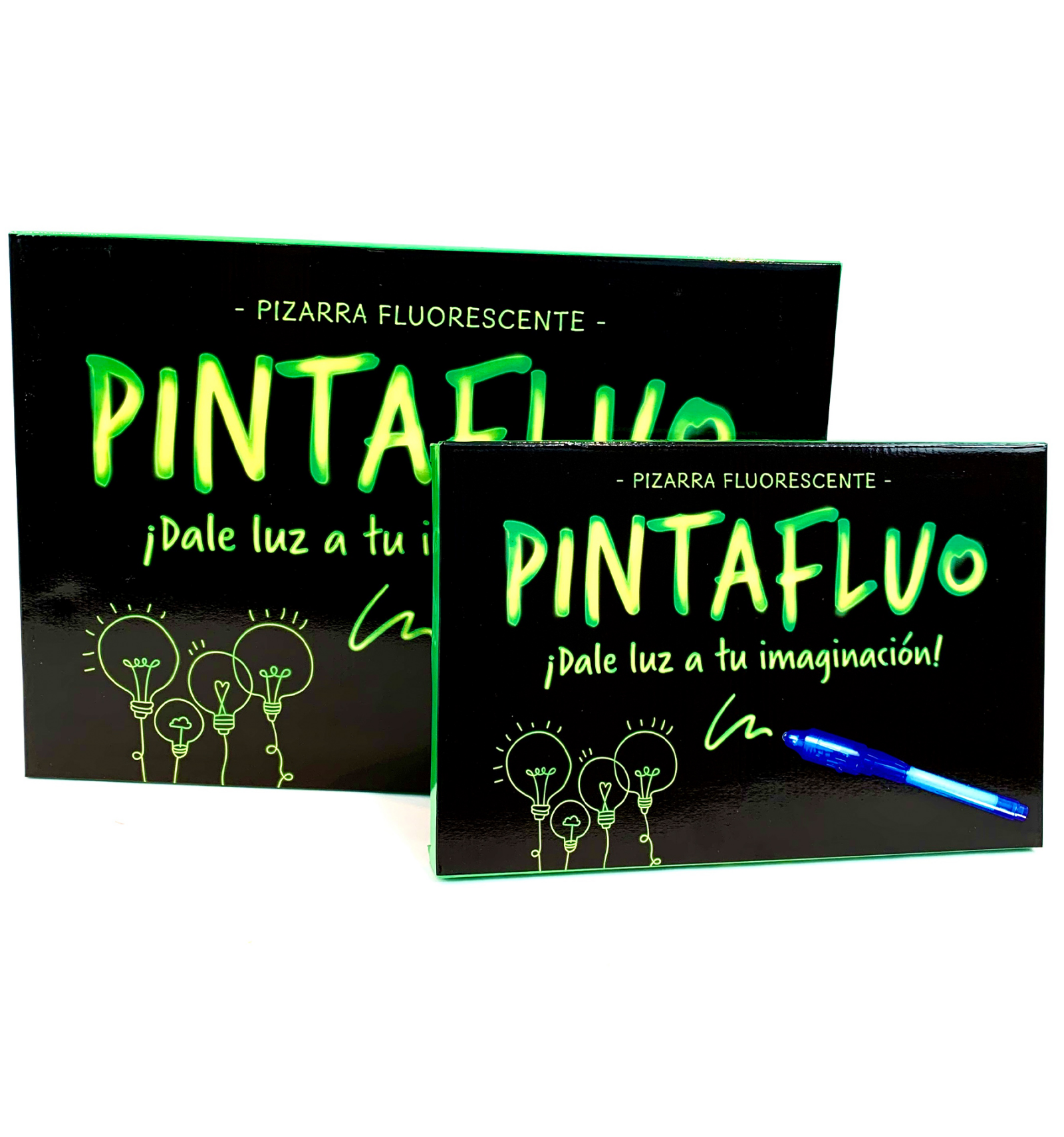 Llum verda a la imaginació i la creativitat dels nen/es. Per crear dibuixos de llum que duraran uns minuts i que es veuen en la foscor. PintaFluo és una pissarra que no taca, i es súper fàcil i divertit pintar i descobrir el missatge ocult. Ara es pot pintar per les dues cares de la pissarra. Ideal des dels 3 anys.