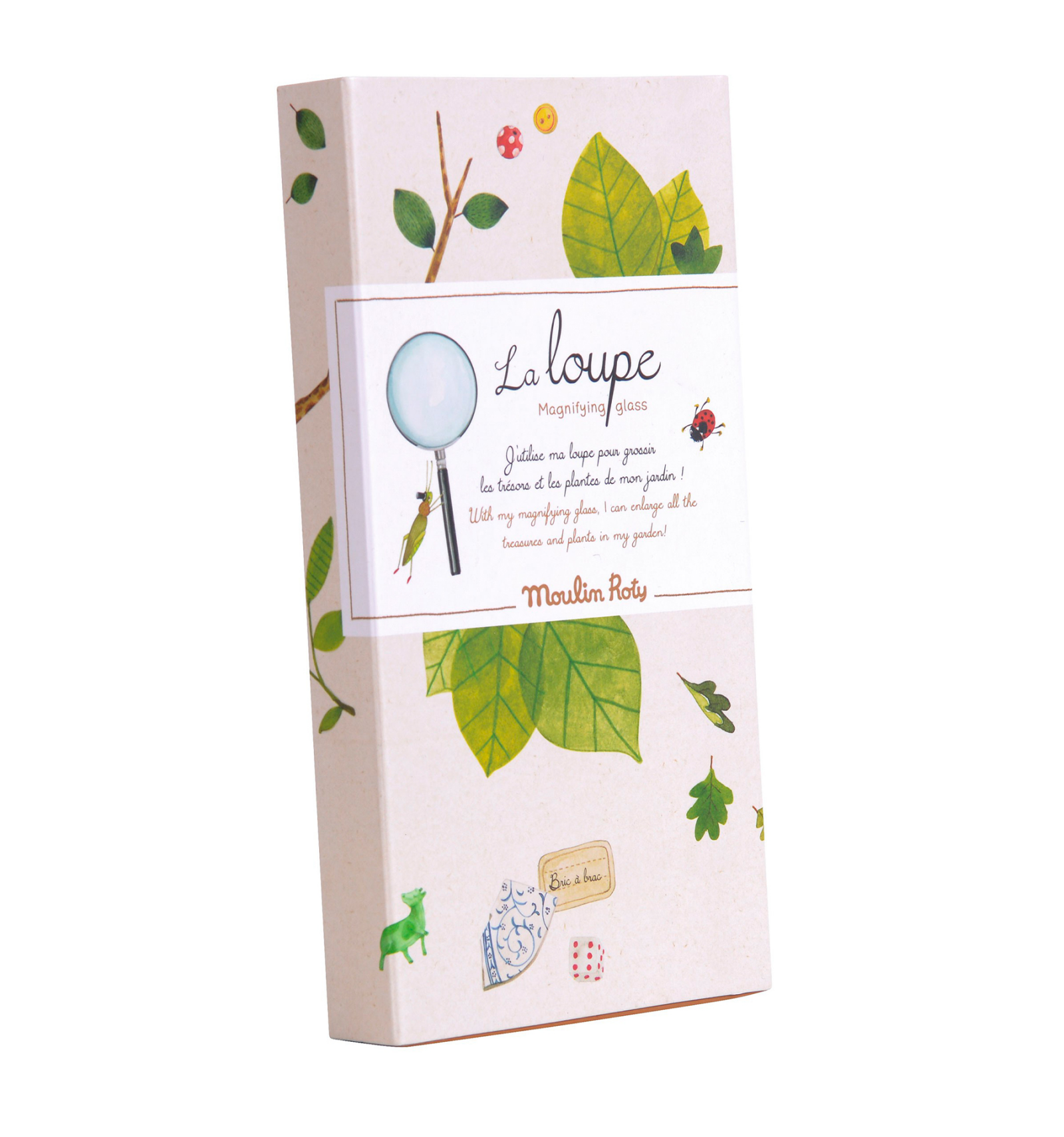 Una lupa de cristall, per a observar les diminutes meravelles de la natura. En un estoig de delicats dibuixos per a guardar-la. Un joc per a fomentar la curiositat i l'observació. Dimensions: 21,50 x 10 cm. A partir de 3 anys.