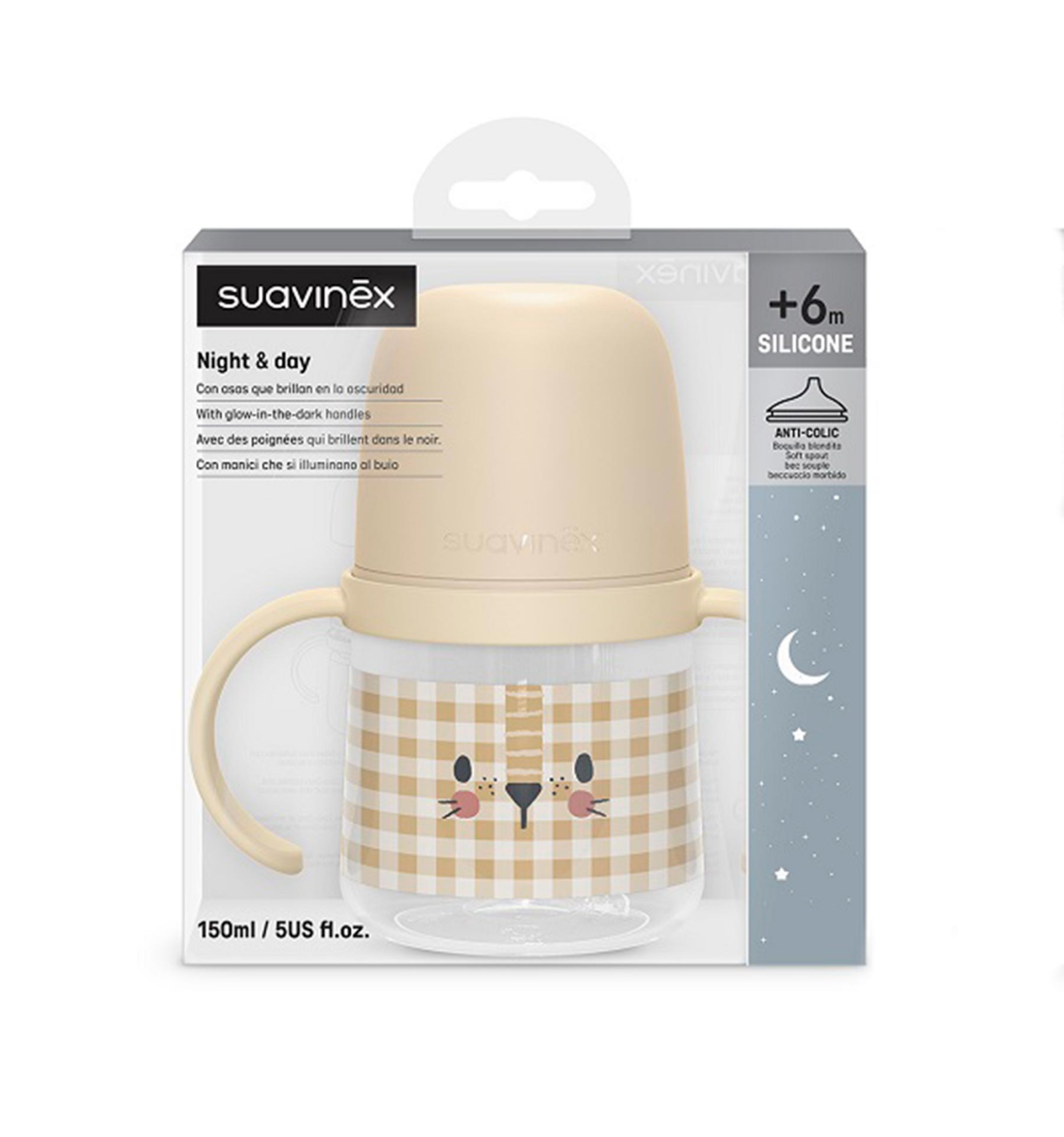Biberó d'aprenentatge amb nanses i tetina de silicona, a més, té la particularitat que les seves nanses brillen en la foscor! Ideal per als peques que estan aprenent a beure solos i també per a aquells que necessiten beure aigua durant la nit sense necessitat d'encendre la llum. Una solució pràctica i divertida!