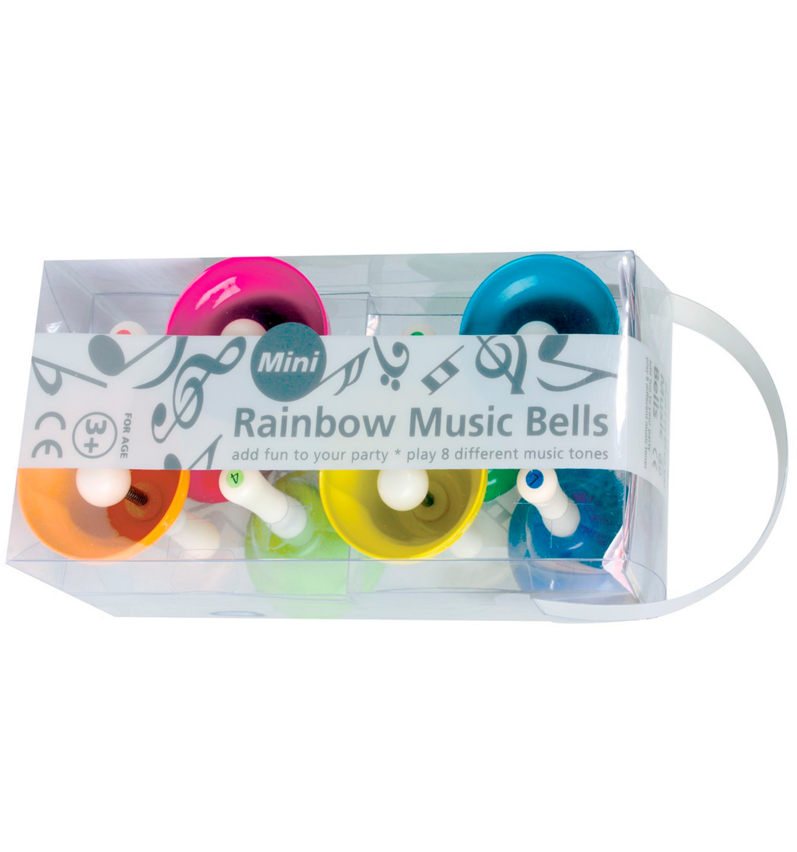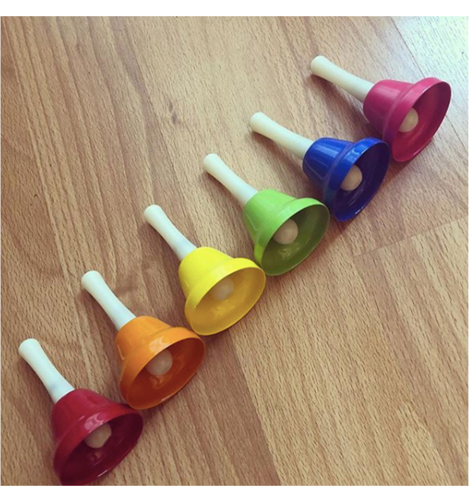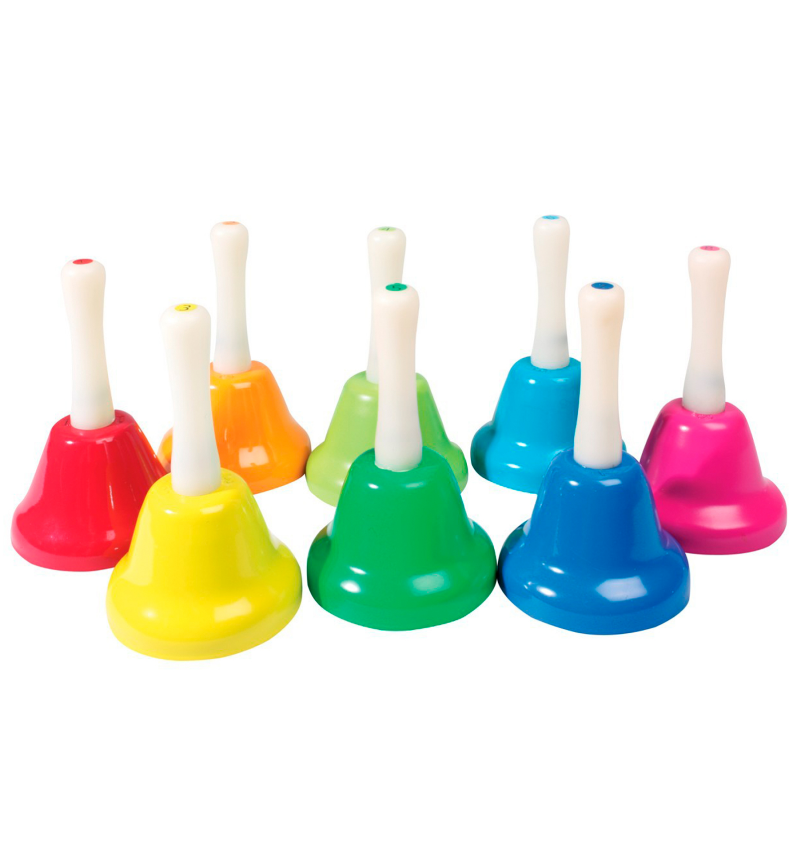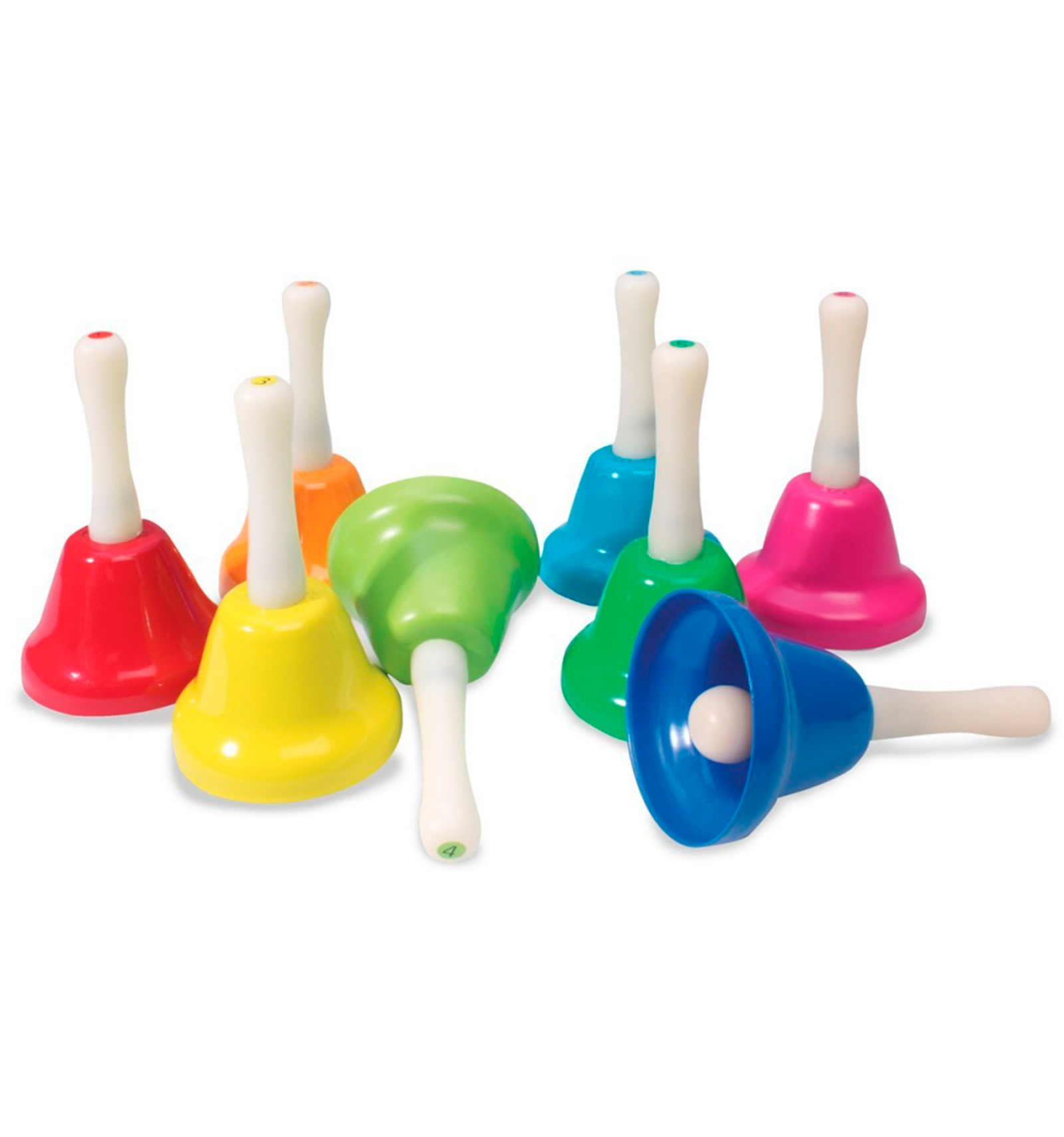 Ding, ding! Set de 8 campanes de diferents colors, cadascuna amb la seva nota musical en l'escala de Do Major. Inspirades en el mètode Montessori, permeten desenvolupar la capacitat auditiva, experimentar amb el so, crear diferents melodies, expressar-se musicalment,... Porta un llibret amb cançons per a tocar seguint els colors o els números.