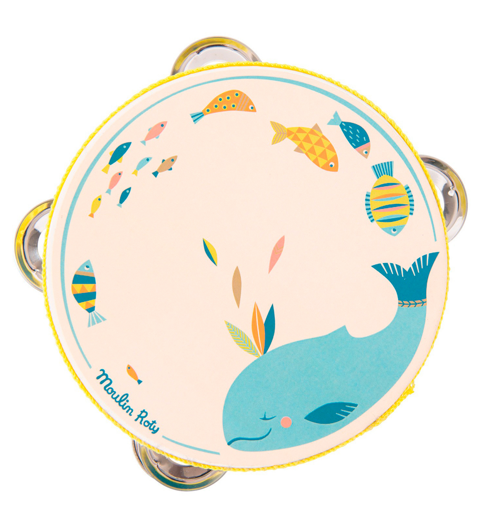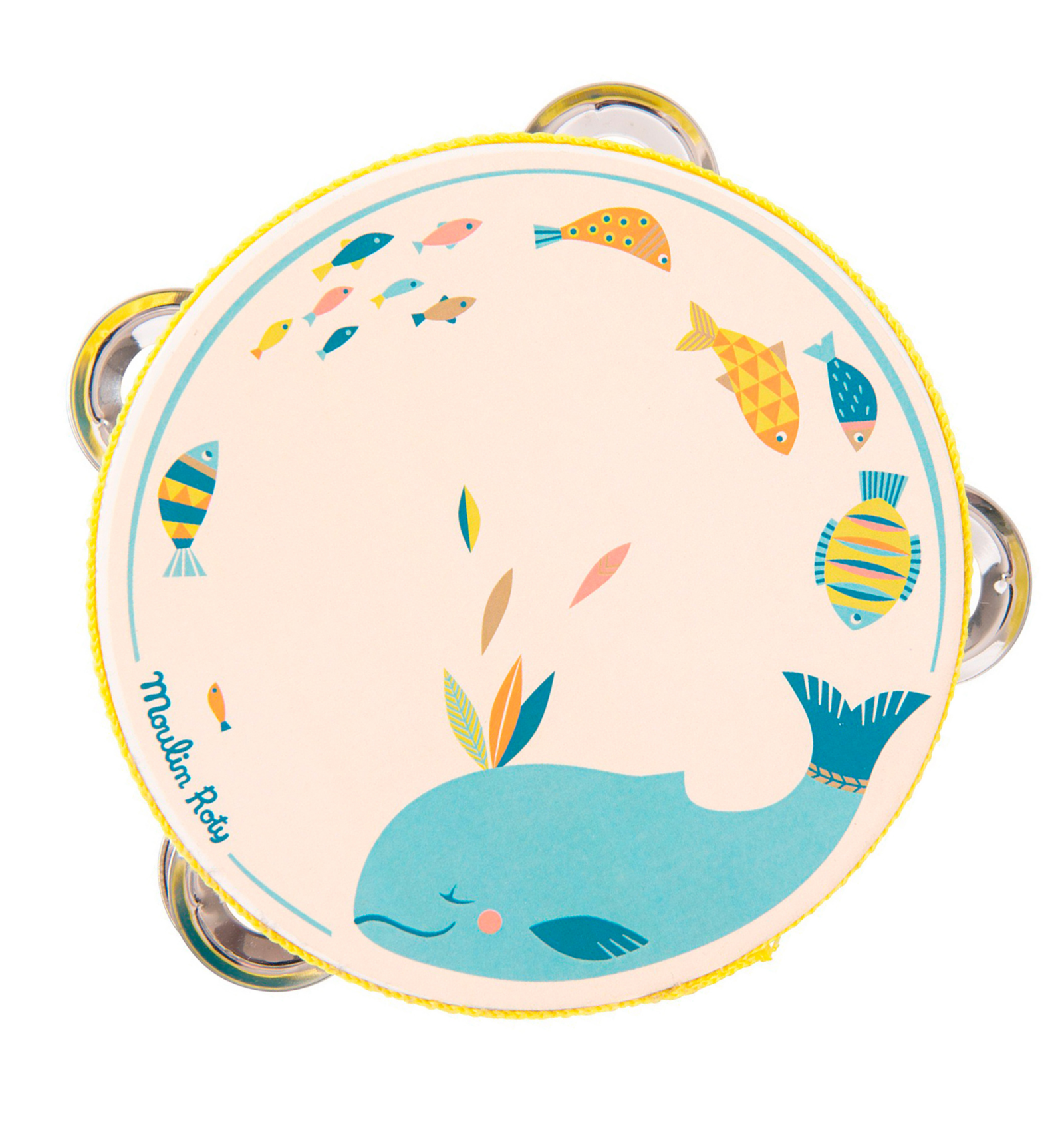 Pica-li amb ritme! Pandereta bellament il·lustrada amb la balena de la col·lecció de "El viatge d'Olga" de Moulin Roty. Per a desenvolupar el sentit musical i l'amor per la música. Feta de fusta, metall i plàstic. Dimensions: 14,5 cm. A partir de 2 anys.
