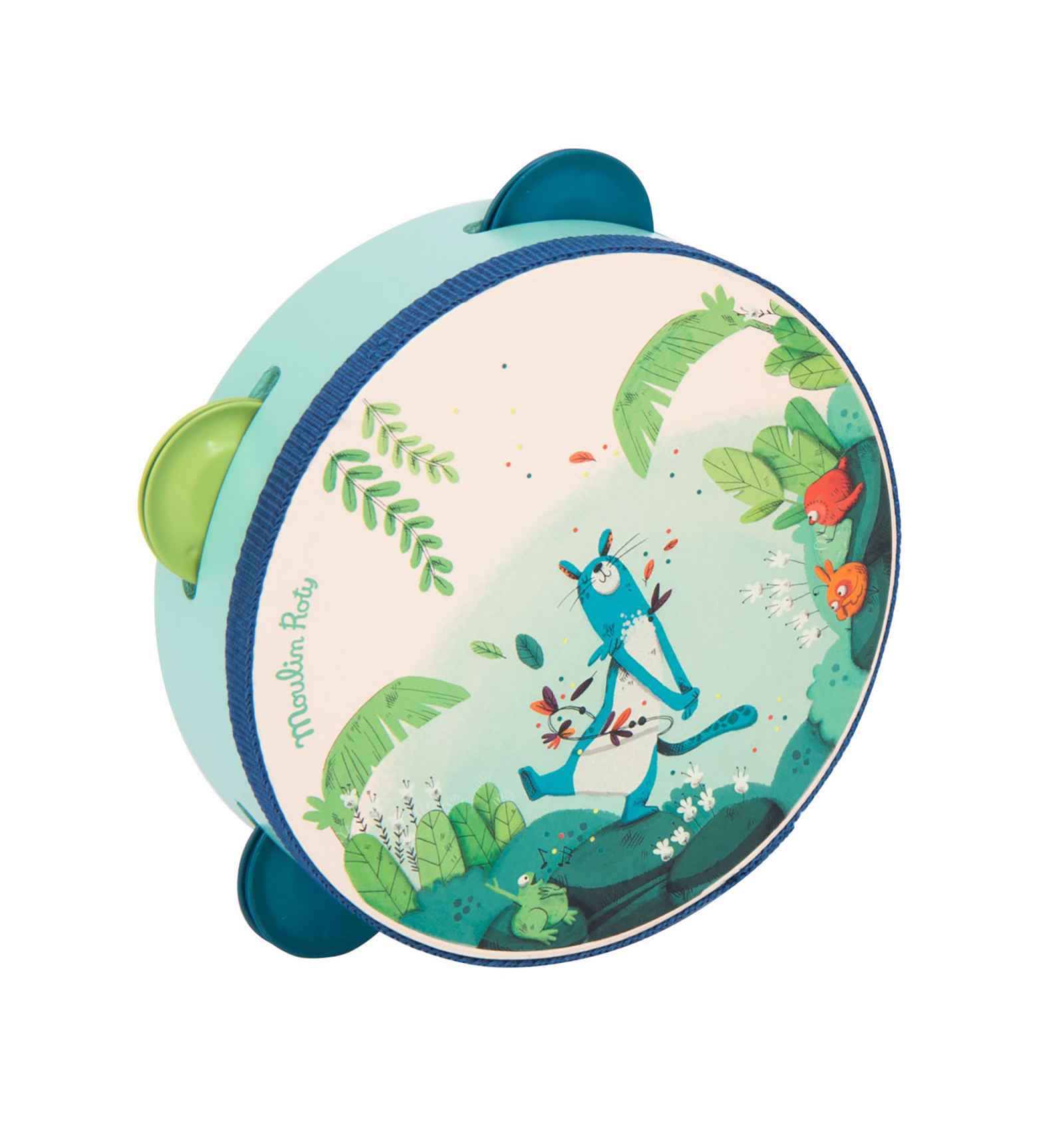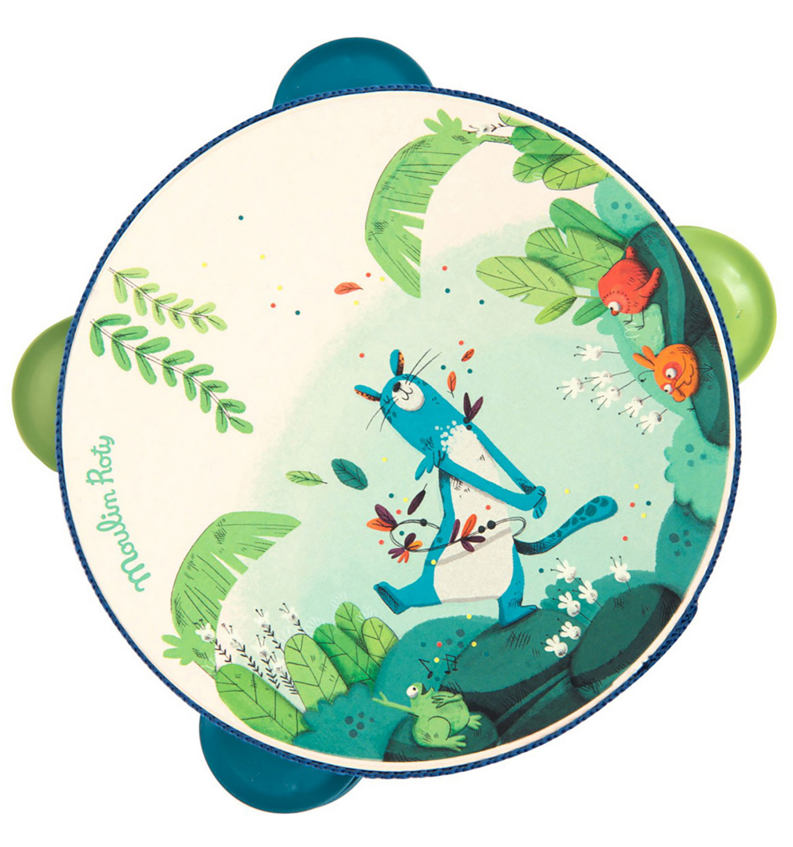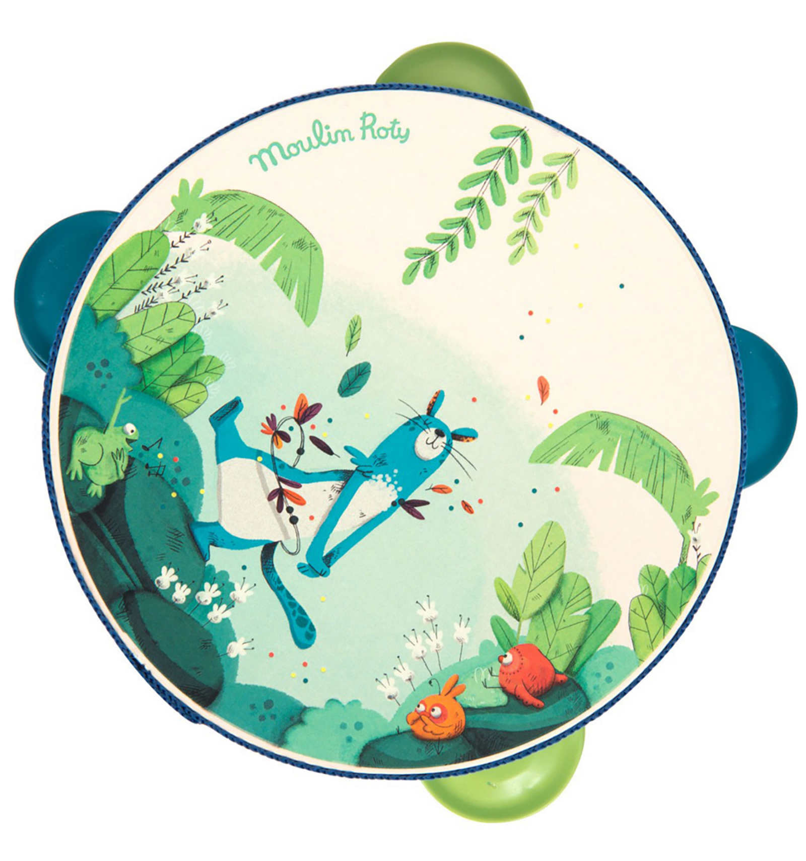 Pica-li amb ritme! Pandereta bellament il·lustrada amb la pantera Zimba i els pollets de "La Jungla" de Moulin Roty. Per a desenvolupar el sentit musical i l'amor per la música. Feta de fusta, metall i plàstic. Amb 4 platerets i una cinta que protegeix la vora. Dimensions: 14,5 cm. A partir de 2 anys.