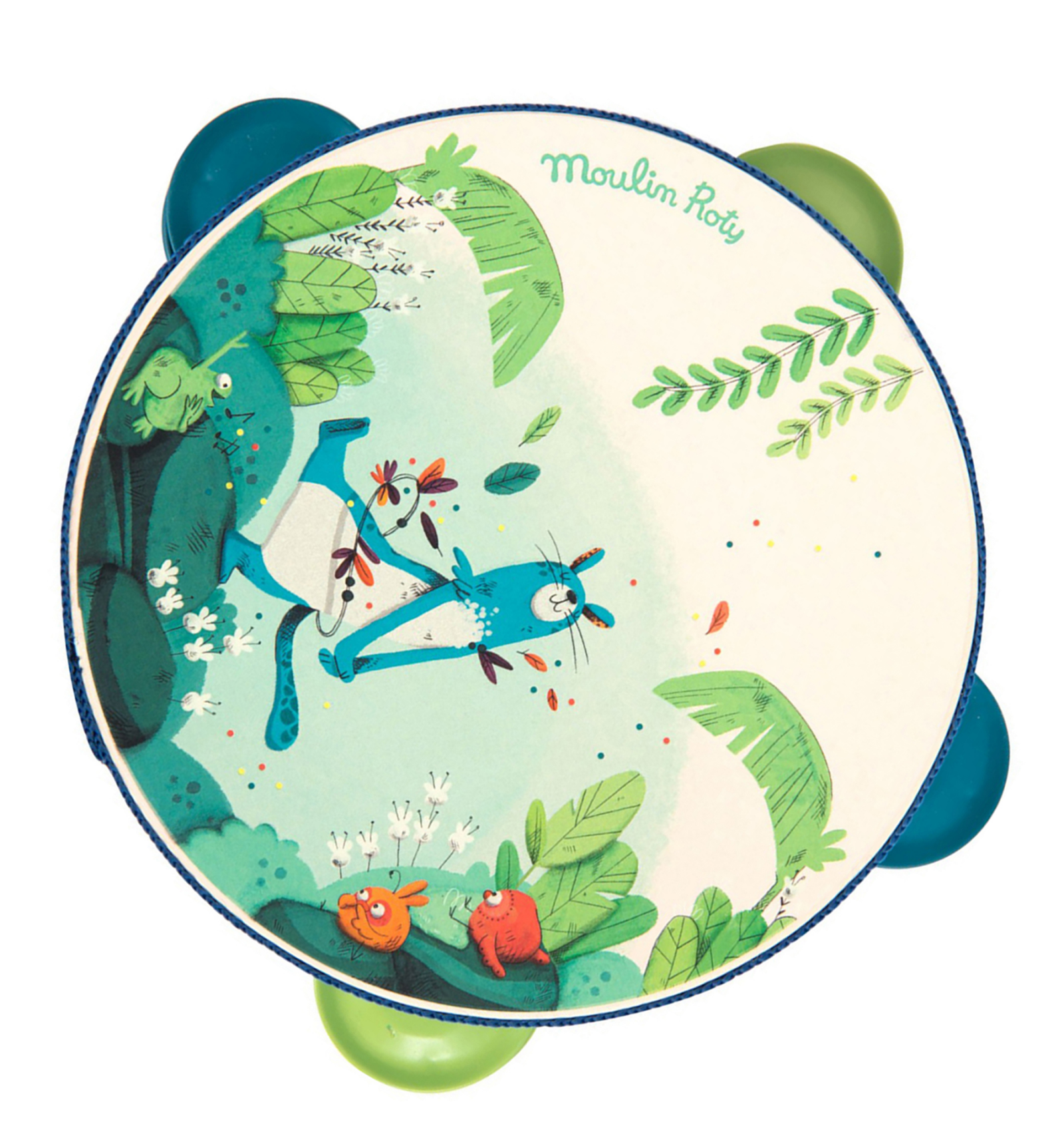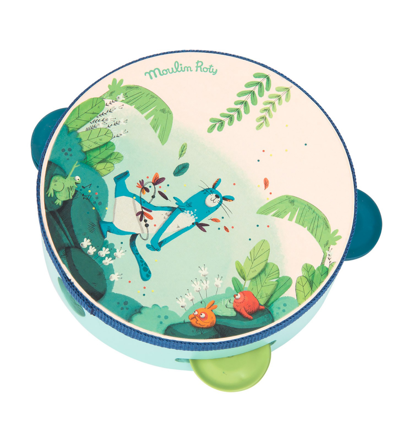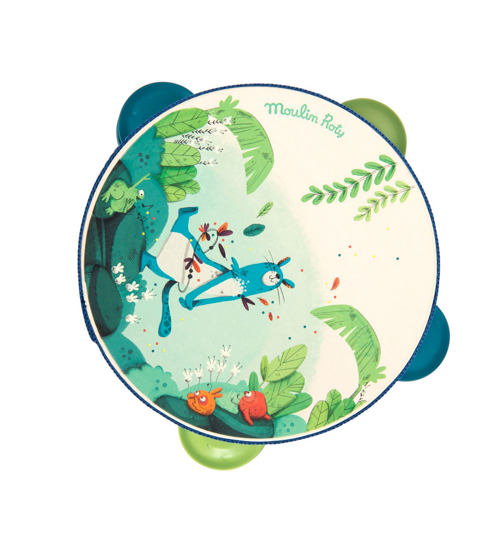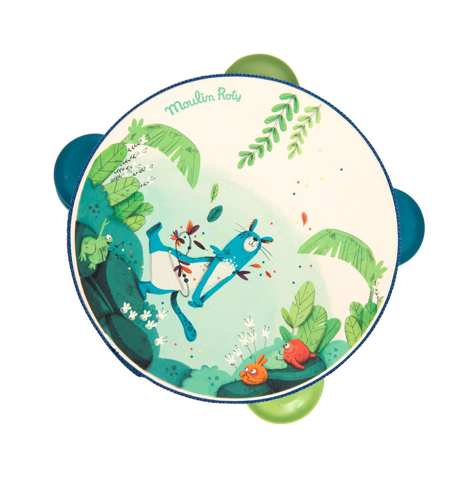 Pica-li amb ritme! Pandereta bellament il·lustrada amb la pantera Zimba i els pollets de "La Jungla" de Moulin Roty. Per a desenvolupar el sentit musical i l'amor per la música. Feta de fusta, metall i plàstic. Amb 4 platerets i una cinta que protegeix la vora. Dimensions: 14,5 cm. A partir de 2 anys.
