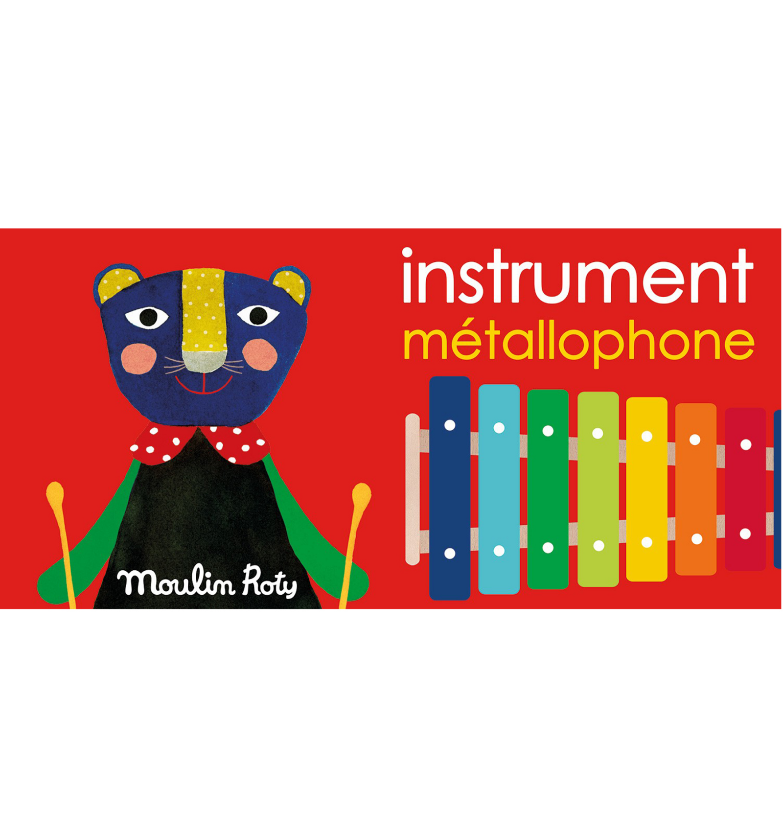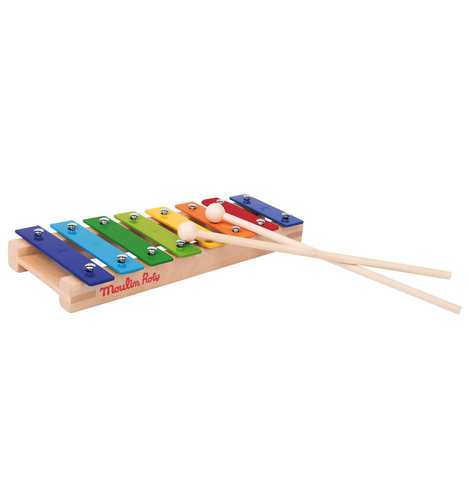 Do, re, mi... Xilòfon amb plaques metàl·liques sobre base de fusta. Un dels millors instruments per a començar a desenvolupar el sentit musical. Inclou baquetes i partitures. Dimensions 19,5 x 18 cm. A partir de 3 anys.