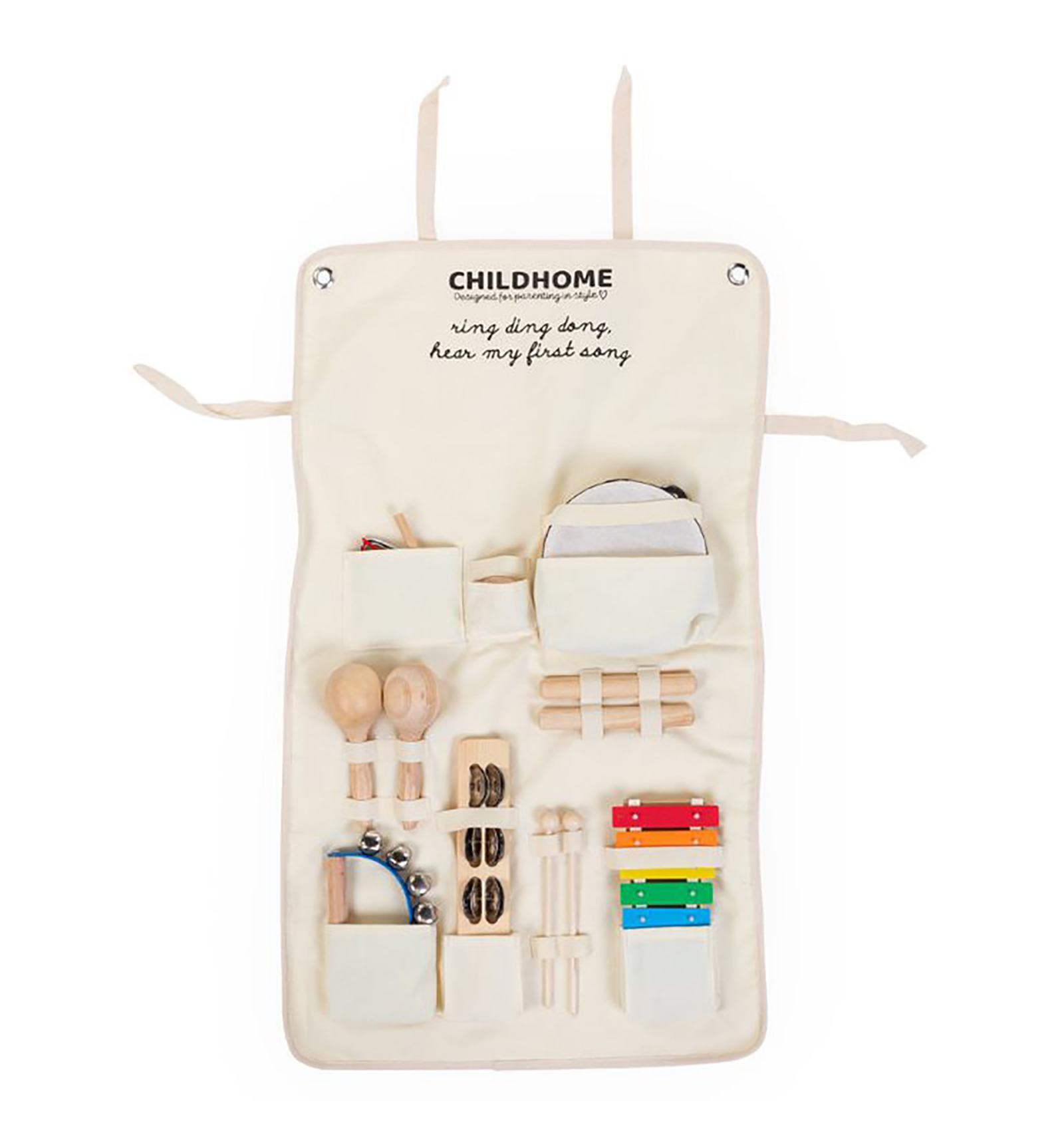 Convida al teu petit o petita a experimentar lliurement amb la música amb aquest set de 8 instruments. Com ve presentat en un pràctic organitzador que es penja a la paret sempre poden accedir a tots els instruments fàcilment i endreçar-los en acabar el joc.