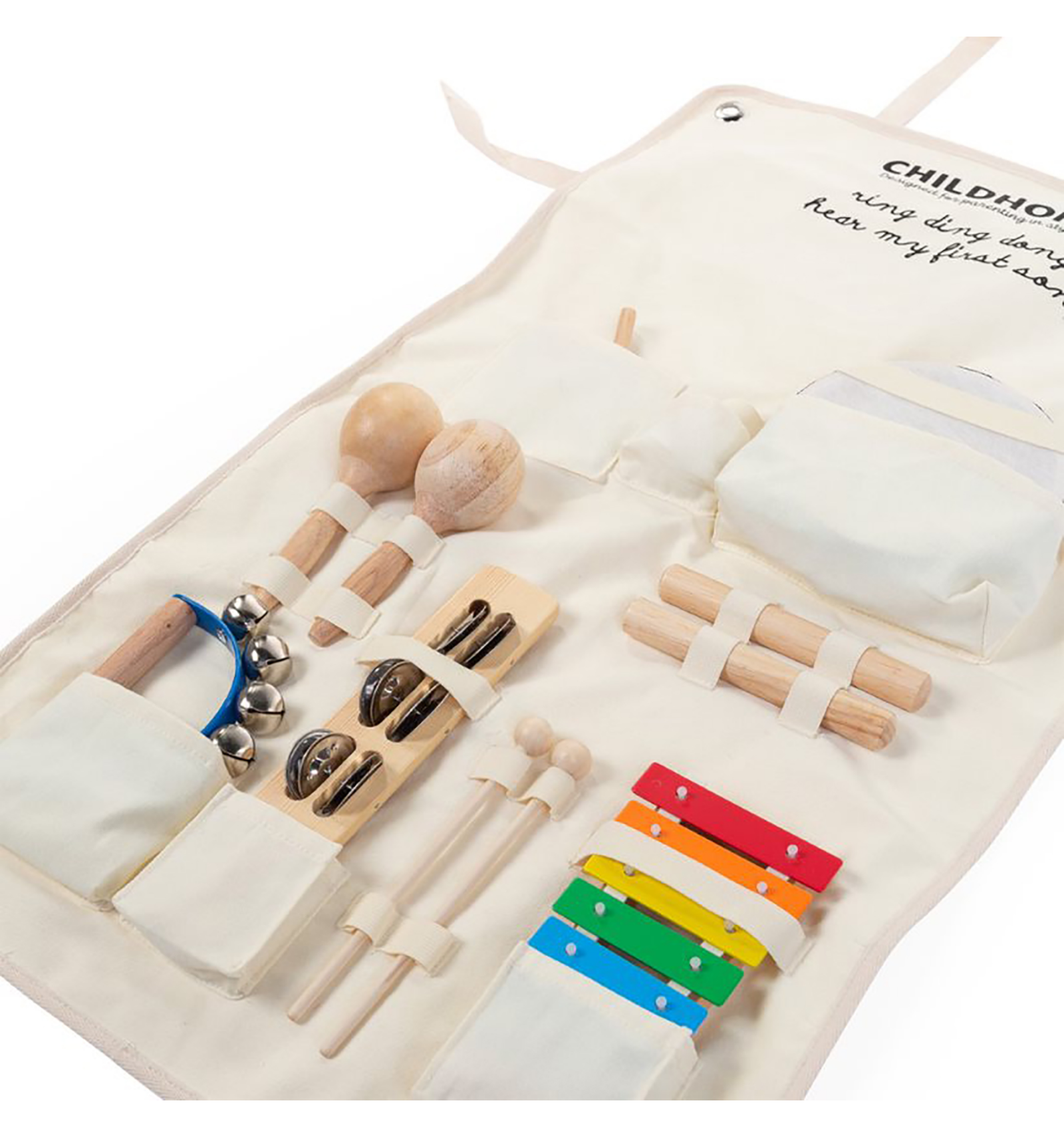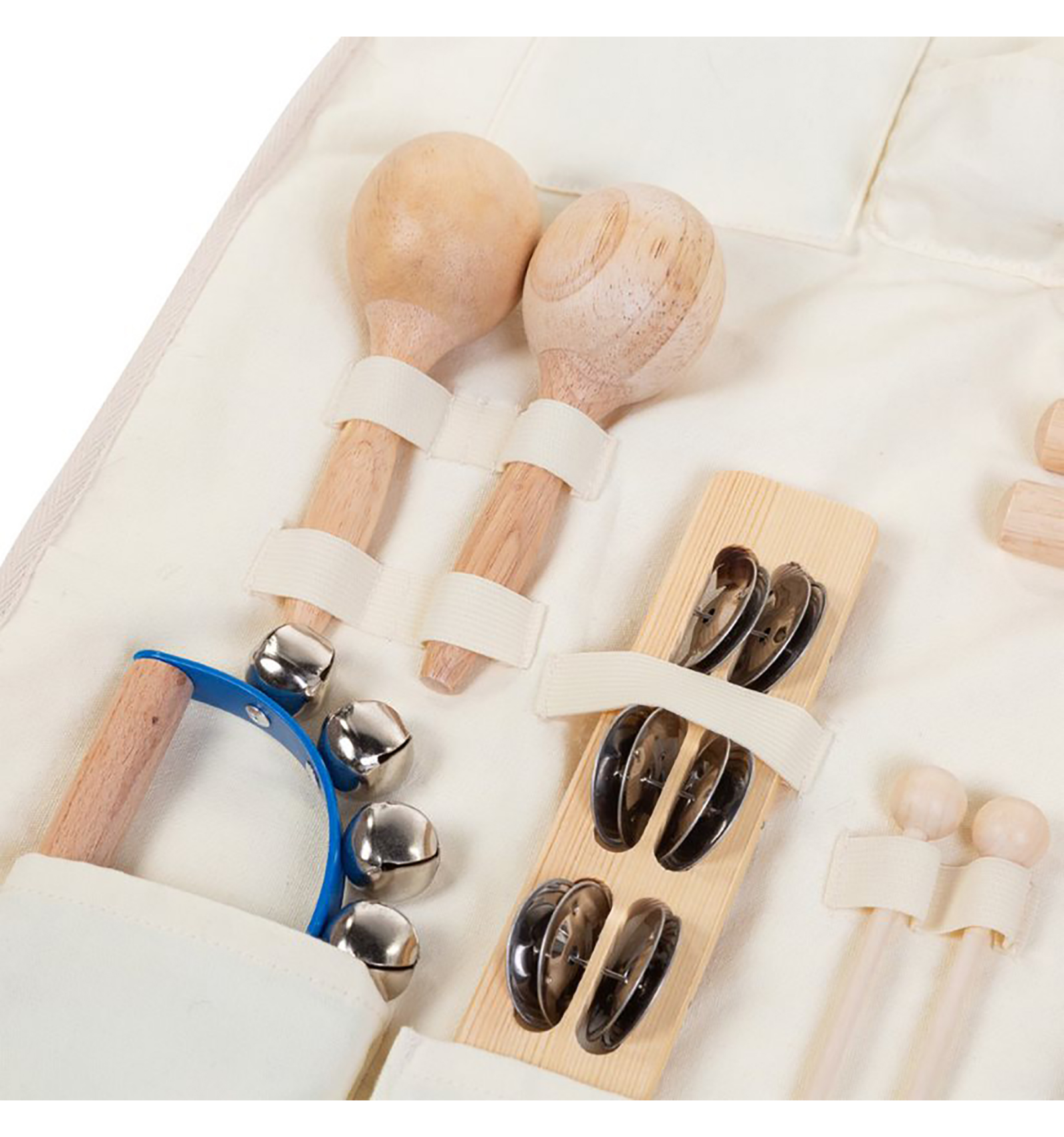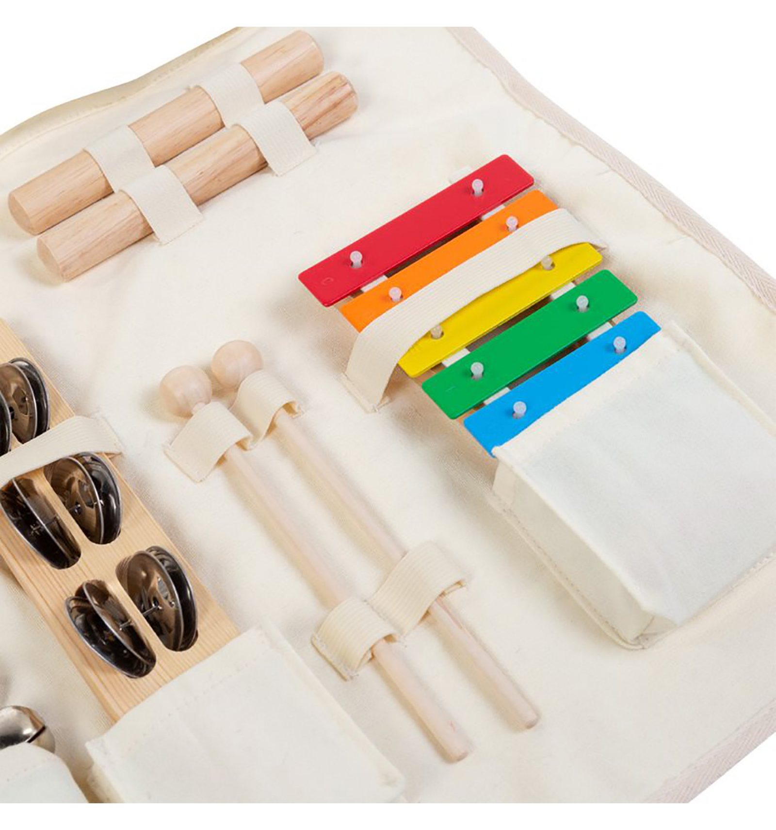 El set consta dels següents instruments: pandereta, bastons, maraques, ous batuts, xilòfon, platerets, triangle i cascavells.
