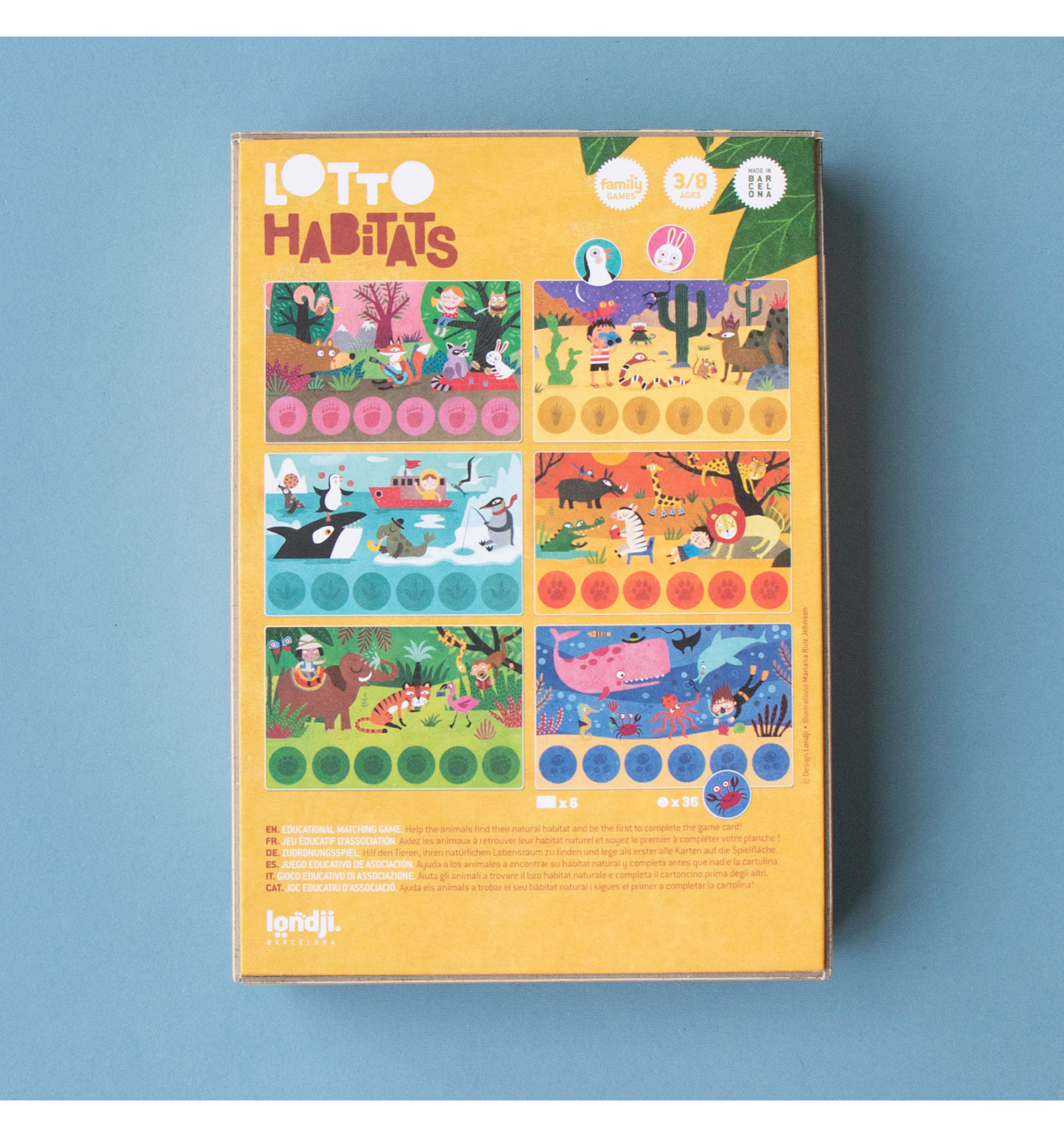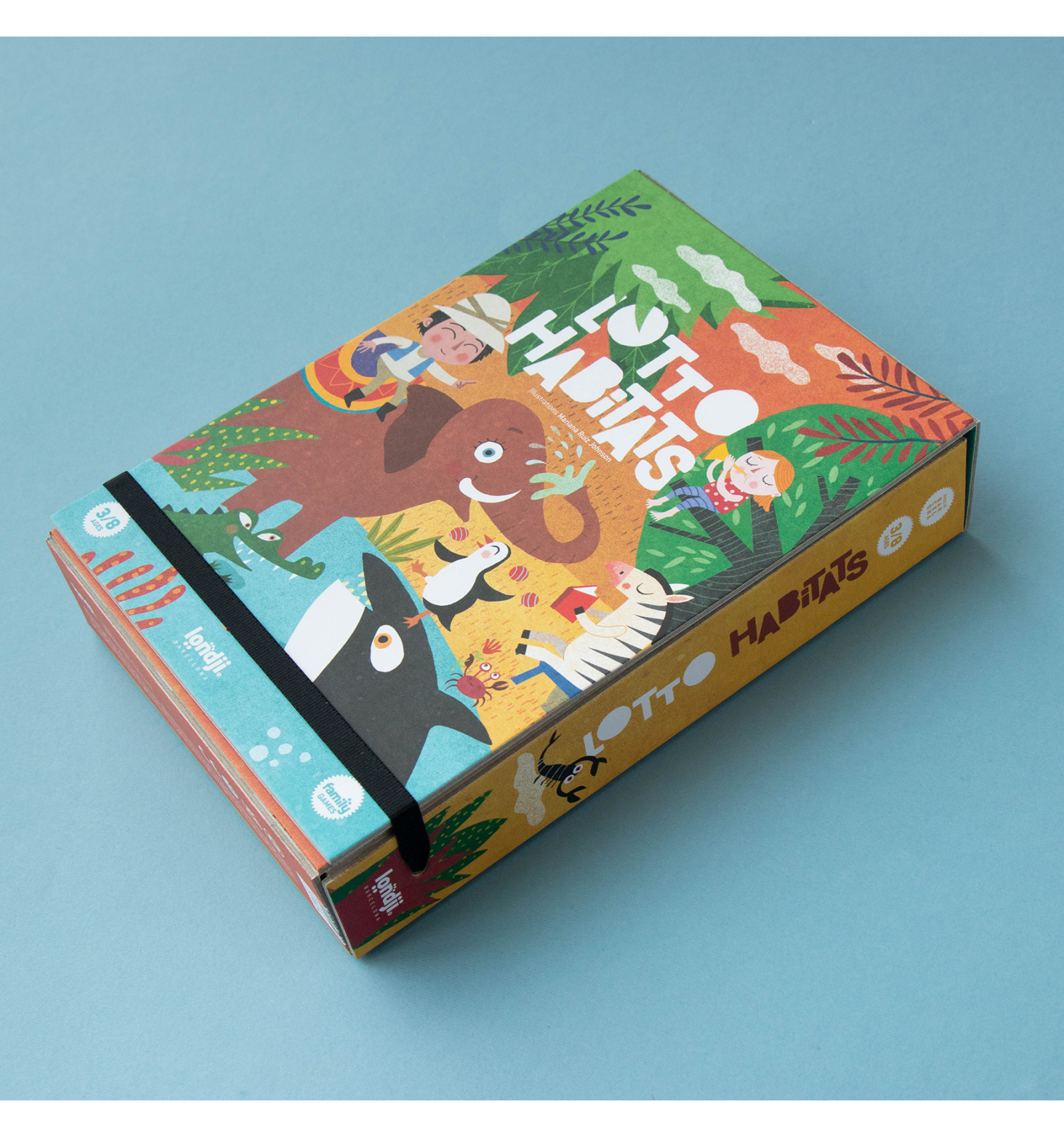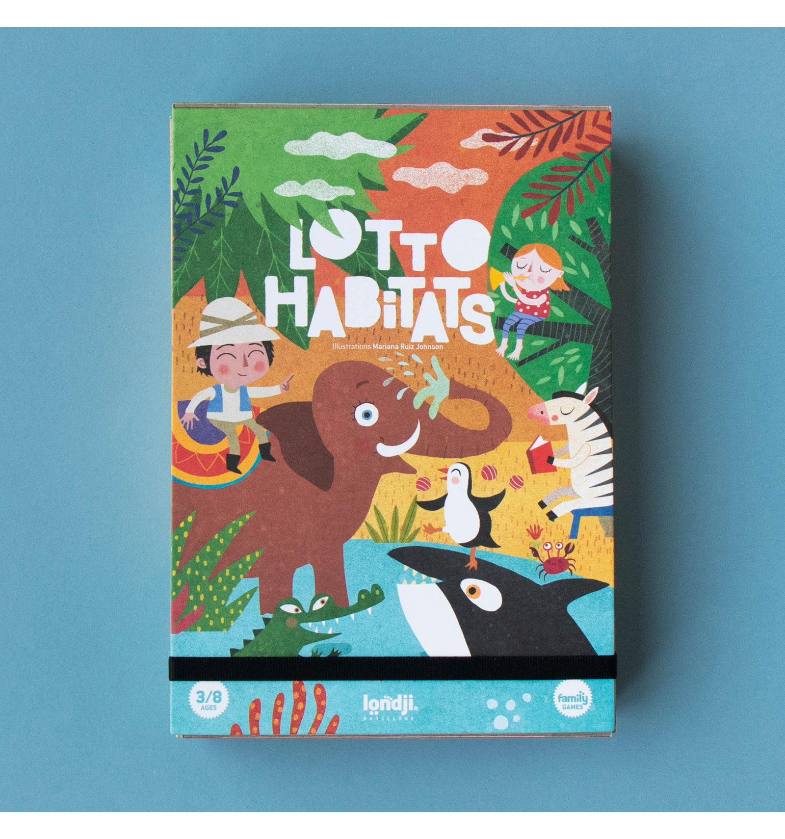 Biiiingo! L'elefant, la zebra i el pingüí han quedat per a jugar al Lotto de Londji, qui serà el primer a omplir el seu cartró? Aquesta és una versió animal del bingo, on anirem traient fitxes i qui aconsegueixi completar primer el seu cartró serà el guanyador. Per a 2 o més jugadors. A partir dels 3 anys.