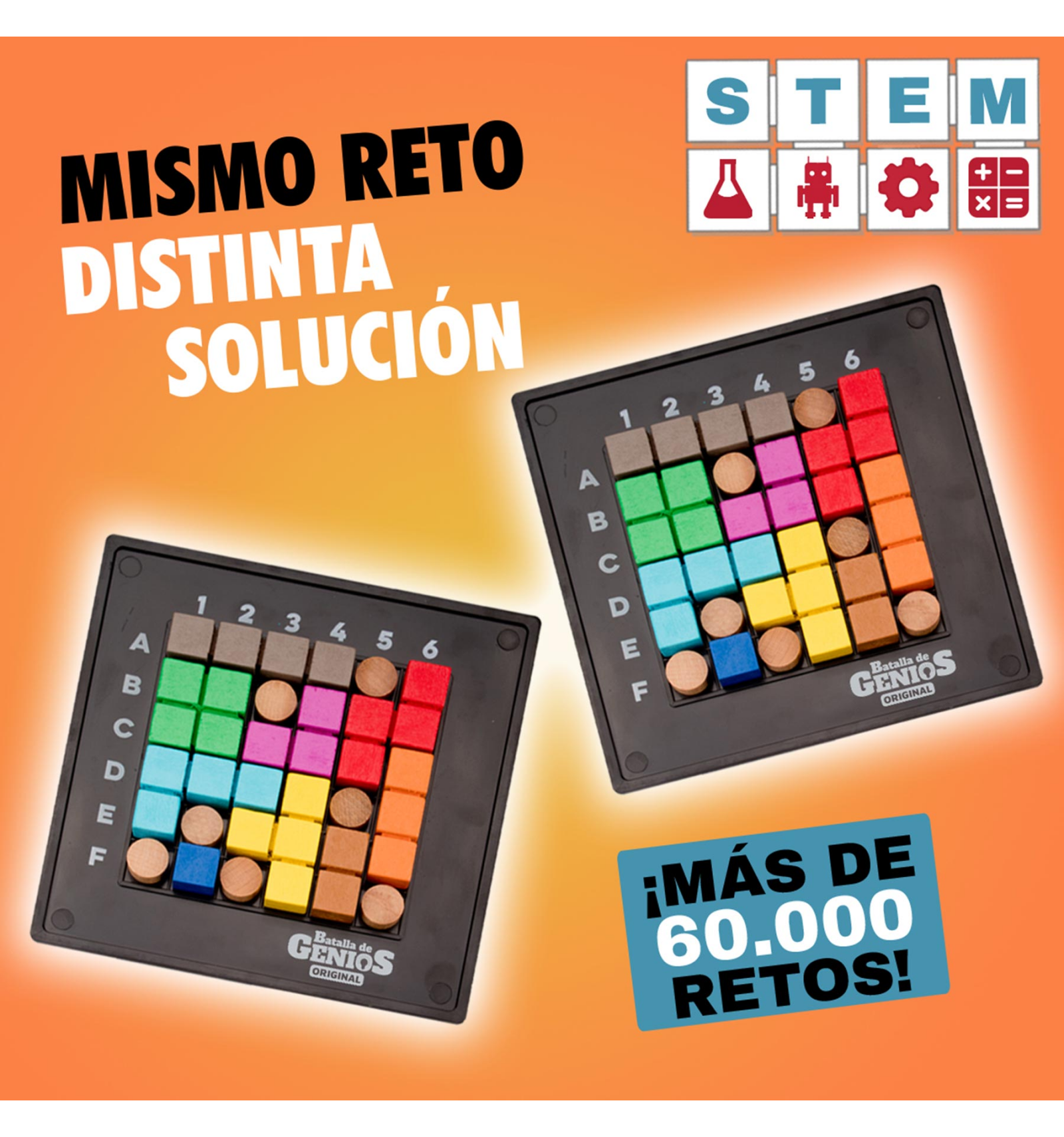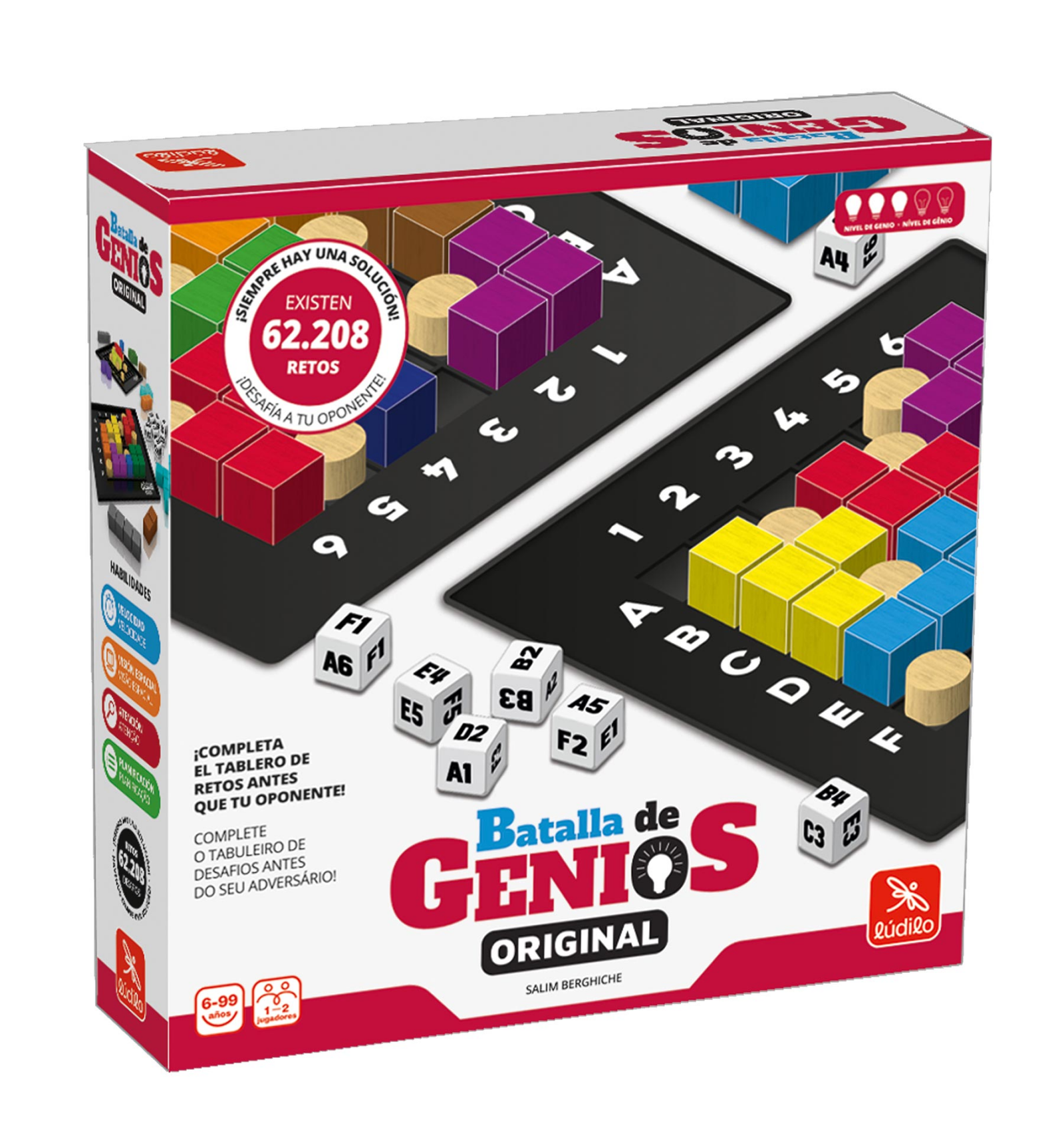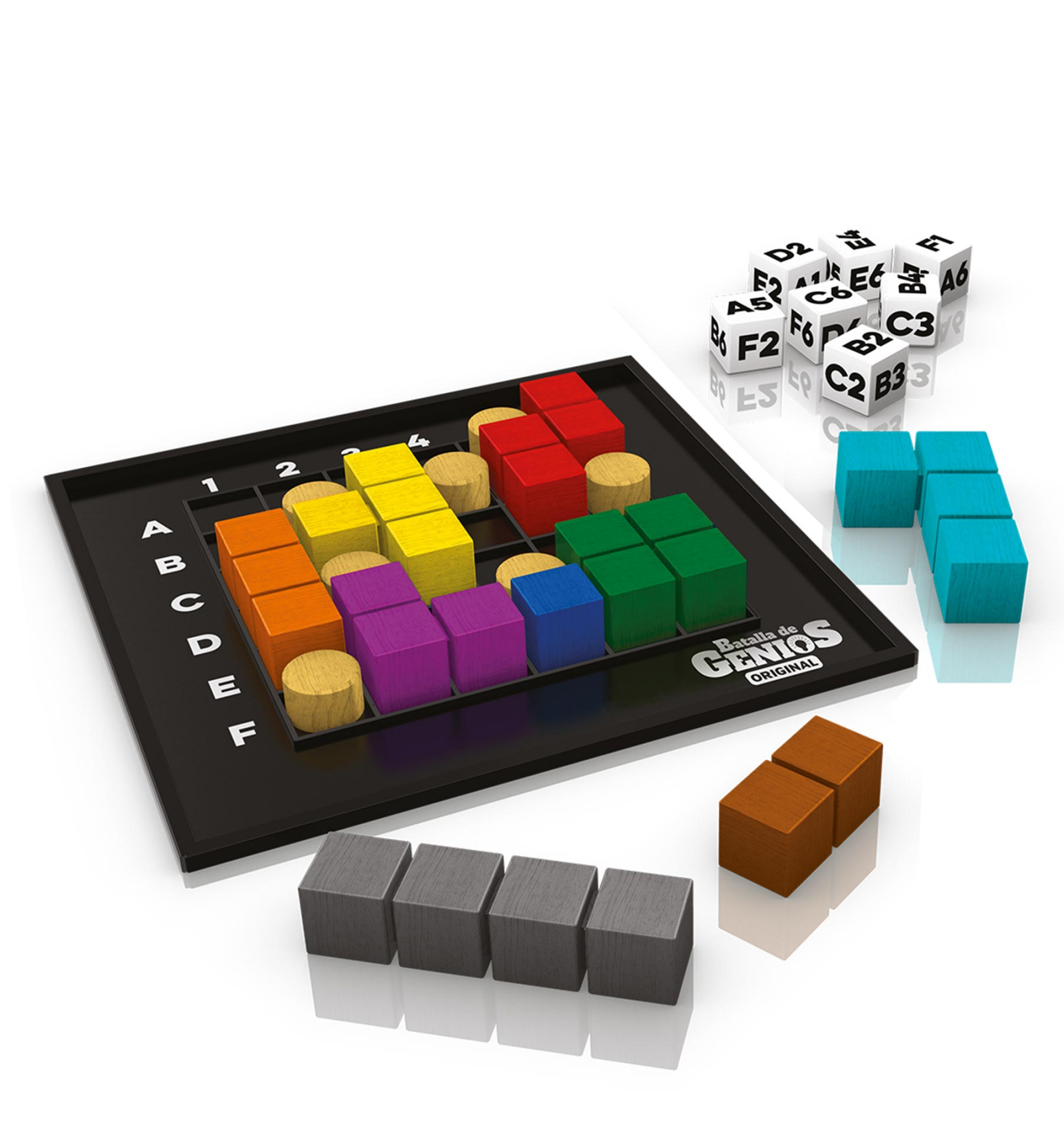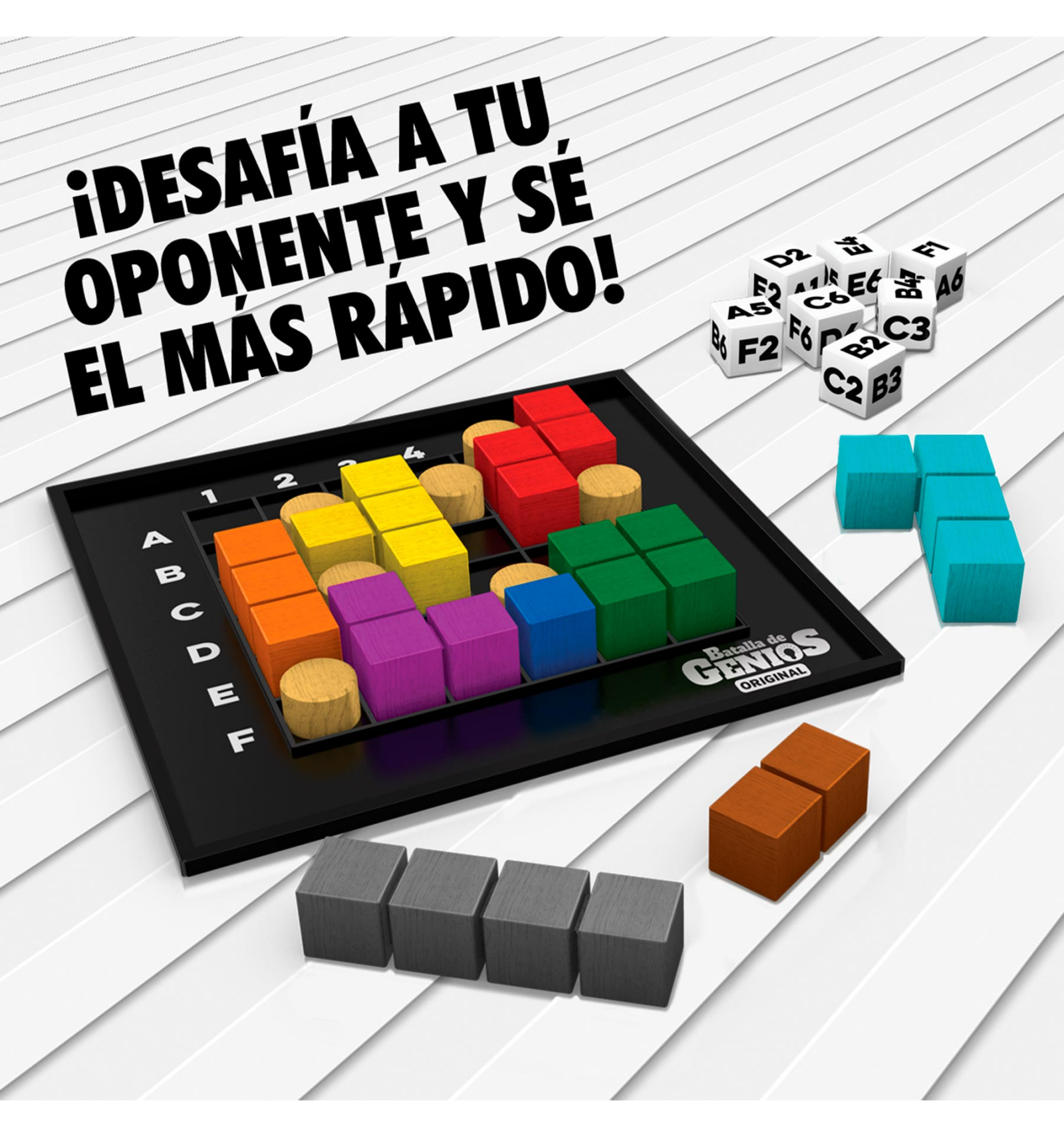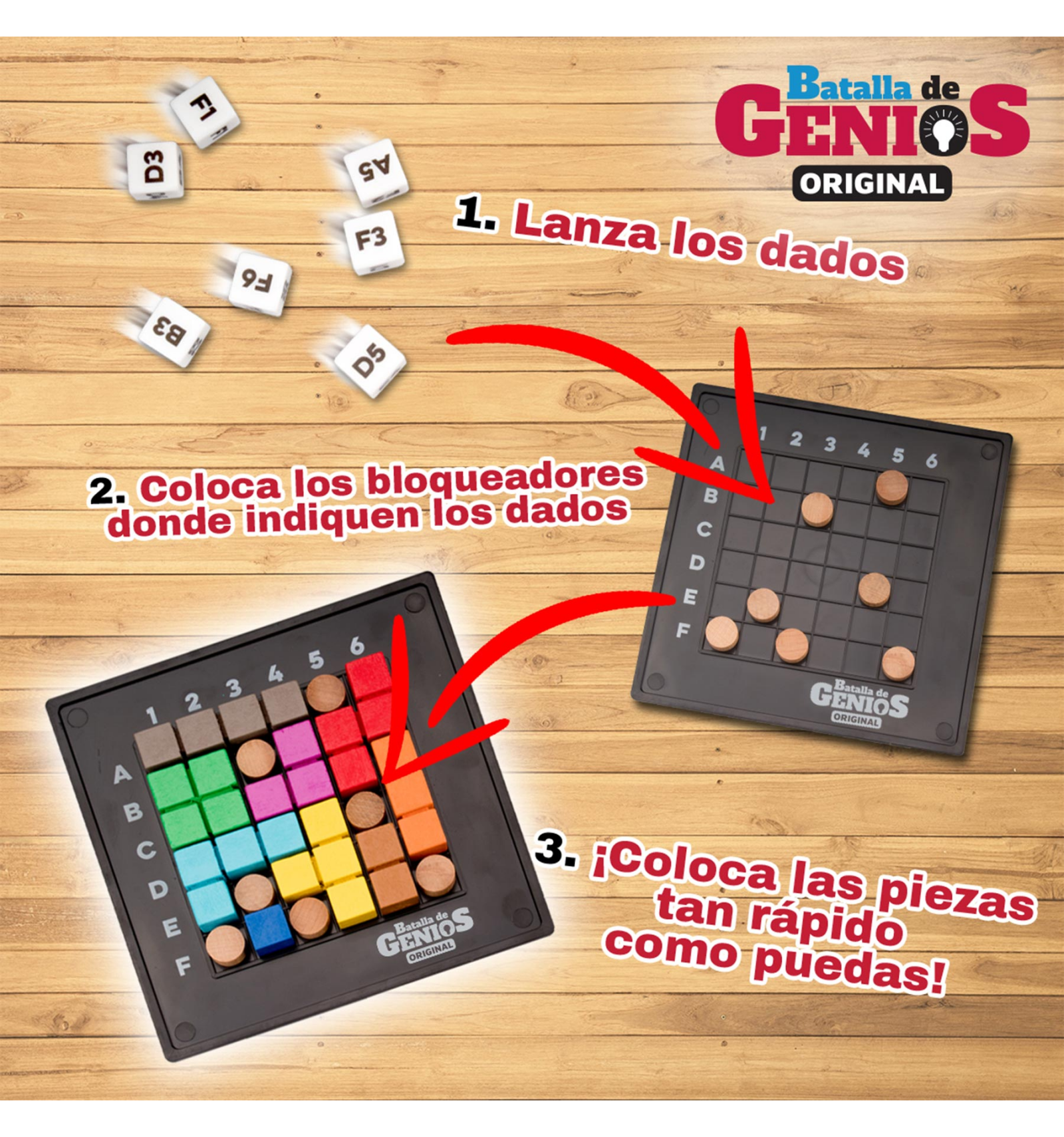 Repta al teu oponent a aquesta Batalla de Genis i completa el tauler abans que ell. Sigues el més ràpid a resoldre-ho! Existeixen 62.208 combinacions possibles I sempre hi ha una solució! Completa la quadrícula amb les nou peces de colors, una vegada que s'hagin col·locat els set blocadors en les posicions que indiquen els daus.