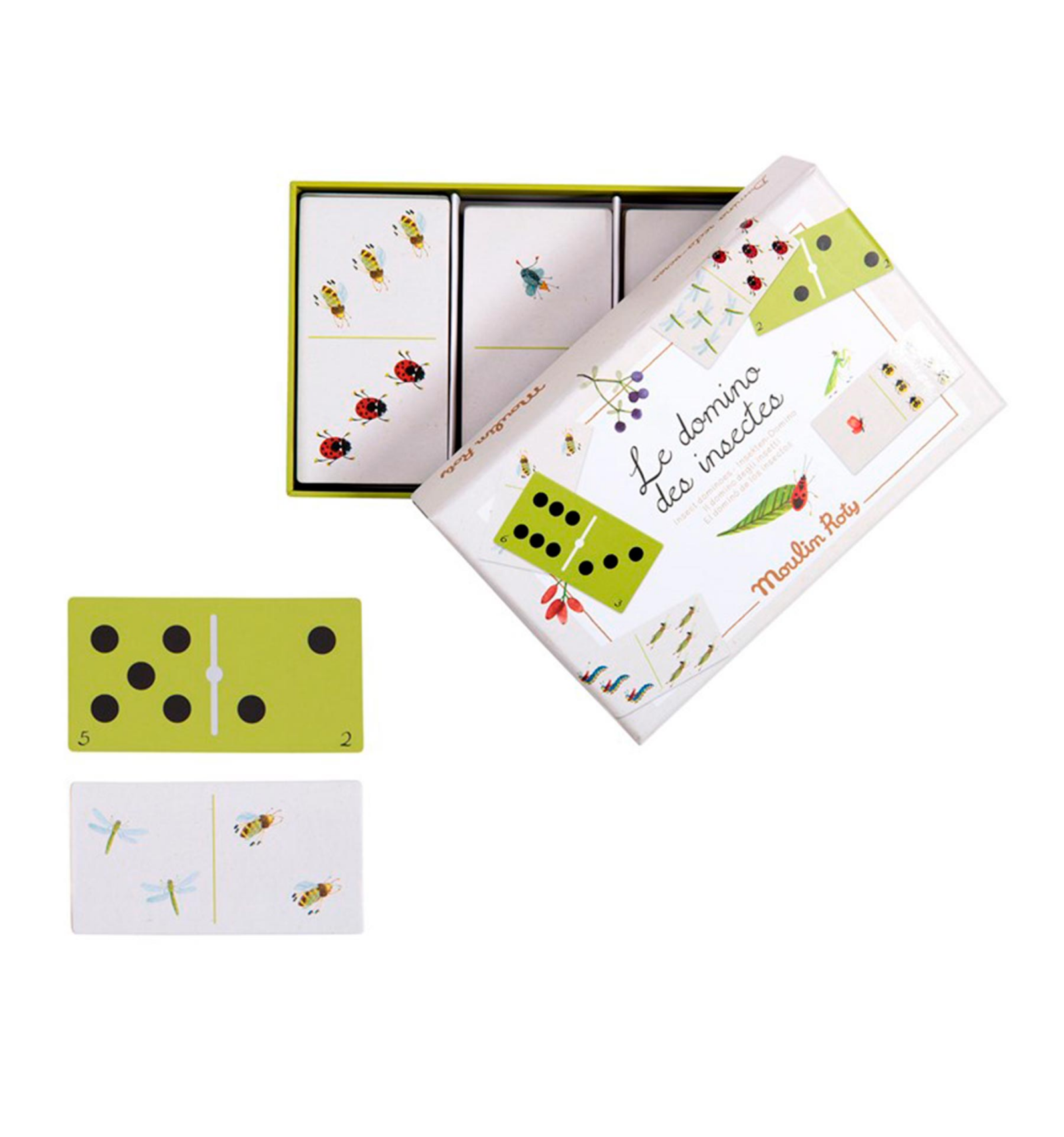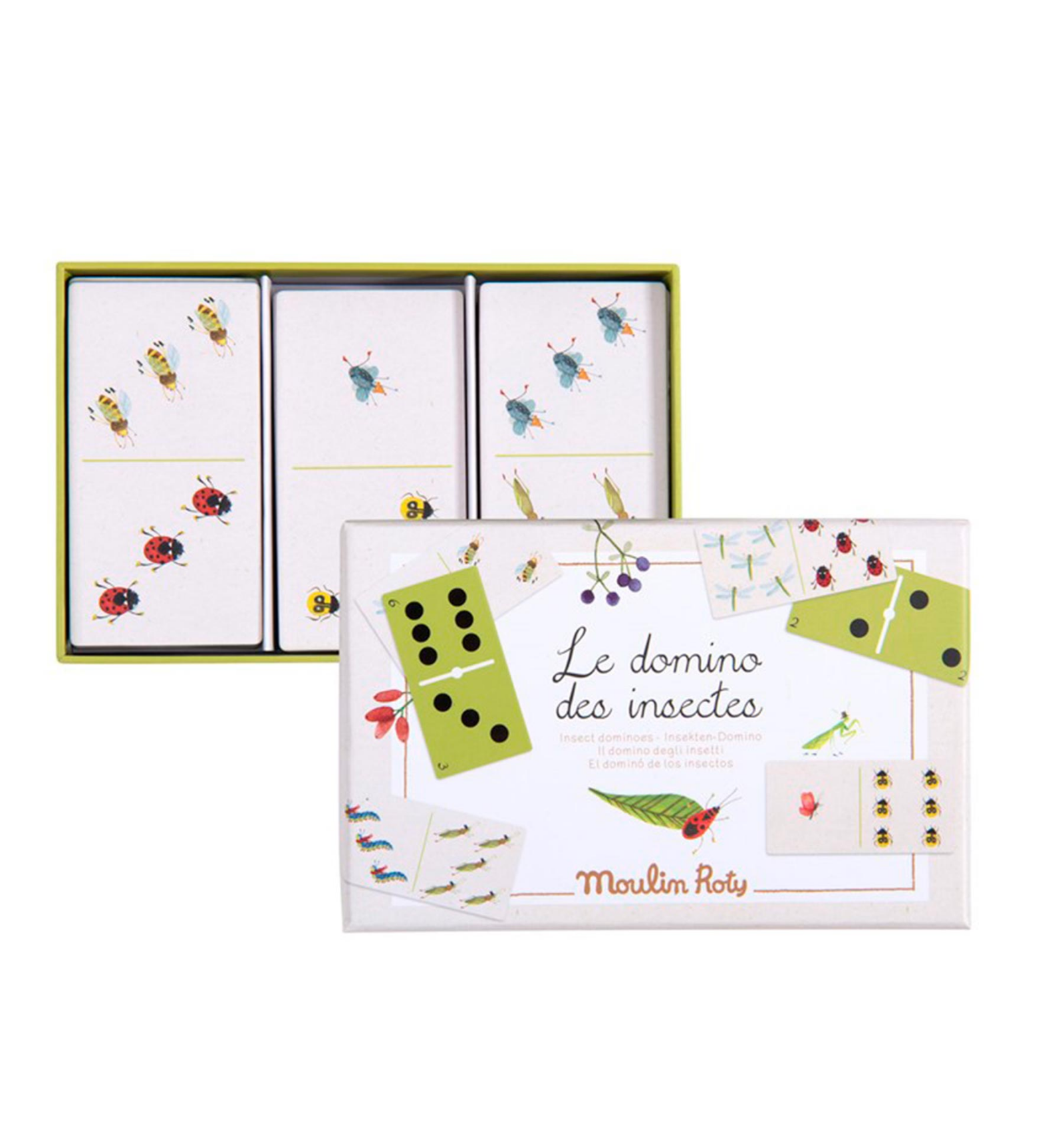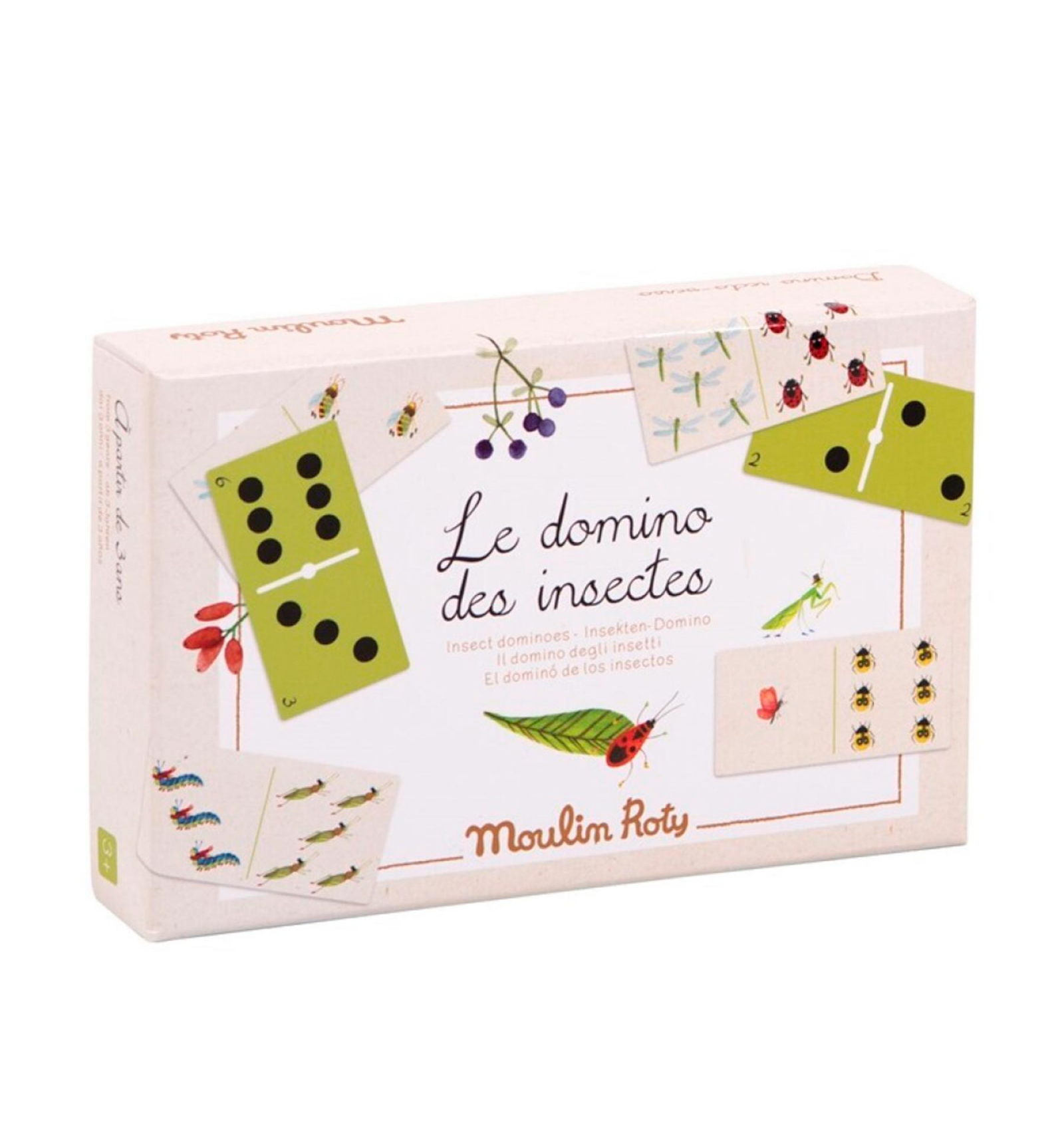 Descobreix l'encant de la natura amb aquest dòmino de Moulin Roty. D'una banda, trobaràs números i punts, i de l'altra, encantadors insectes dibuixats a aquarel·la. Una forma divertida d'observar, comptar i aprendre de 2 a 4 jugadors! Perfecte per gaudir en família.