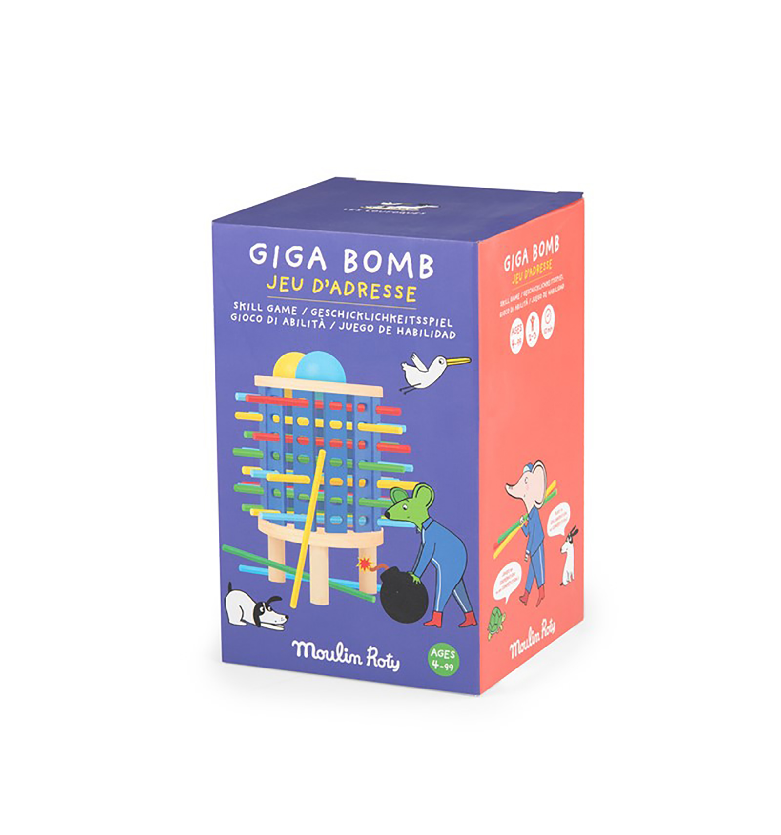 Diversió explosiva amb el joc Giga Bomb de Moulin Roty! Un joc dhabilitat i equilibri en què els jugadors han de mantenir la seva bola a la torre sense fer caure la gran bomba de fusta. Ideal per a 2 a 3 jugadors i per gaudir en família a partir de 4 anys.