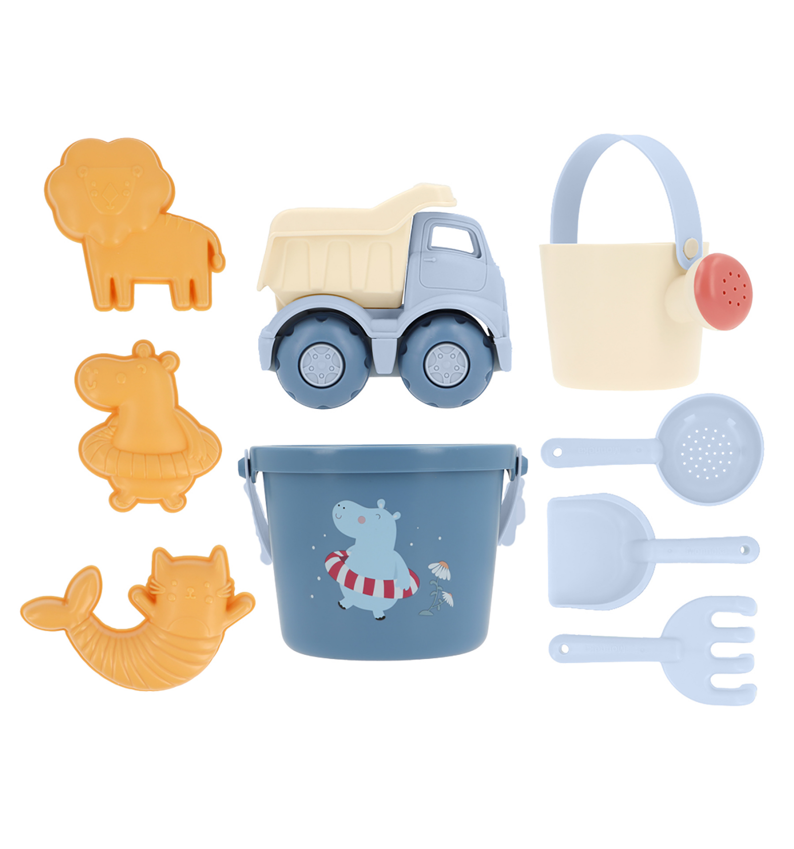 El set de joguines de platja per a nadó inclou 9 peces per jugar amb la sorra. Fabricat amb material eco-friendly, és segur, flexible i perfecte des dels 6 mesos.