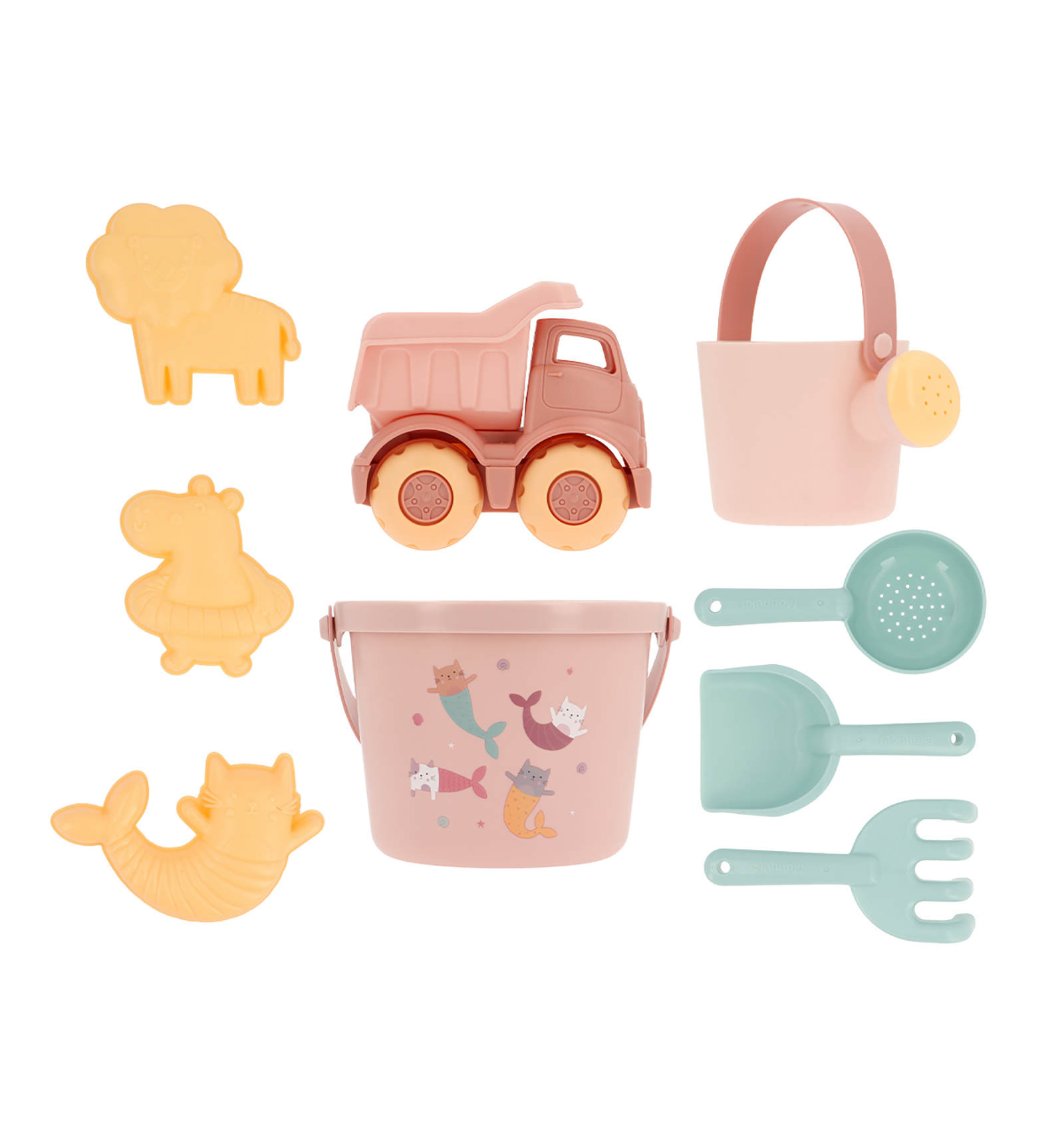 El set de joguines de platja per a nadó inclou 9 peces per jugar amb la sorra. Fabricat amb material eco-friendly, és segur, flexible i perfecte des dels 6 mesos.