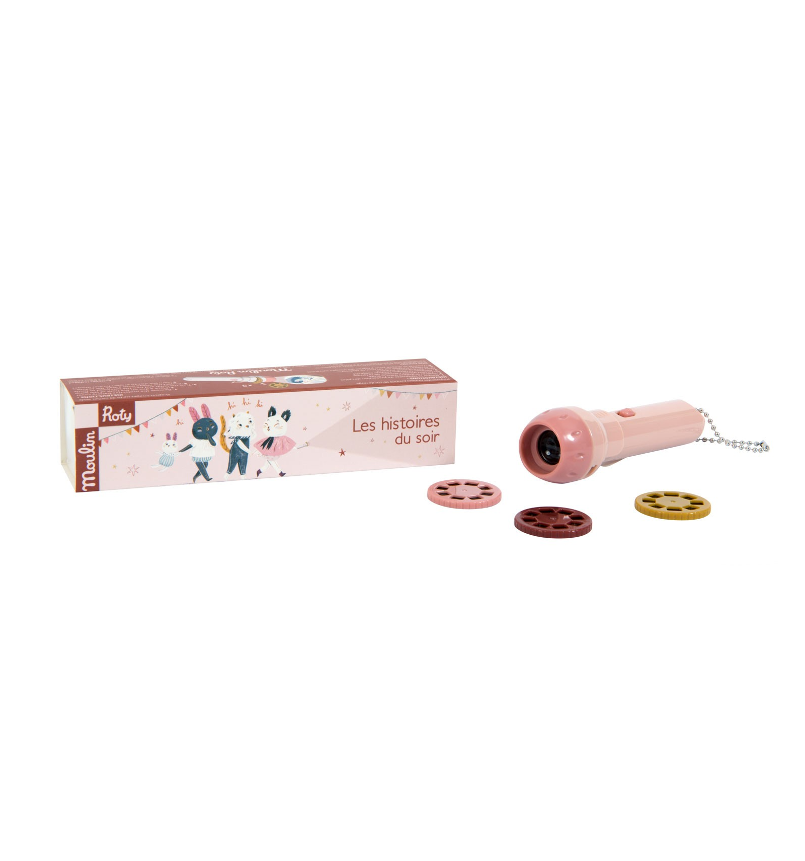 A la sessió de cinema d'avui, 3 històries amb les aventures del conill Lune, la rateta Brume i el xaiet Nuage buscant un refugi on passar la nit. La caixa inclou 1 llanterna i 3 bobines. Per a projectar a la paret o on vulgueu. Sense text, només imatges. Des dels 3 anys, o 2 sota supervisió.