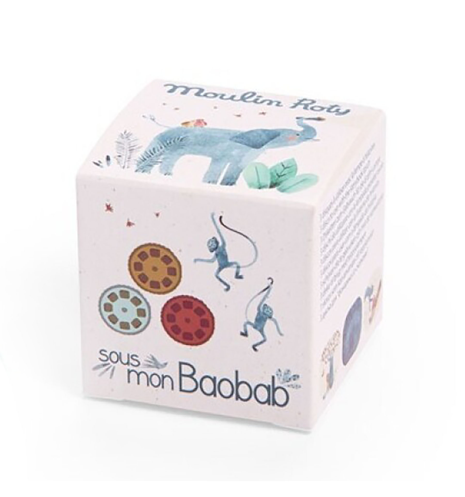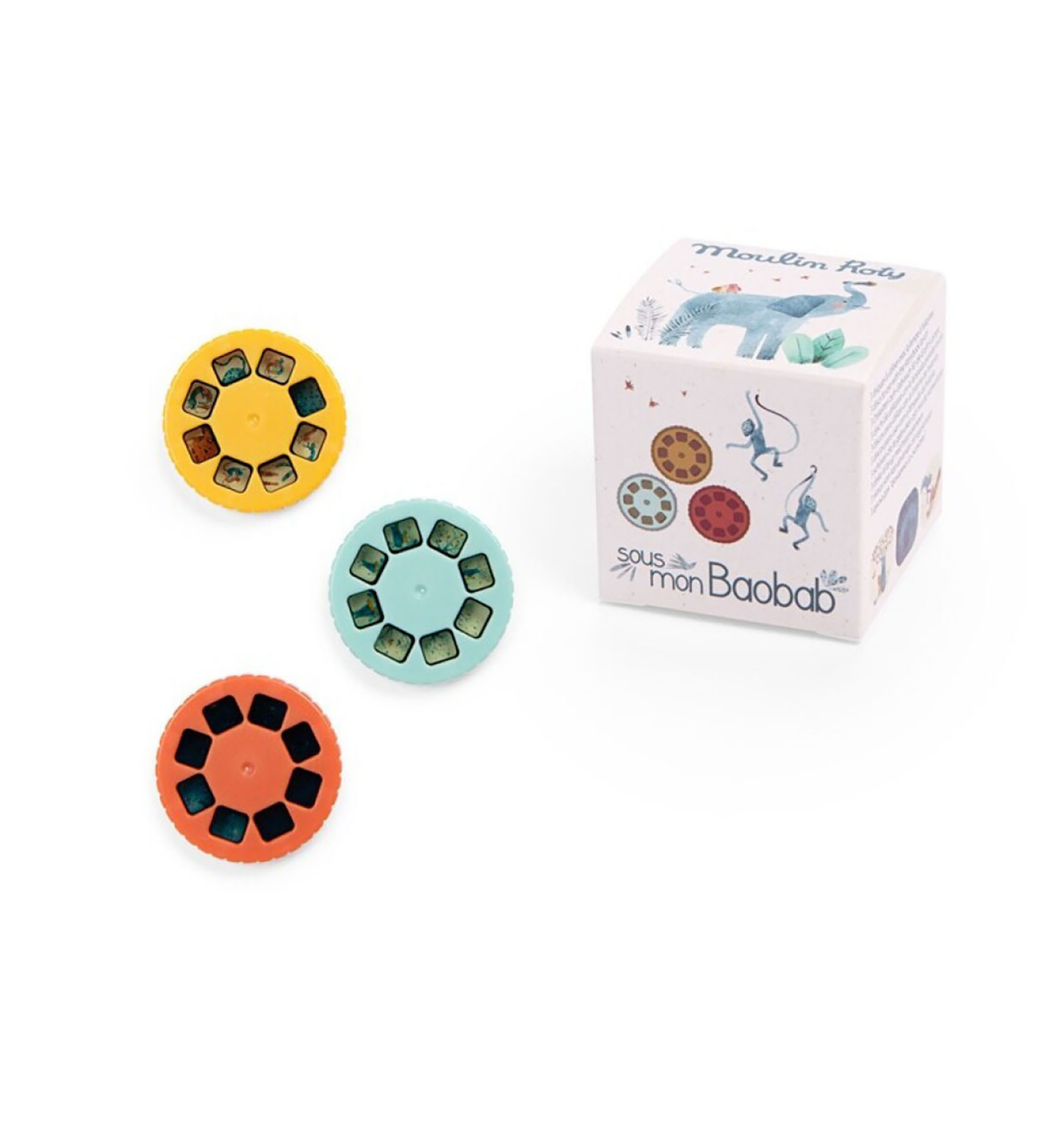 Sessió triple de contes! Un pack amb 3 bobines per a les llanternes de cinema de Moulin Roty, amb "Mi Baobab", "Los Monos!" i "Els Guepardos". Una manera diferent d'explicar els contes de bona nit als teus nens. Les imatges no inclouen textos, de manera que són una porta oberta a la imaginació i la improvisació.