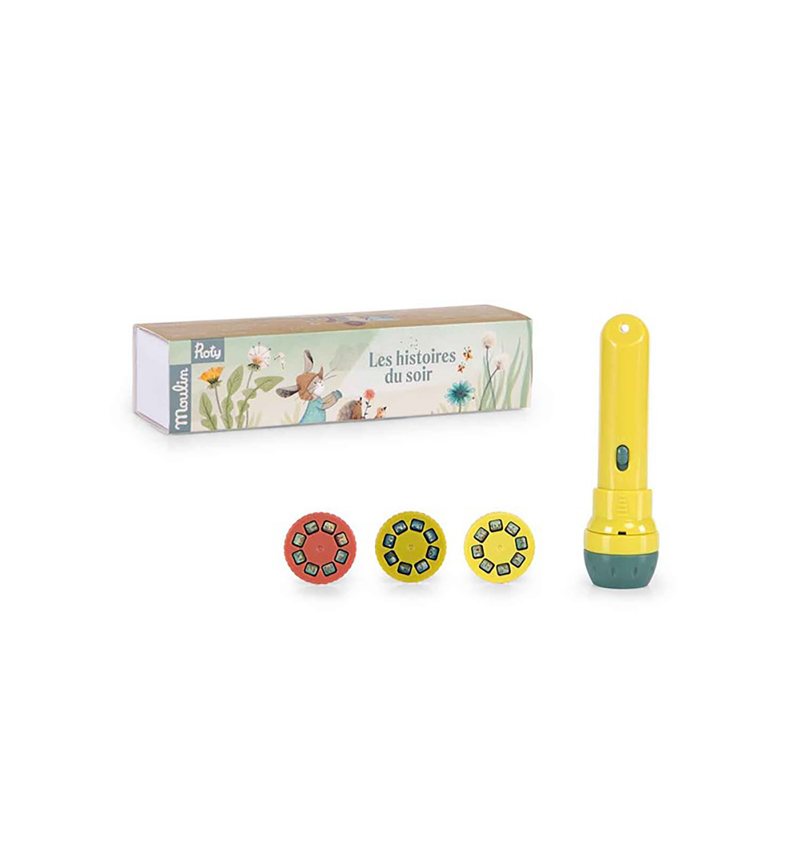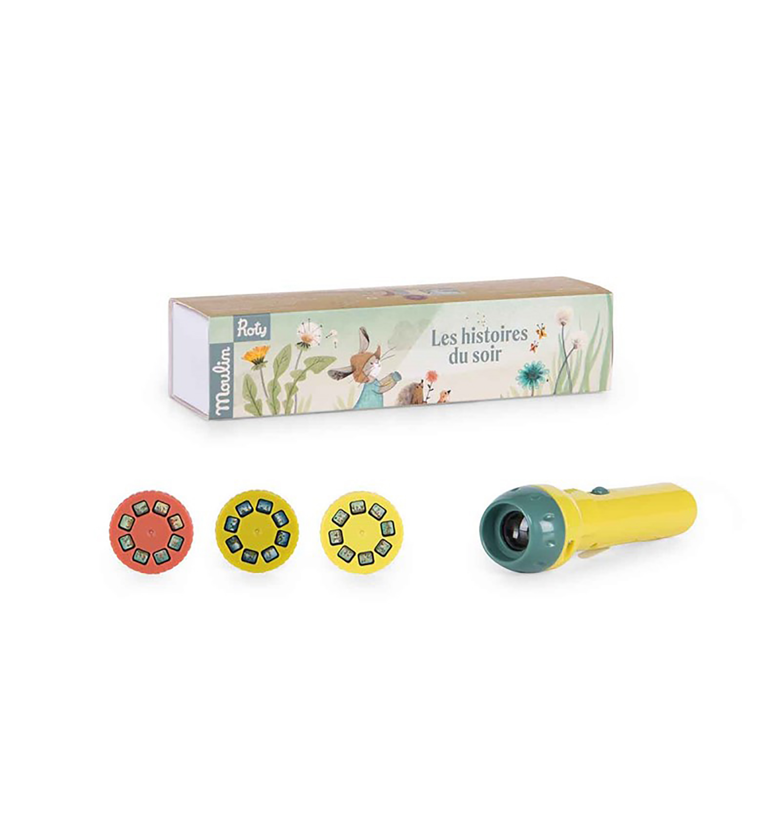 En la sessió de cinema d'avui, 3 contes amb les aventures de Trois Petits Lapins. Conté 1 llanterna i 3 discos amb imatges i sense textos, per a inventar lliurement mil històries. Caixa: 17x8 cm. A partir de 3 anys, o 2 sota supervisió.