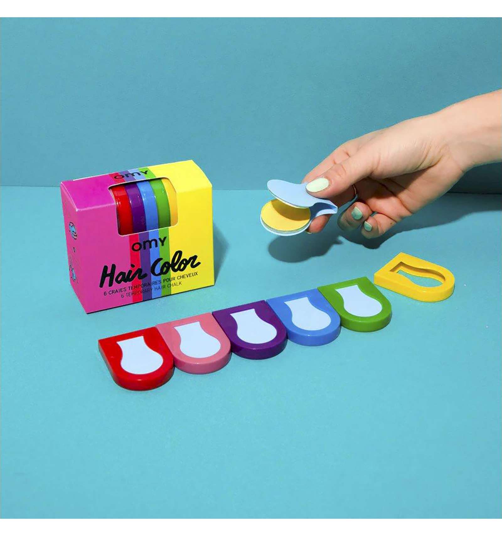 Transforma el teu cabell a l'instant amb els nostres guixos temporals de colors vibrants. Amb 6 tons diferents (rosa, vermell, morat, blau, verd i groc), pots aplicar-los fàcilment sobre cabell sec o humit, ja sigui clar o fosc.