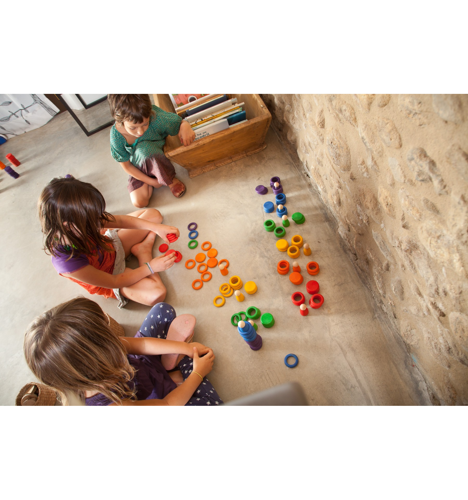 Aparec, desaparec, m'amago, em cobreixo, em retrobo,… Les anelles permeten amagar completament al Nin arribant a tapar-lo per complet, alhora les monedes fan de límit per a fer-lo pujar, cobrir-lo a mitges, descobrir-lo del tot… Un material senzill que permet múltiples possibilitats de joc. 6 nins, 18 monedes i 36 anelles.