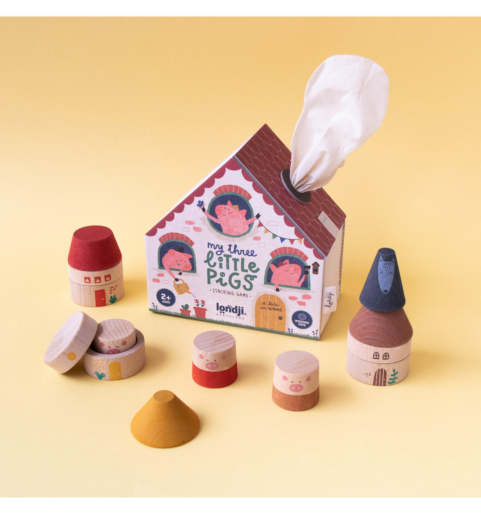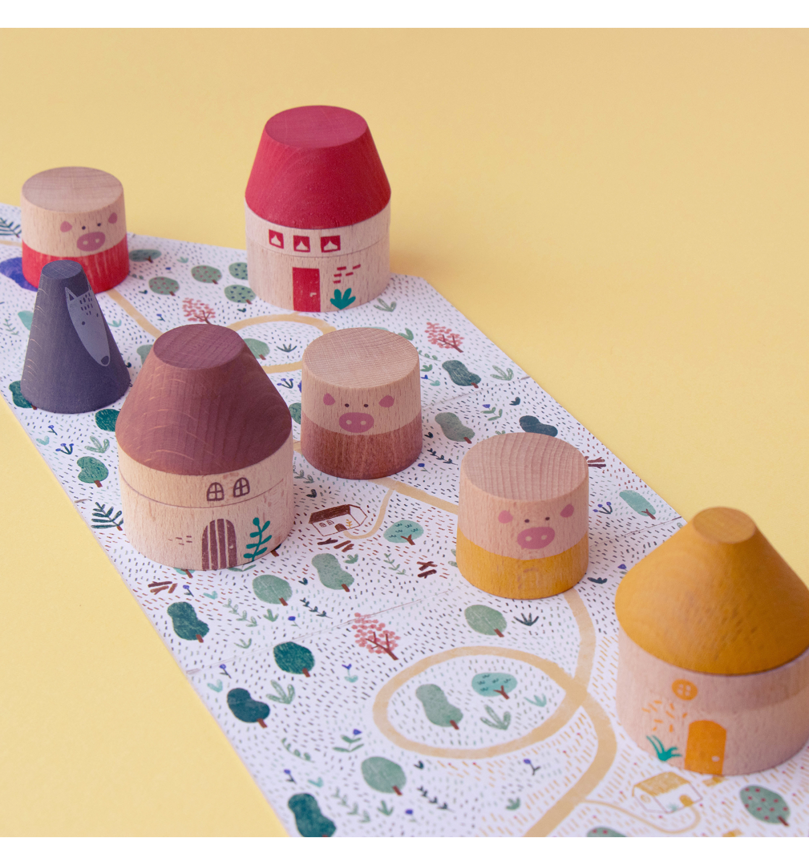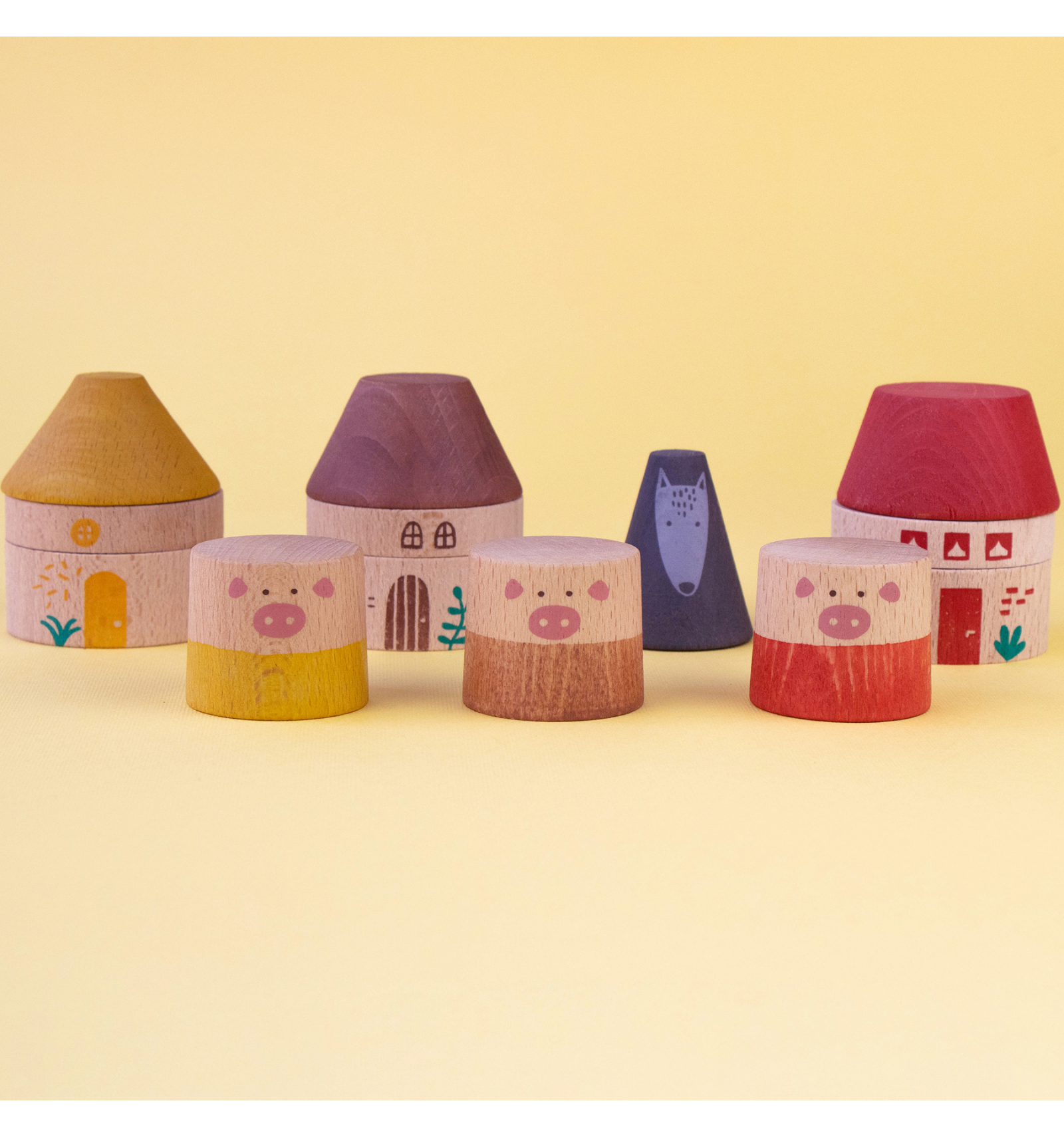 Hi havia una vegada tres porquets que van decidir construir les seves cases. Ara els més petits poden ajudar-los abans que arribi el llop amb aquesta joguina de fusta únic.