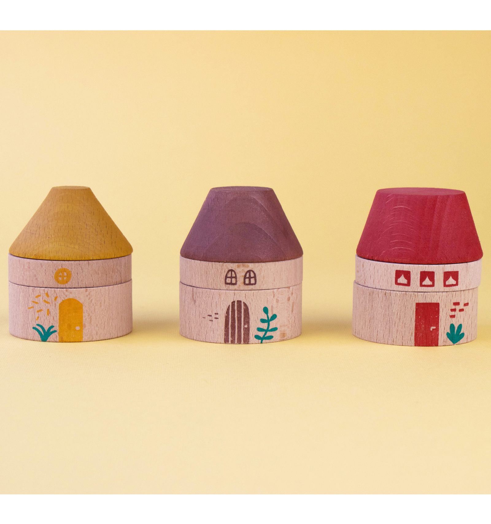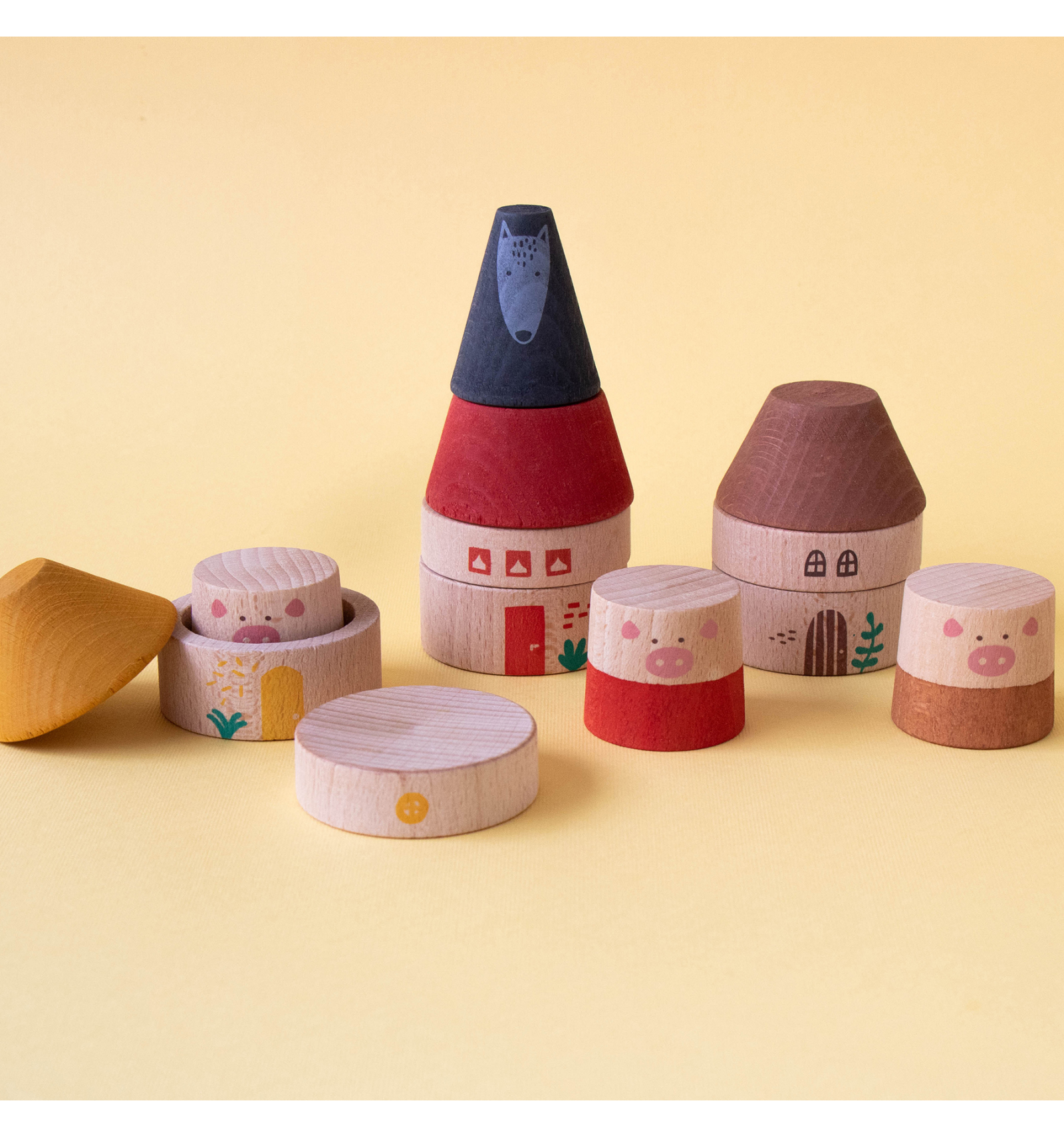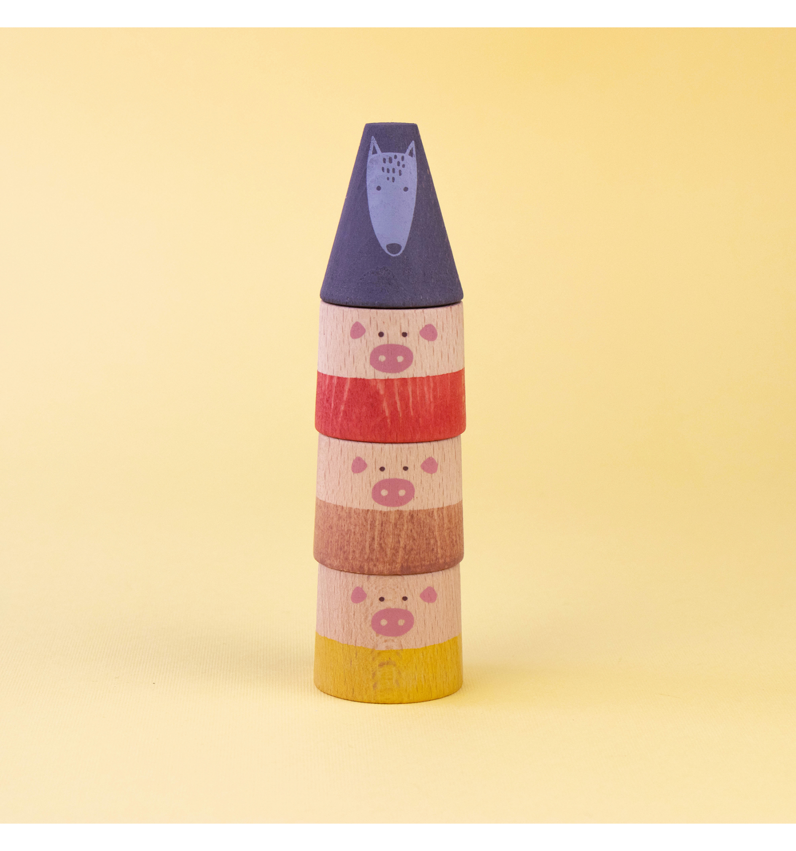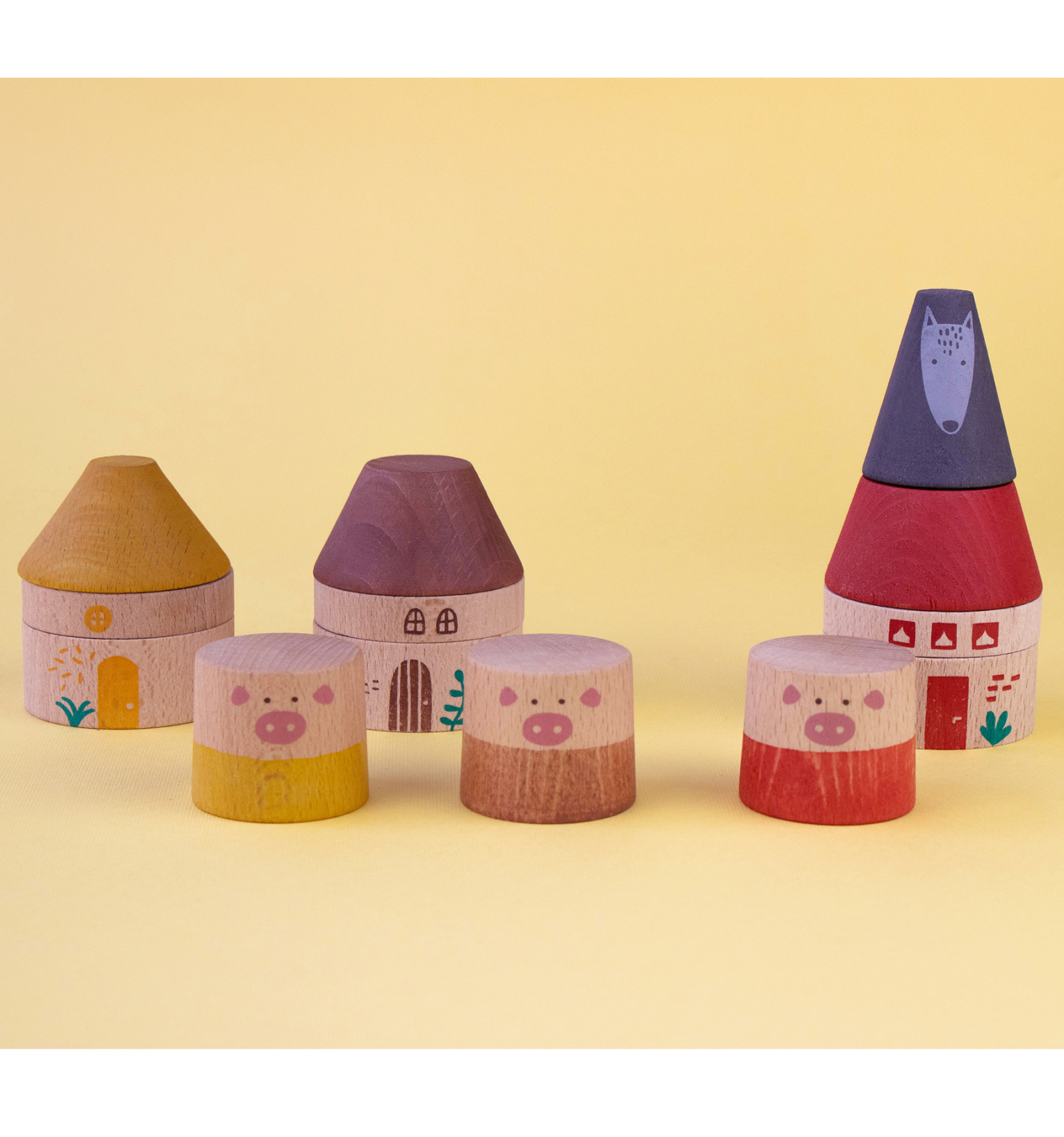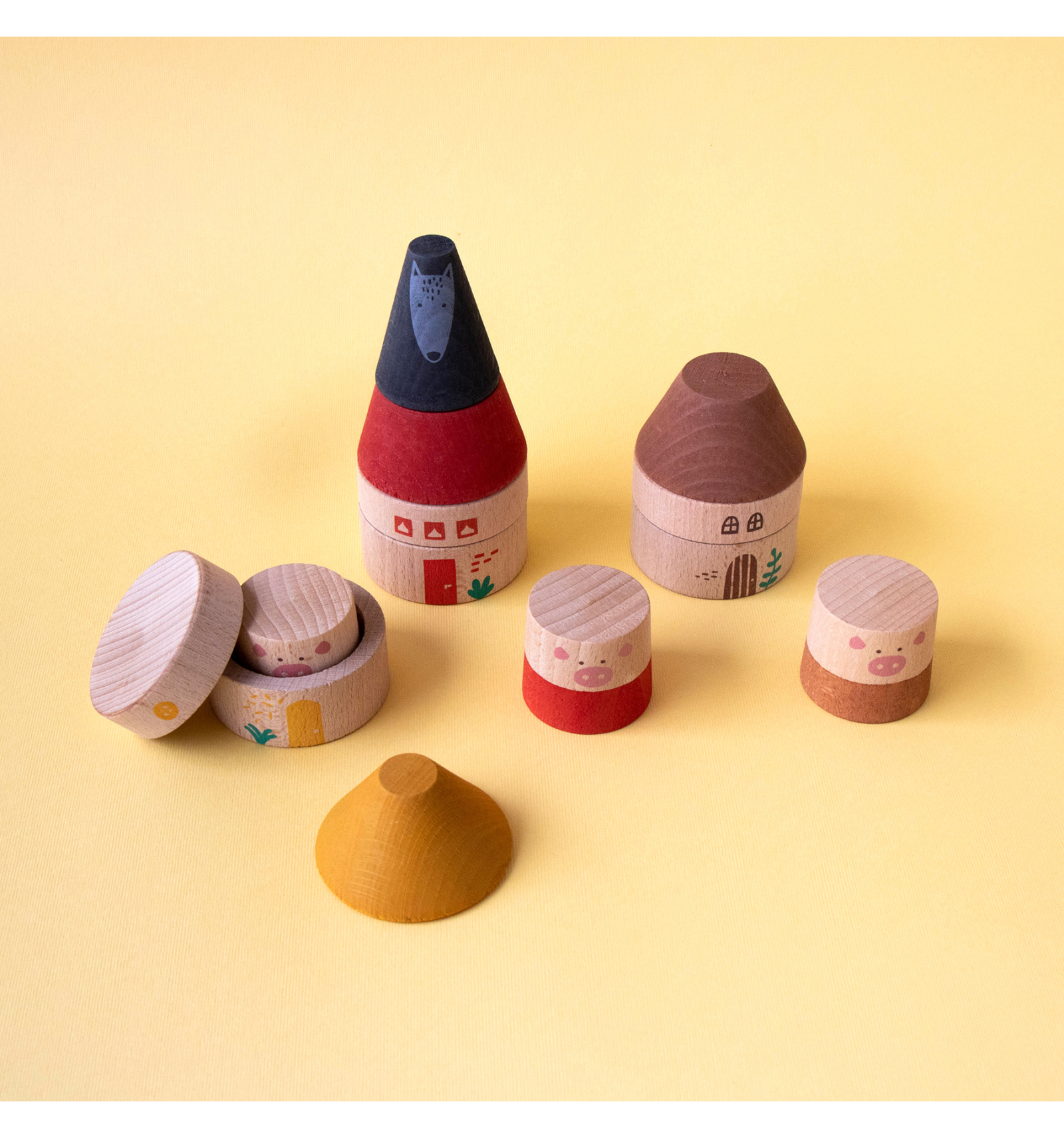 Una joguina de fusta sostenible inspirat en el conte clàssic Els tres cerditos. Perfecte per a apilar, encaixar i crear històries mentre desenvolupa habilitats narratives, lògiques i motores. Dissenyat i fabricat a Barcelona.