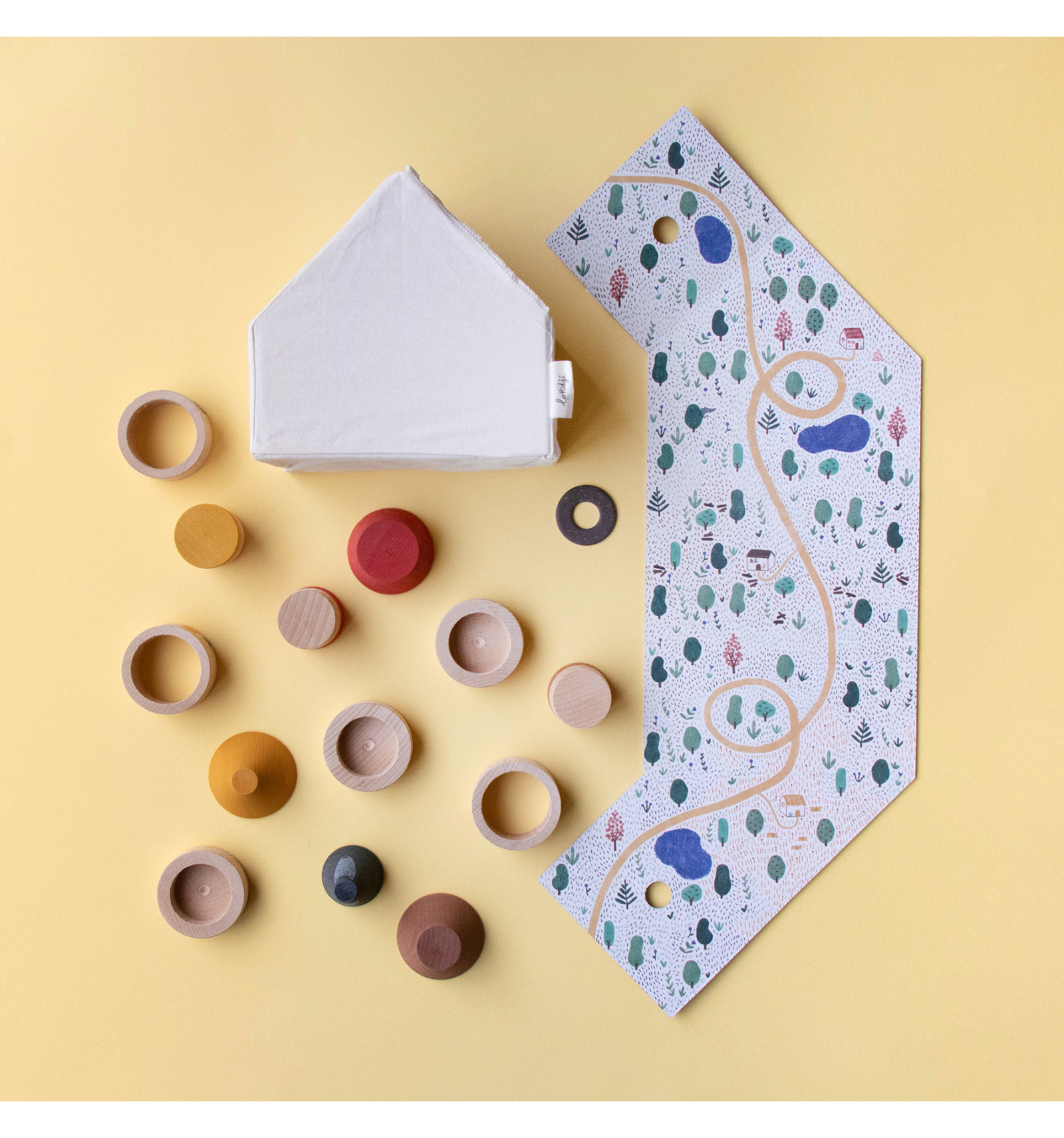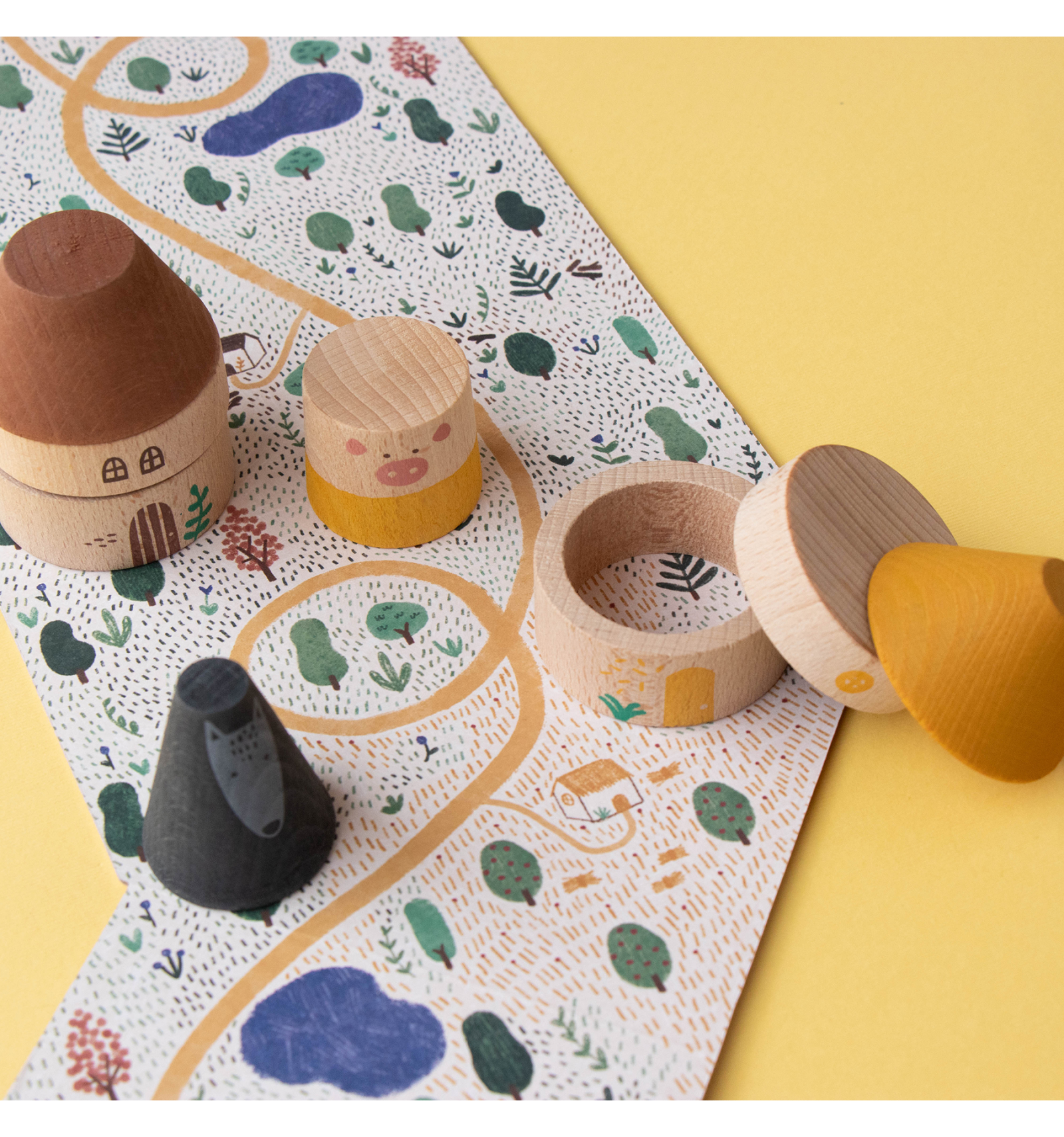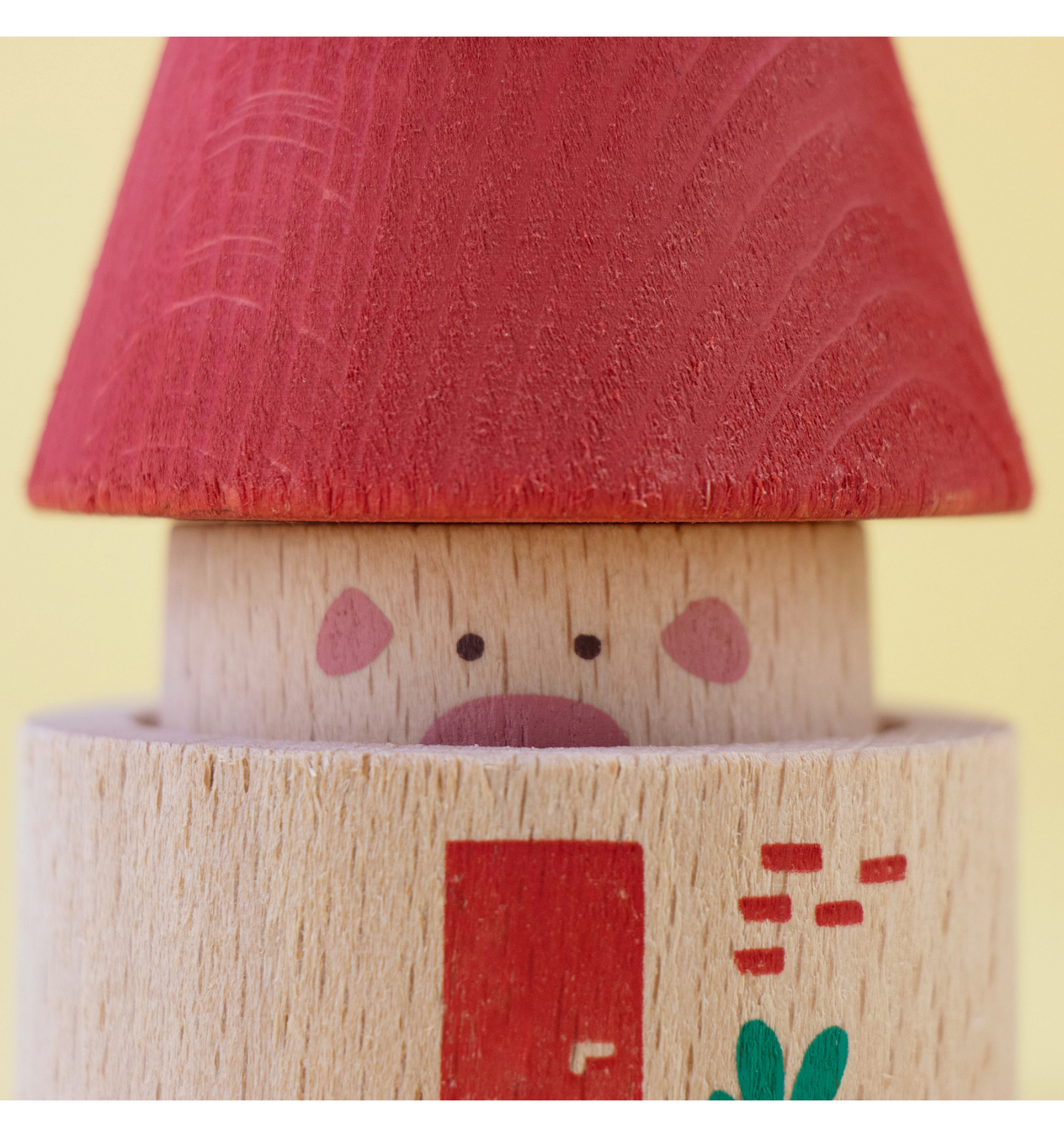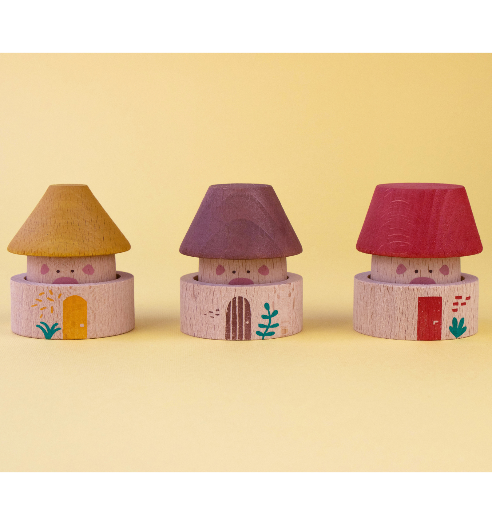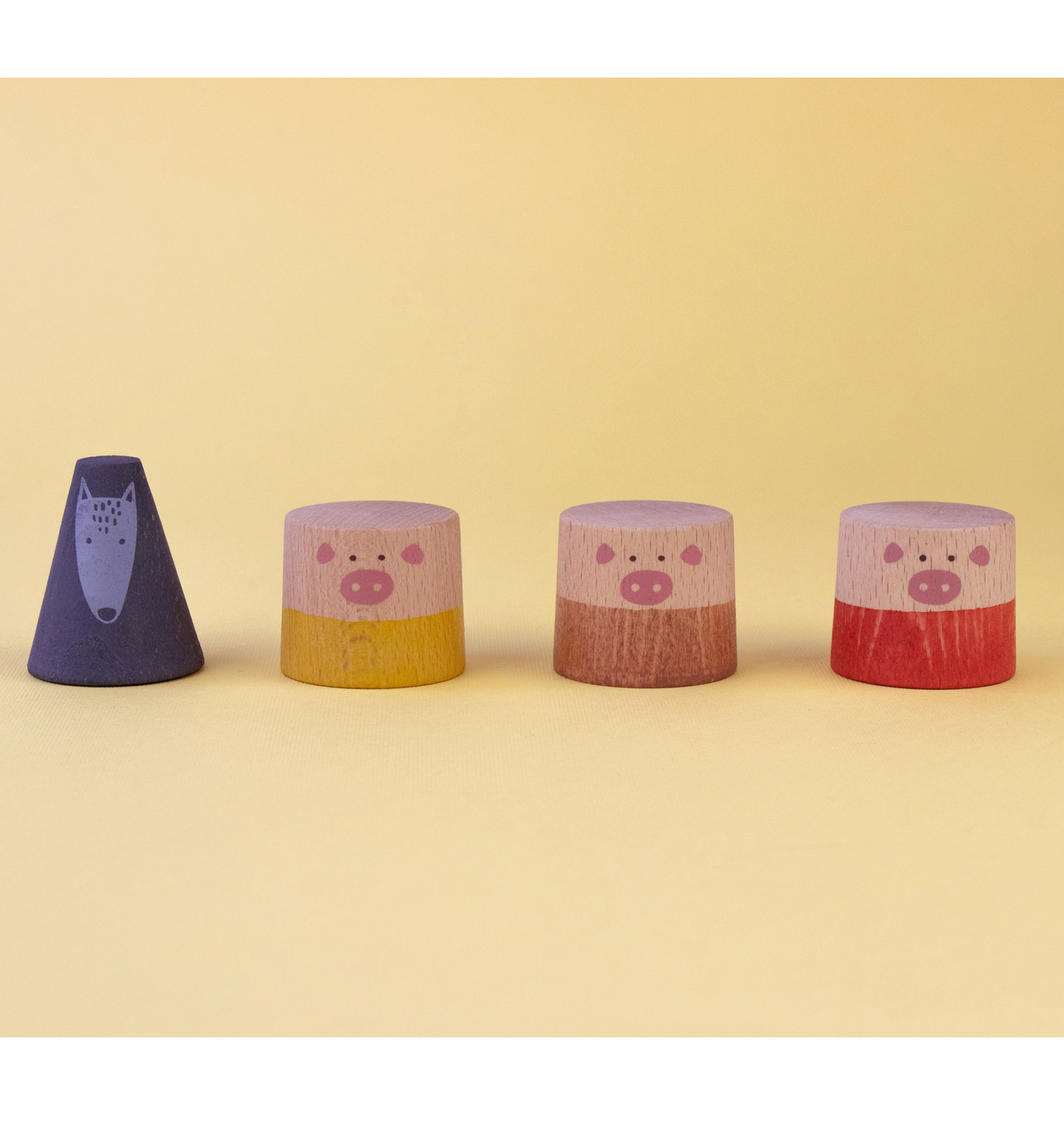 Una joguina de fusta sostenible inspirat en el conte clàssic Els tres cerditos. Perfecte per a apilar, encaixar i crear històries mentre desenvolupa habilitats narratives, lògiques i motores. Dissenyat i fabricat a Barcelona.