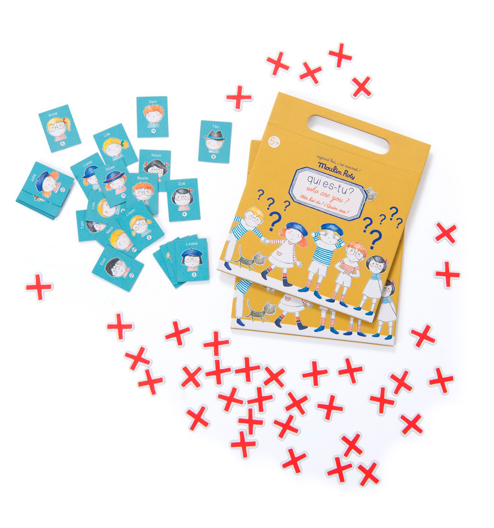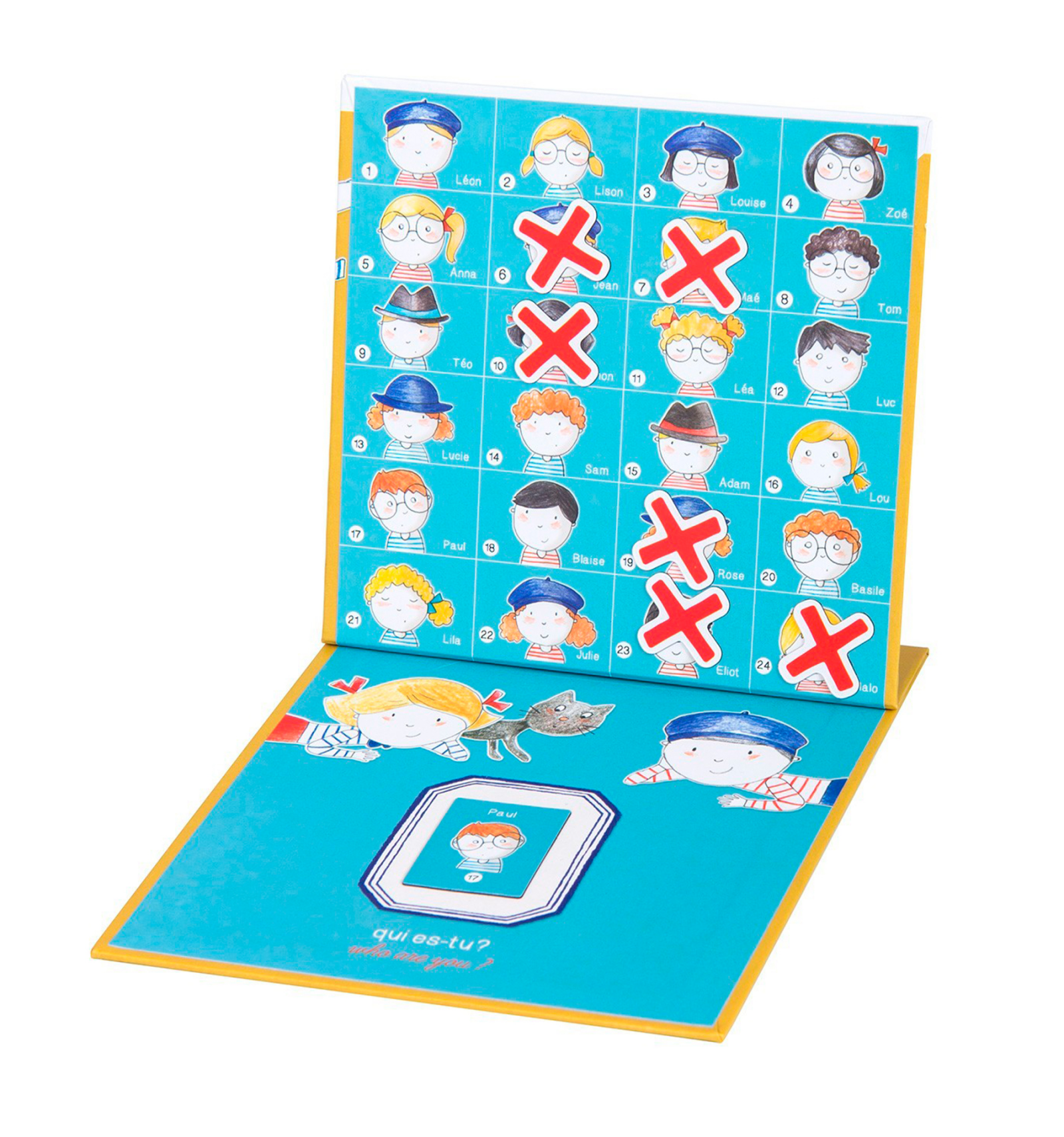 El Qui és qui? de viatge de Moulin Roty s'obre, s'instal·la còmodament en qualsevol lloc gràcies a la seva base imantada, i es guarda fàcilment tan aviat com arribis a la platja o al teu destí.