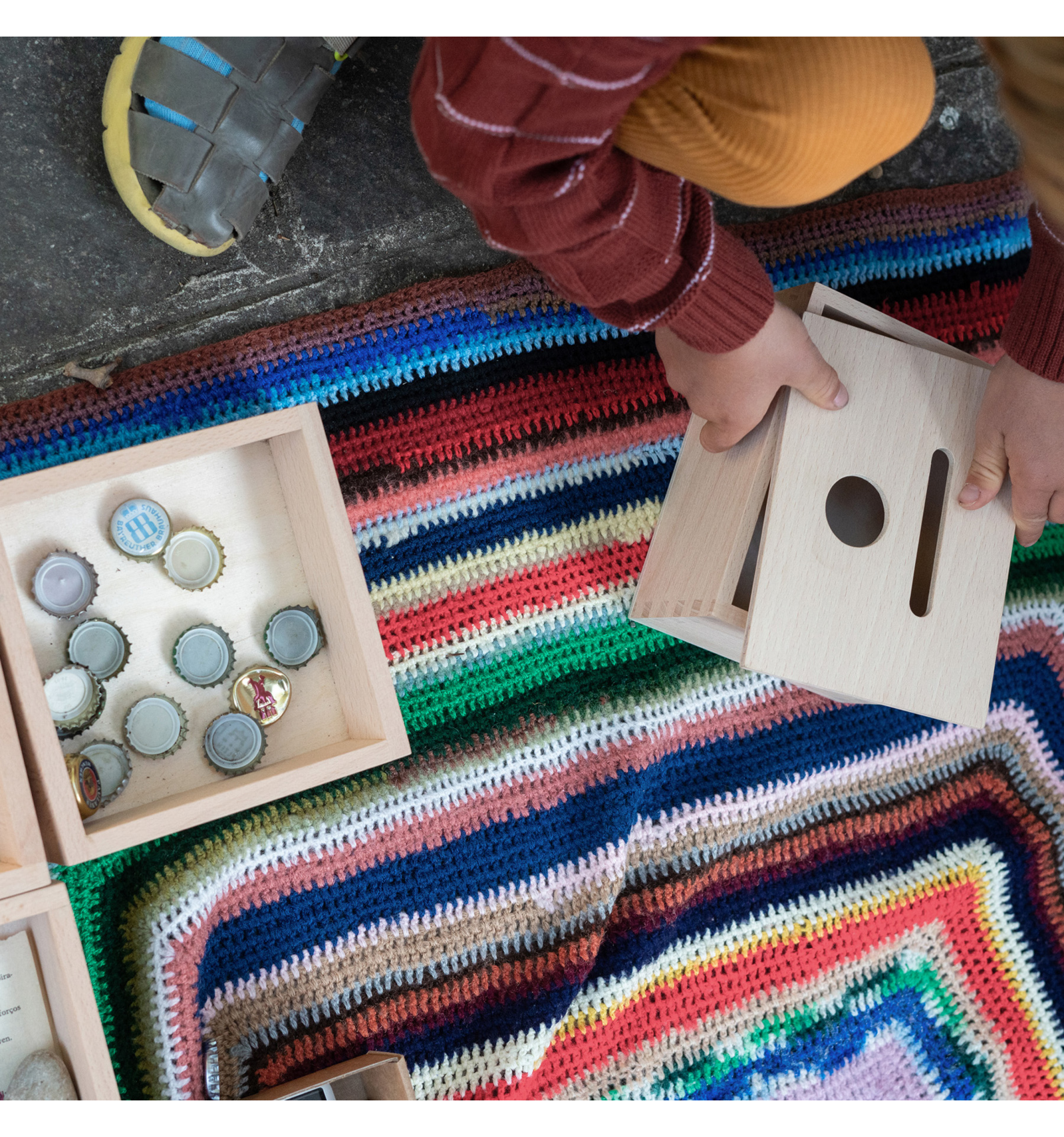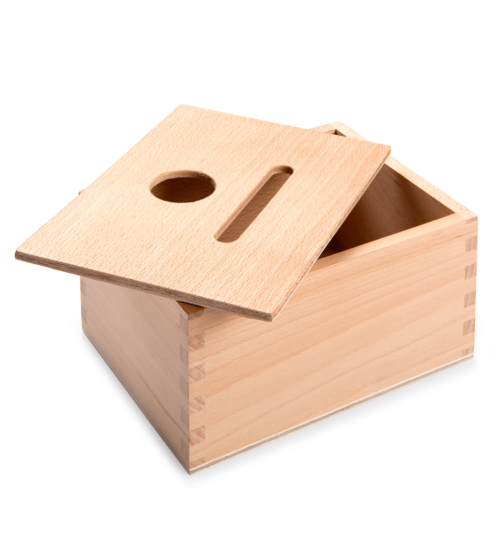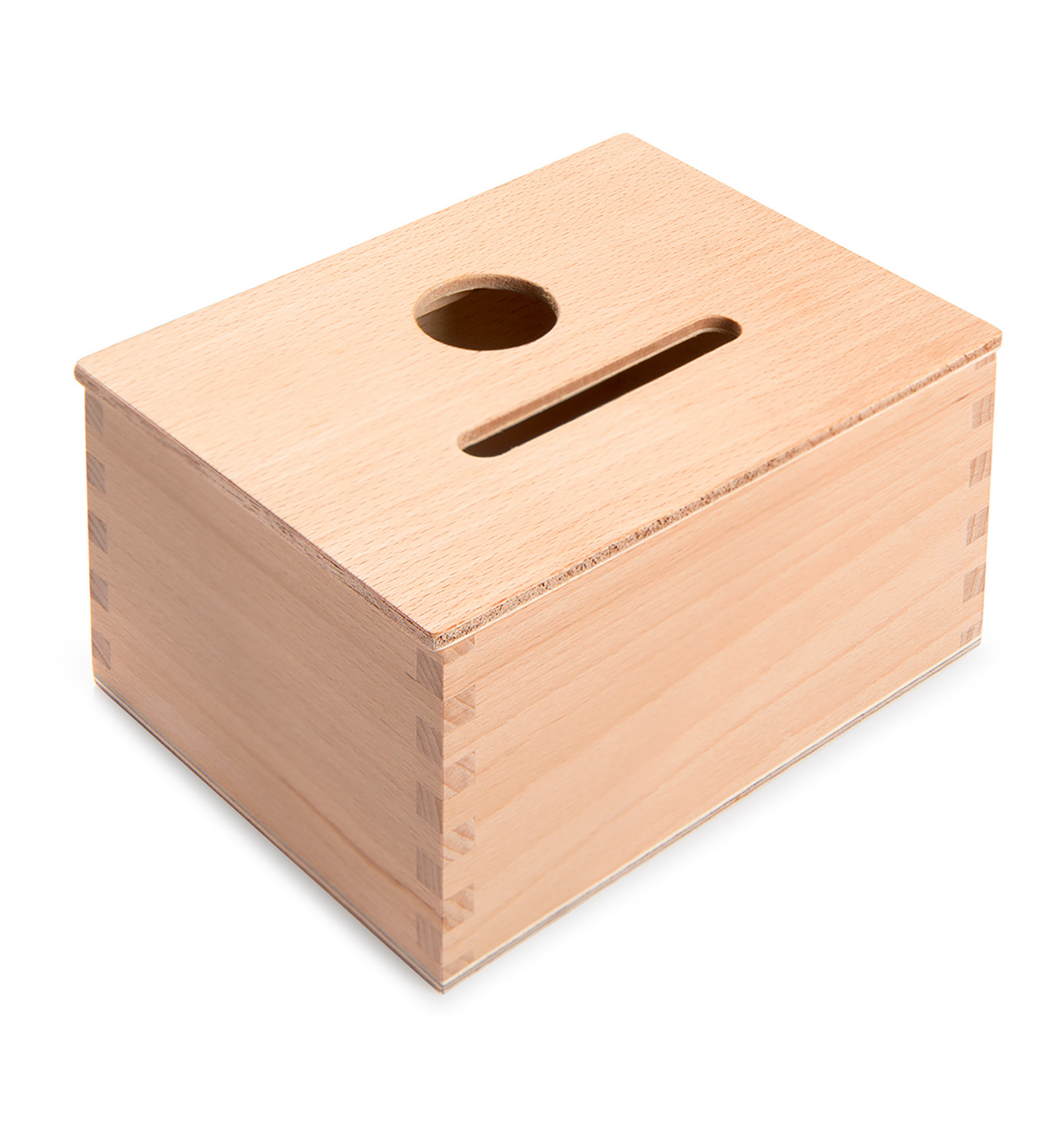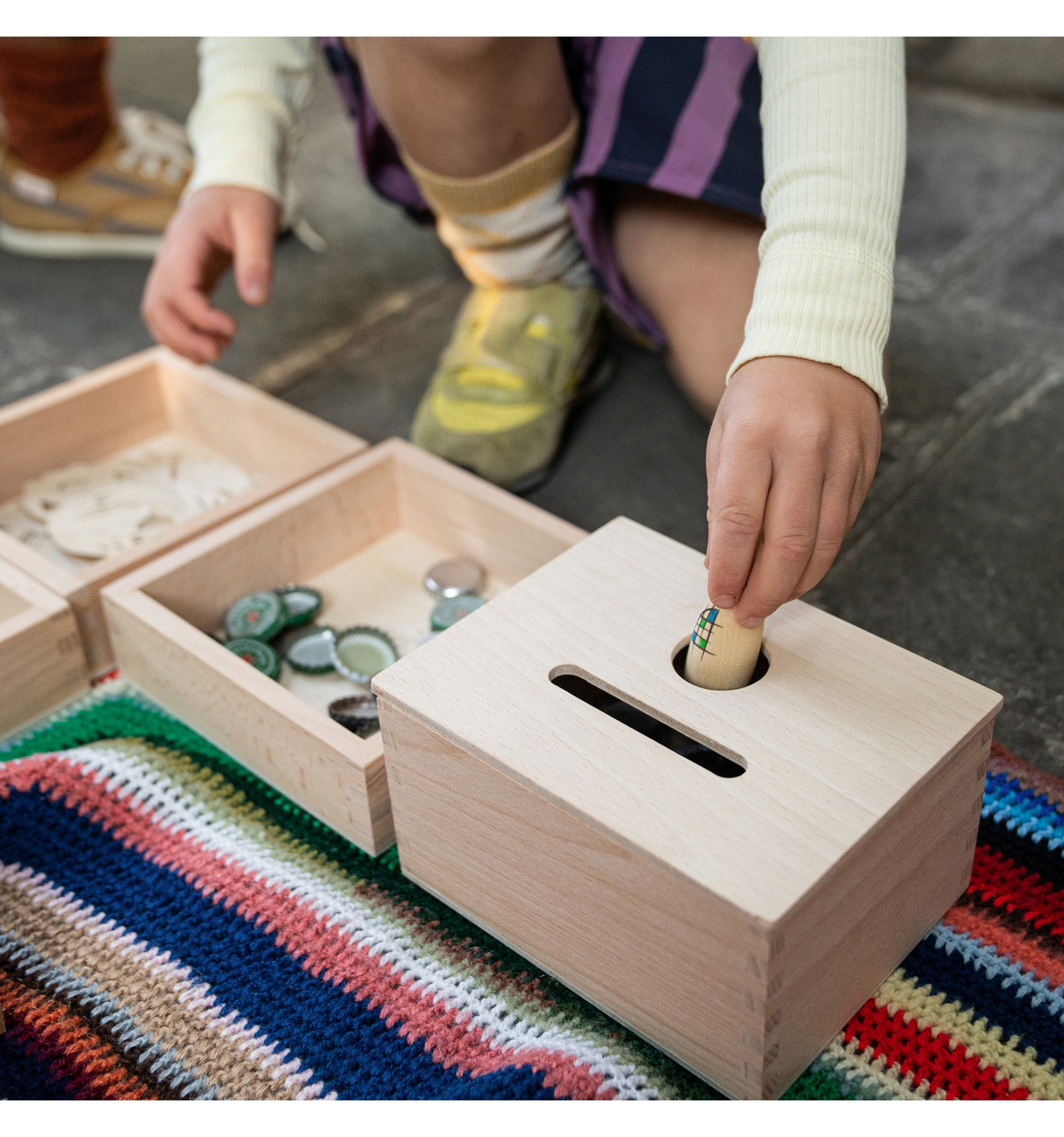 La caixa de permanència és una caixa màgica on encaixar peces, col·leccionar, atresorar o intercanviar. Permet als bebès i nens petits explorar per si mateixos a través de totes les seves fases d'aprenentatge. La caixa està pensada per a formar el coneixement entorn del principi de permanència, però és un gran complement per al joc simbòlic per a encaixar, classificar, combinar colors i… una infinitat de possibilitats més per descobrir!
