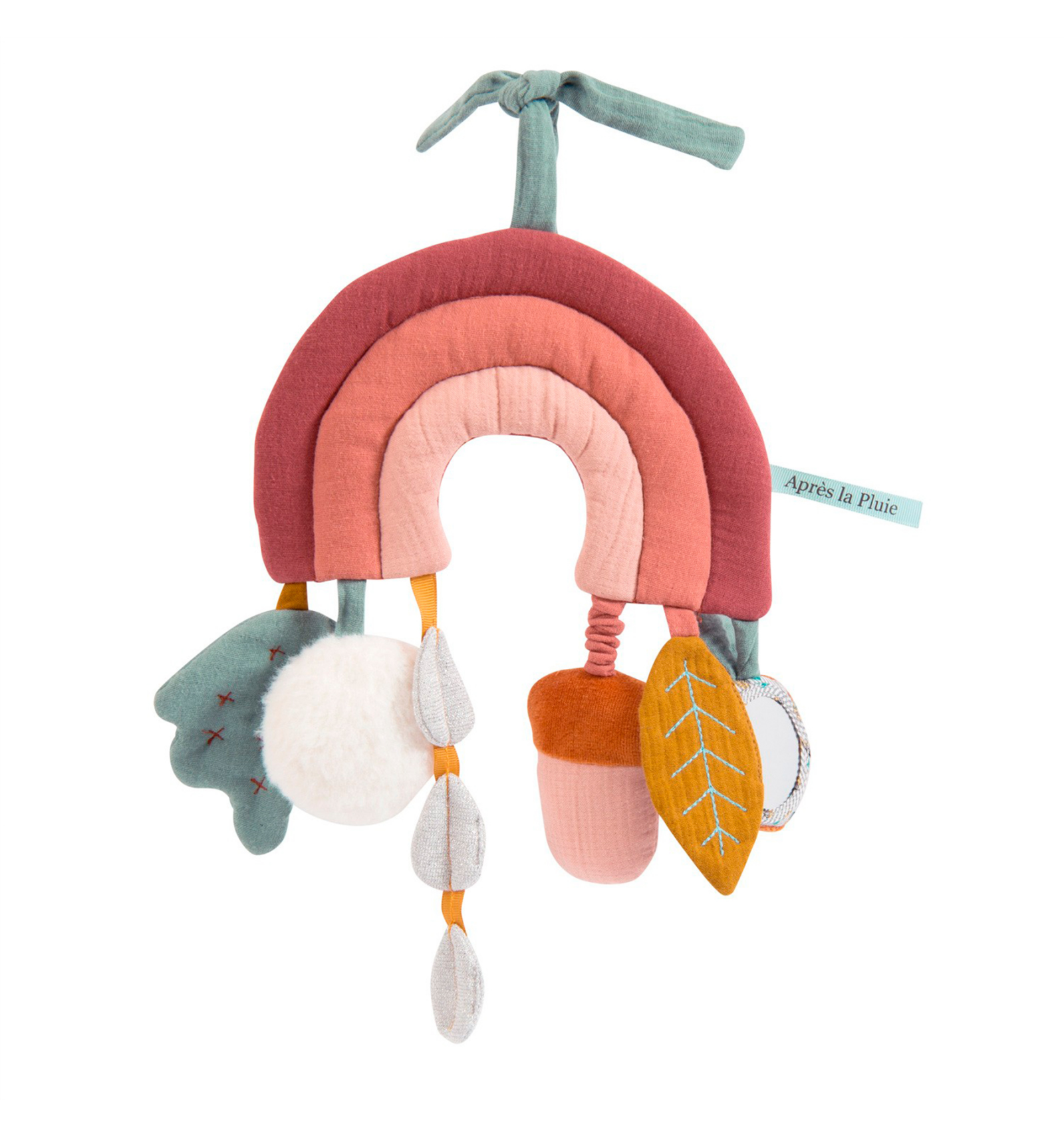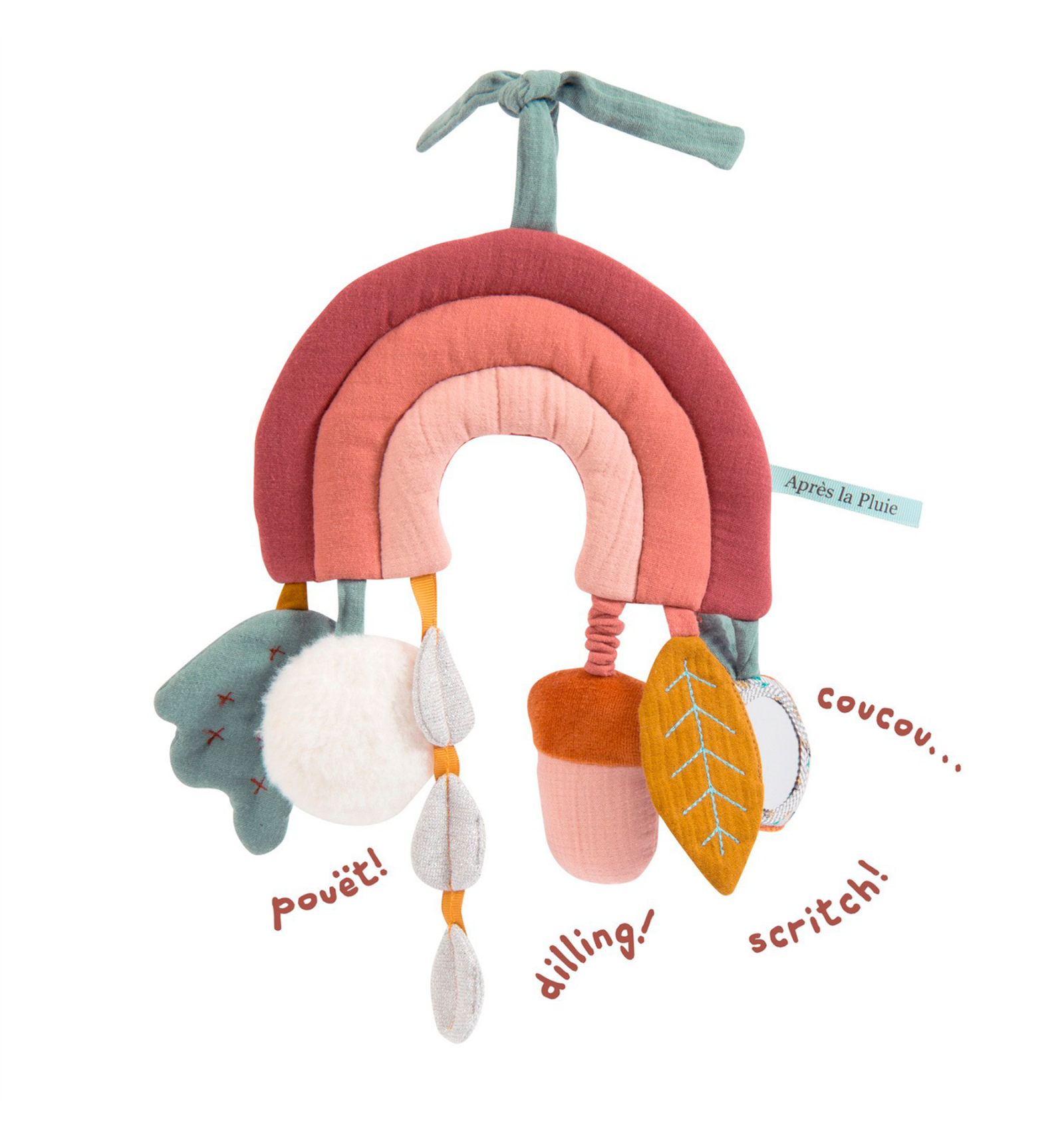 Un bonic arc de Sant Martí de tela que és una joguina sensorial i harmònica ideal per al teu bebè. Perfecte perquè el nen/a explori amb els elements de la natura i que descobreixi la botzina amagada al pompó, el sonall en el gla, el paper cruixent a la fulla, i el mirall que tant li agradarà. Mida: 29 cm.