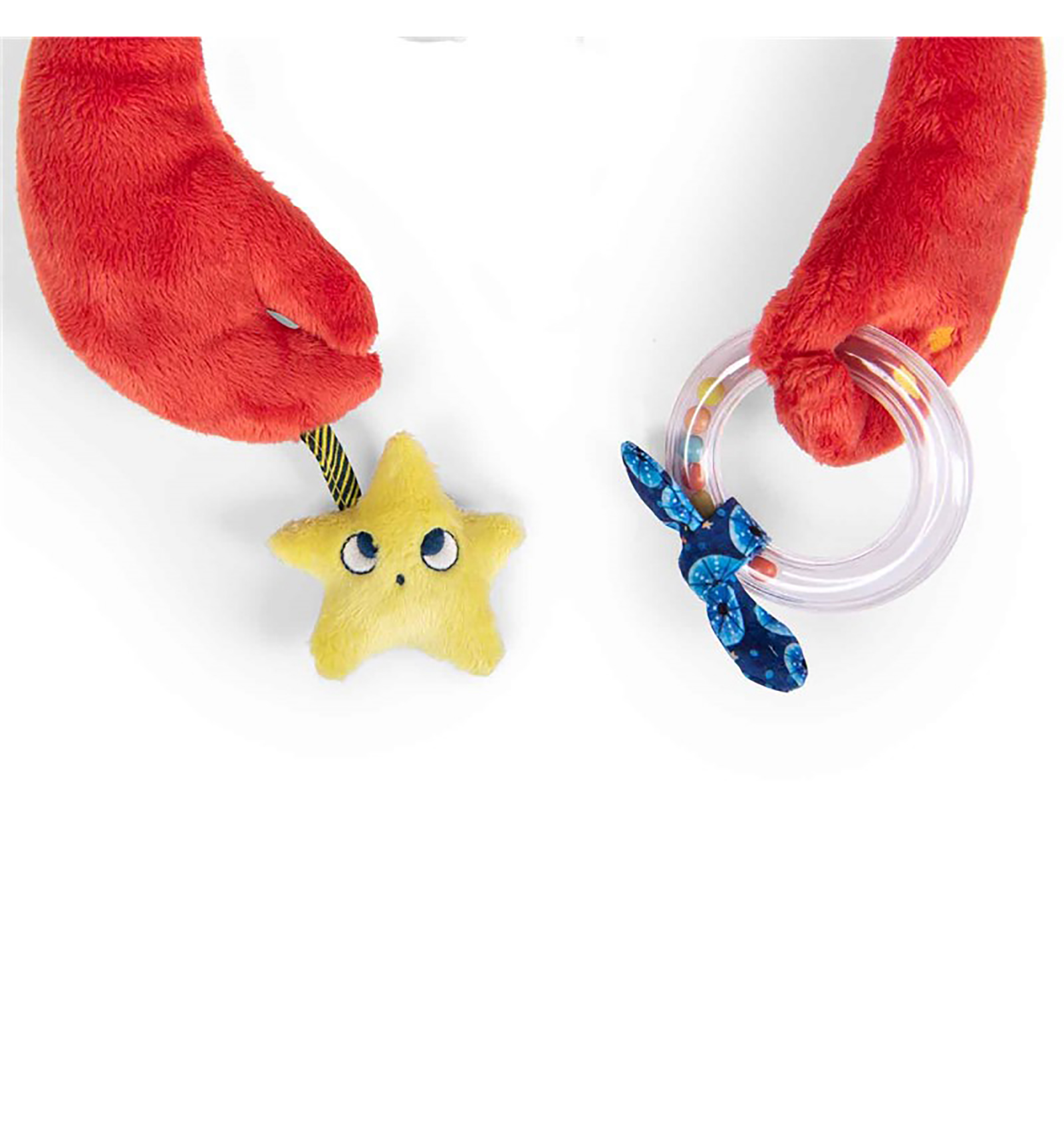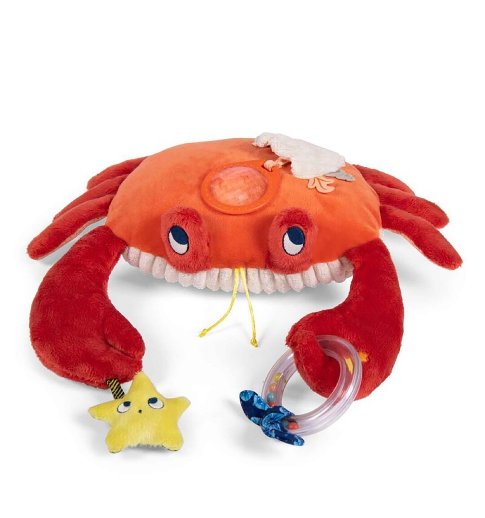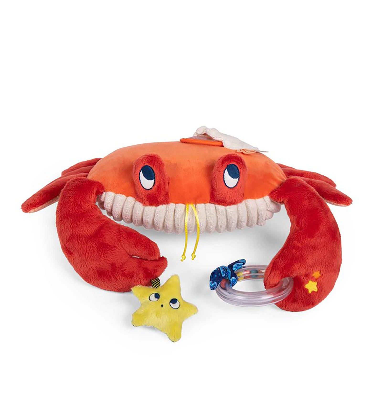 Aquest cranc, amic de Paulie de Moulin Roty, és suau com un coixí i molt divertit. Té cintes, so de paper cruixent, una estrella sonall, una anella amb boles i fins i tot un calidoscopi.
