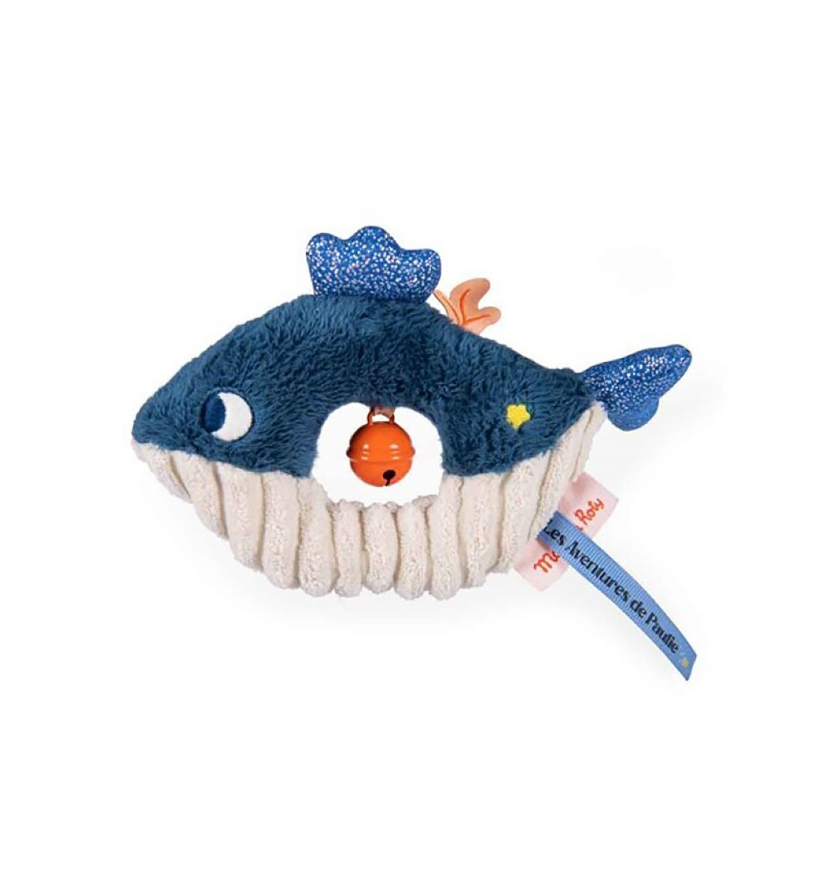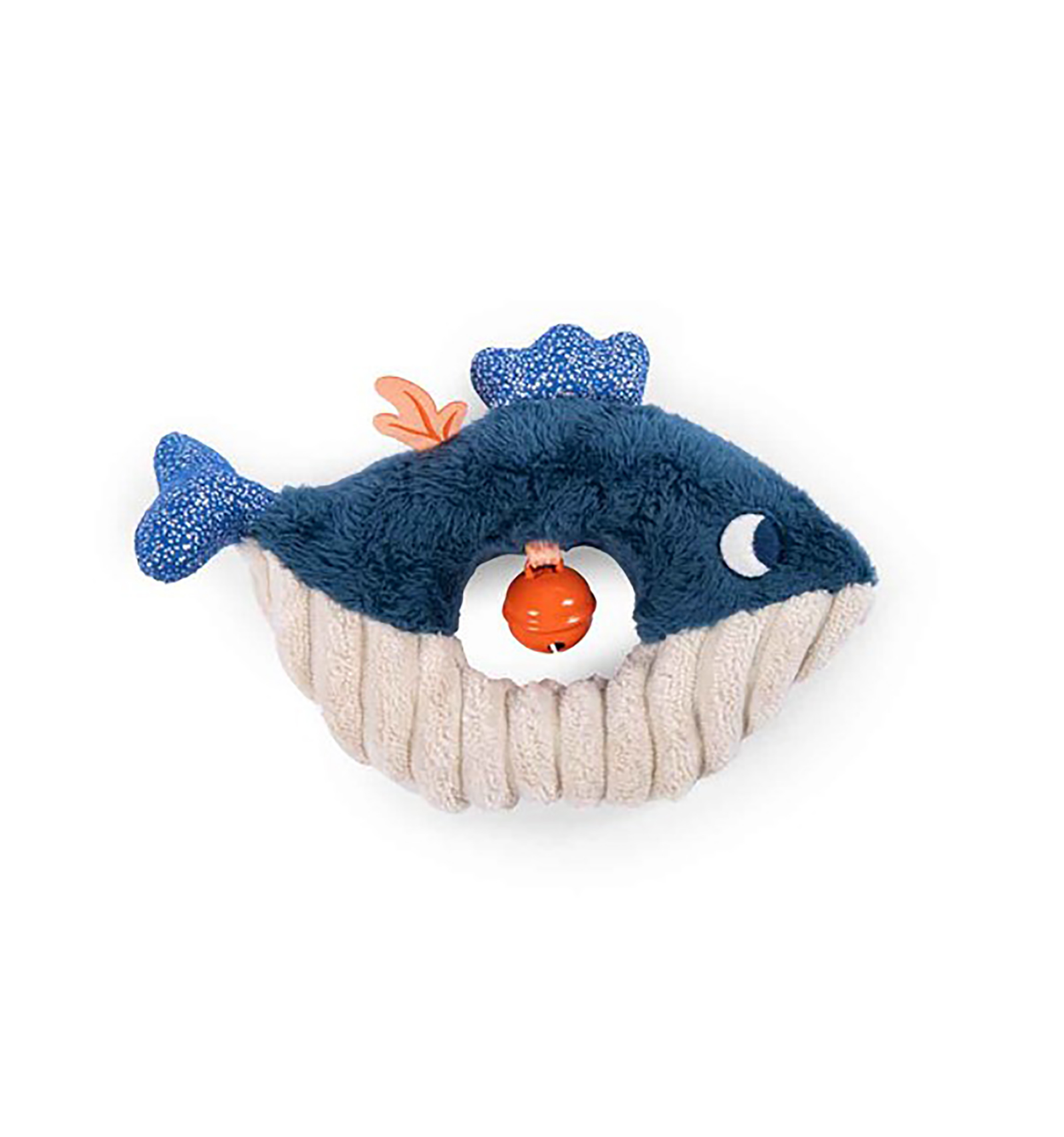 Aquest suau sonall amb forma de balena combina diferents textures. La seva forma d'anella ho fa fàcil d'agafar i té un cascavell per a estimular els sentits del nadó.