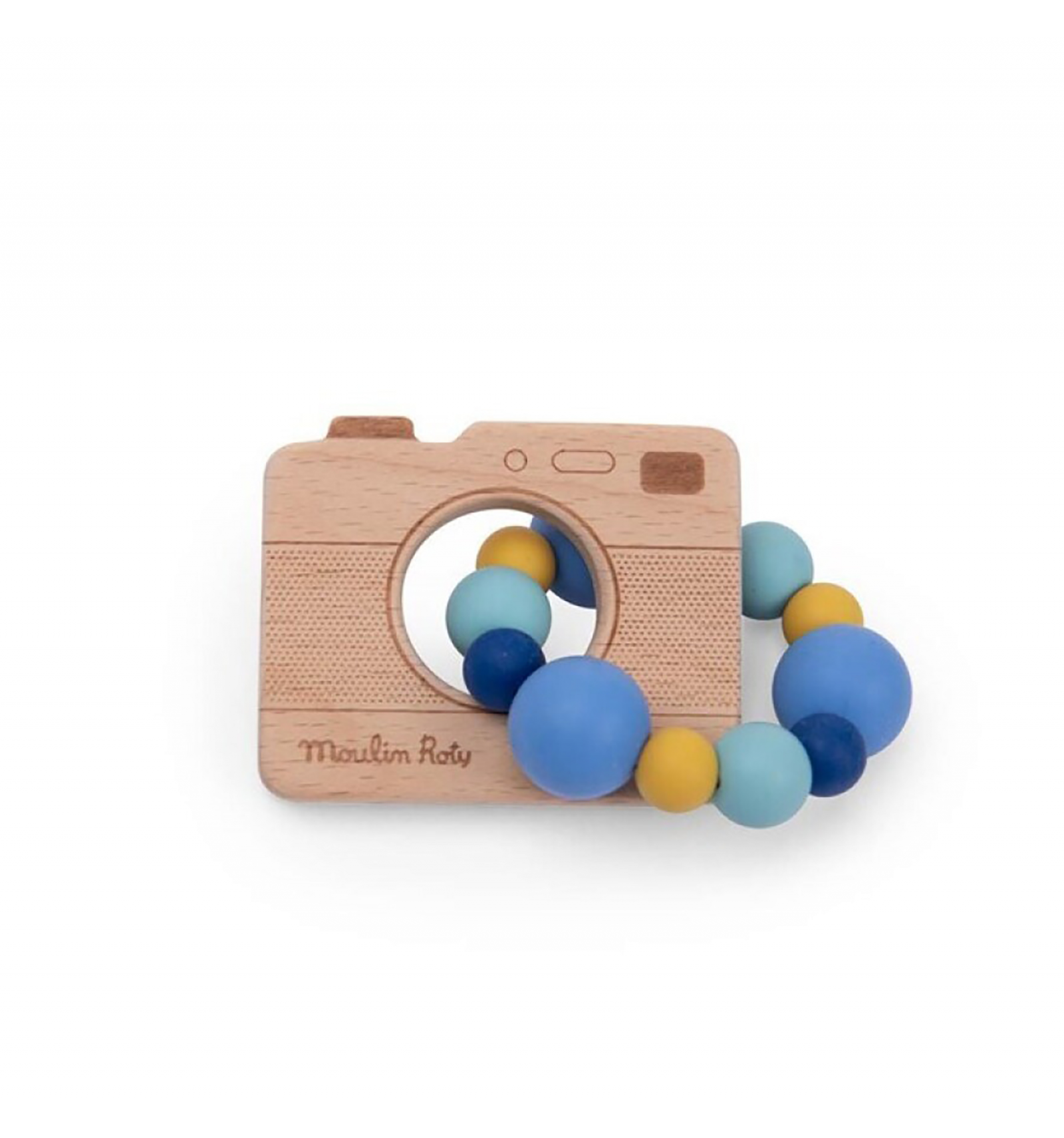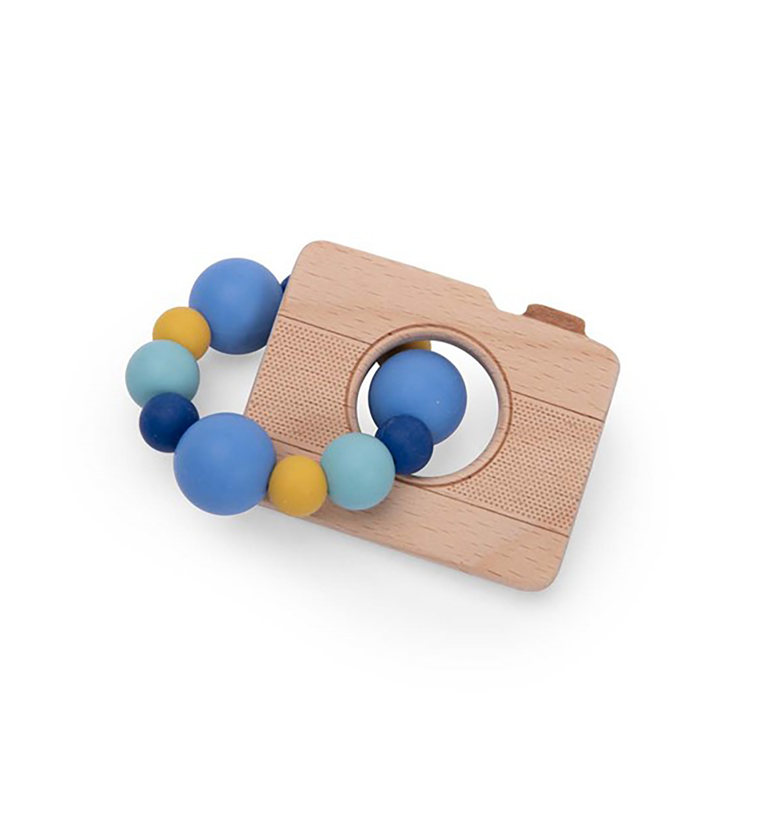 Original sonall amb forma de càmera fotogràfica, elaborat amb fusta de faig i silicona lliure de BPA. Les seves anelles produeixen sons suaus en agitar-lo, estimulant l'audició, el tacte i la coordinació del nadó de forma segura i divertida.