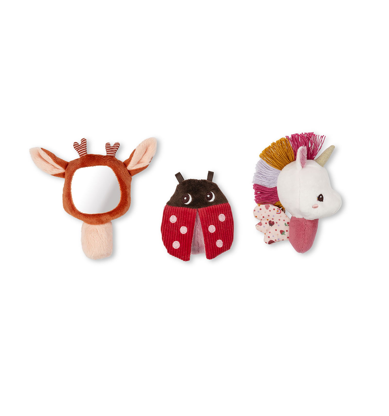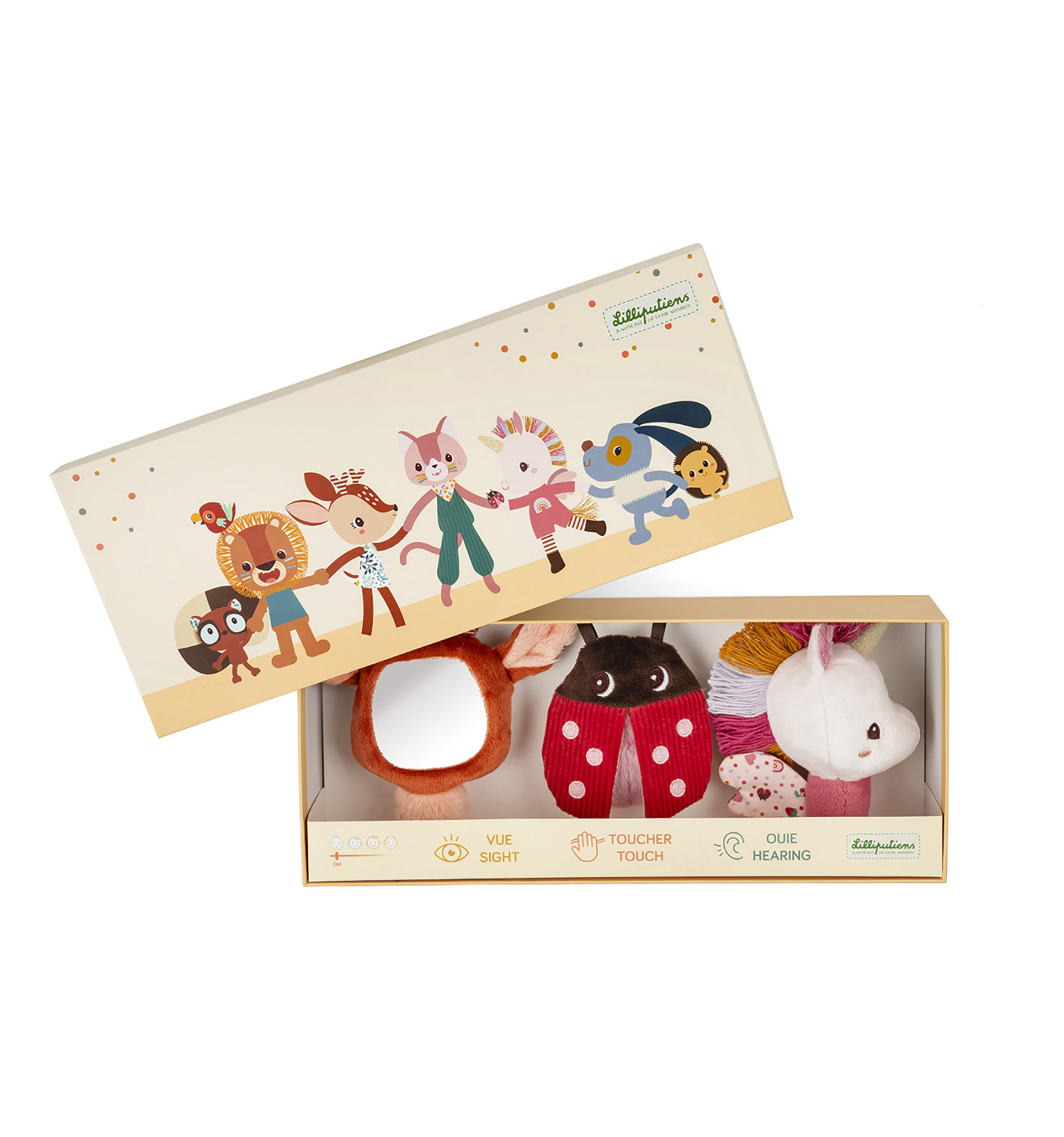 Aquest set de 3 sonalls sensorials de tela de Lilliputiens estimula els sentits del nadó des del naixement. Amb Lena l'unicorn, Stella la cervatilla i una marieta acolorida, desperten la vista, el tacte i l'oïda de manera divertida i segura.