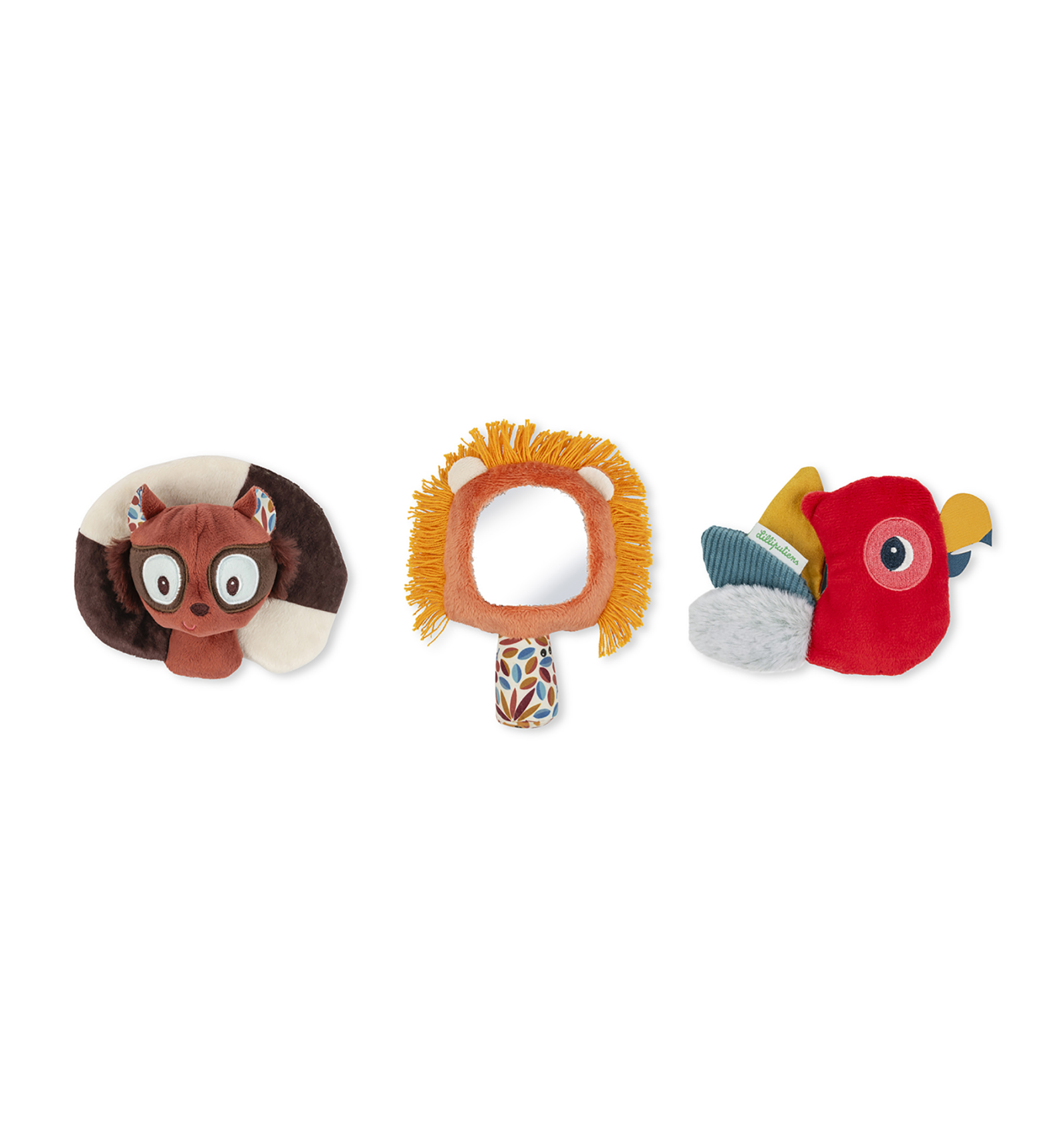 Inclou Elvis el lèmur, que emet un suau xiuxiueig en moure'l; Jack el lleó, amb la cabellera suau i un petit mirall per mirar-se; i Gilles el lloro, amb diferents textures que conviden a explorar amb les mans. Fabricats en tela d'alta qualitat, són segurs, tous i fàcils d'agafar.