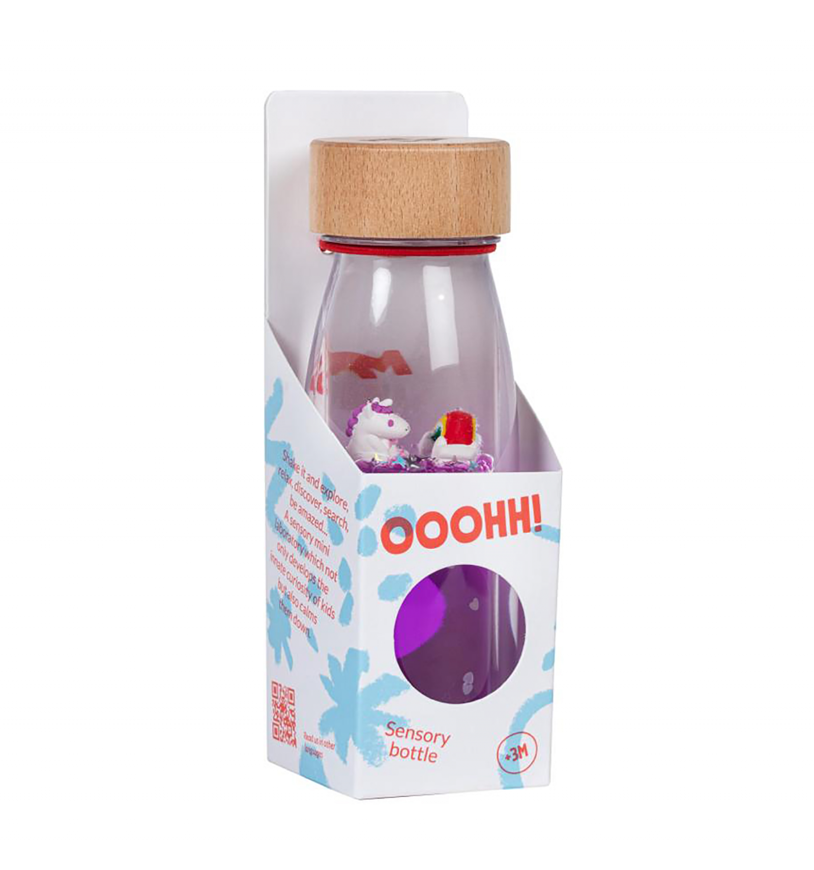 Amb la Move Bottle Unicorn de Petit Boum, cada sacsejada és una invitació a explorar un món de fantasia i colors que capturen la imaginació. Plena de bombolles flotants i un líquid especial que dona vida als somnis, aquesta ampolla amb efecte lupa permet acostar-se i observar com suren planetes, animals i altres encantadors personatges amb el canvi de densitat del líquid. Un disseny màgic que ajuda els petits a relaxar-se mentre estimula la seva percepció visual, auditiva i sensorial.