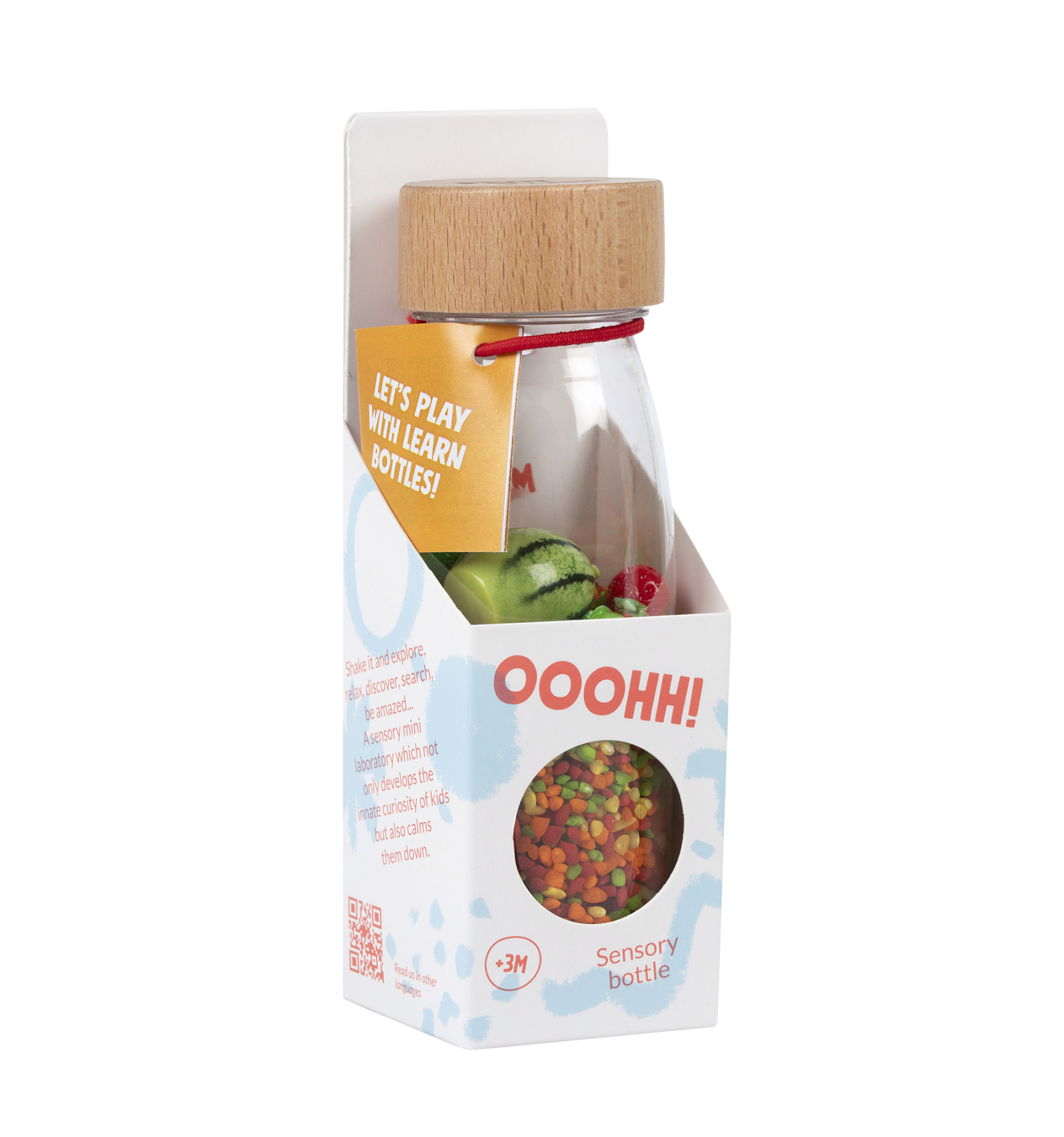 Identificar fruites és ara una experiència sensorial! Amb la Learn Bottle Fruites de Petit Boum, els nens poden agitar i descobrir un acolorit món de mandarines, raïm, plàtans i maduixes. Troba la teva fruita favorita!