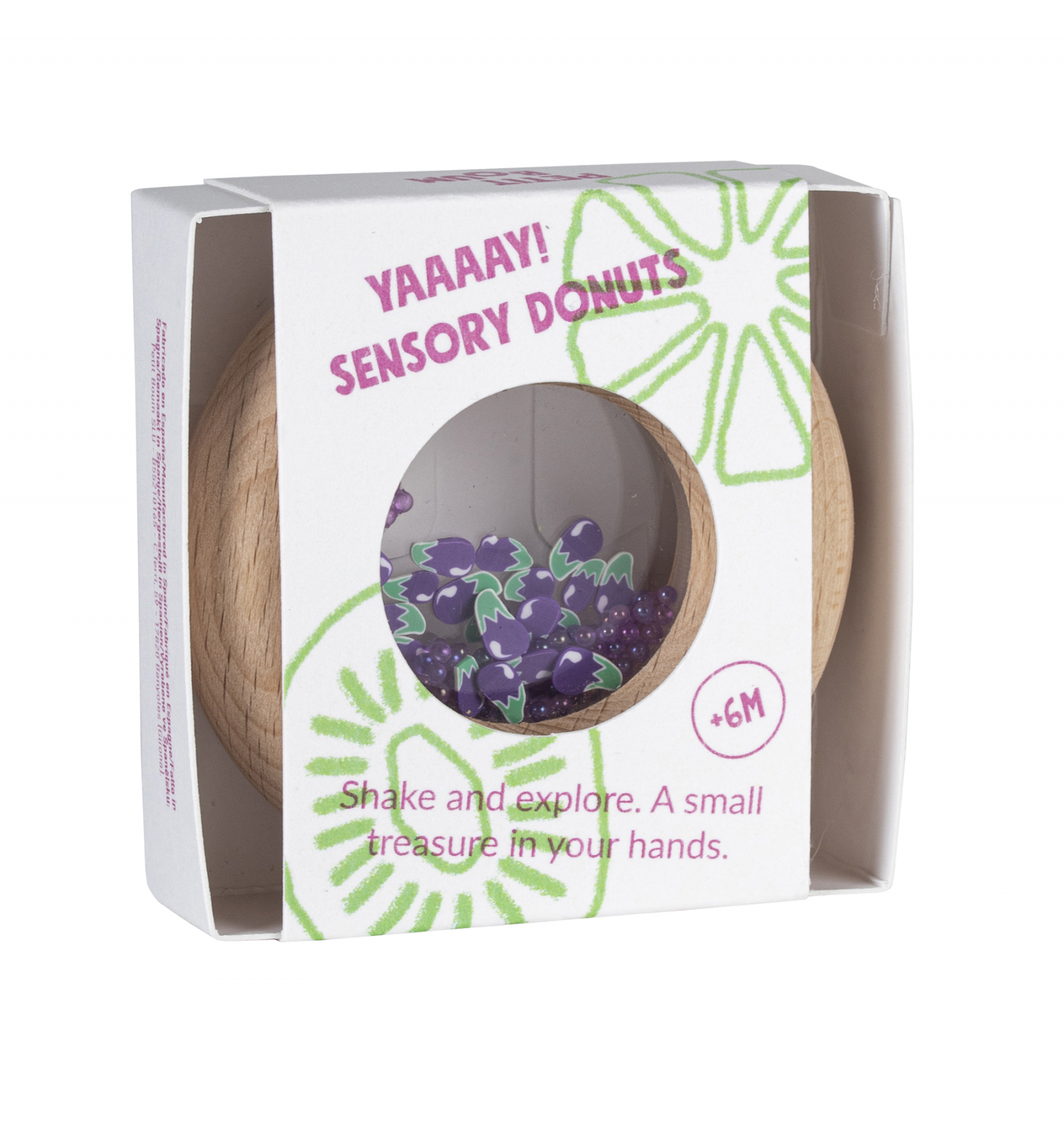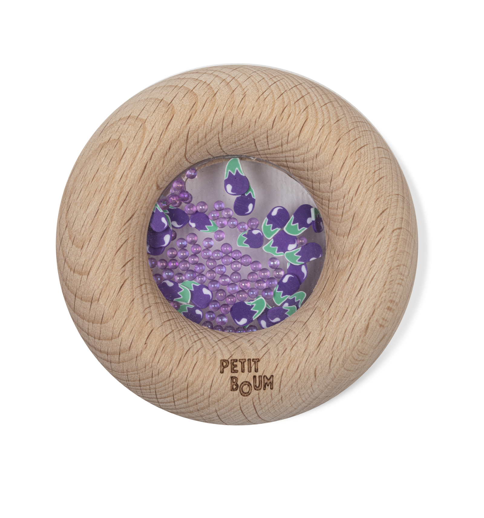 El Dònut Sensorial de Petit Boum és una joguina de fusta en forma de dònut que enamora als petits. Aquest sonall, amb figures de fruites i verdures en el seu interior, emet un so irresistible en agitar-se i està dissenyat per a ser manipulat fàcilment per les mans petites. Fabricat en fusta de faig, lliure de tòxics i segur per a mossegar.