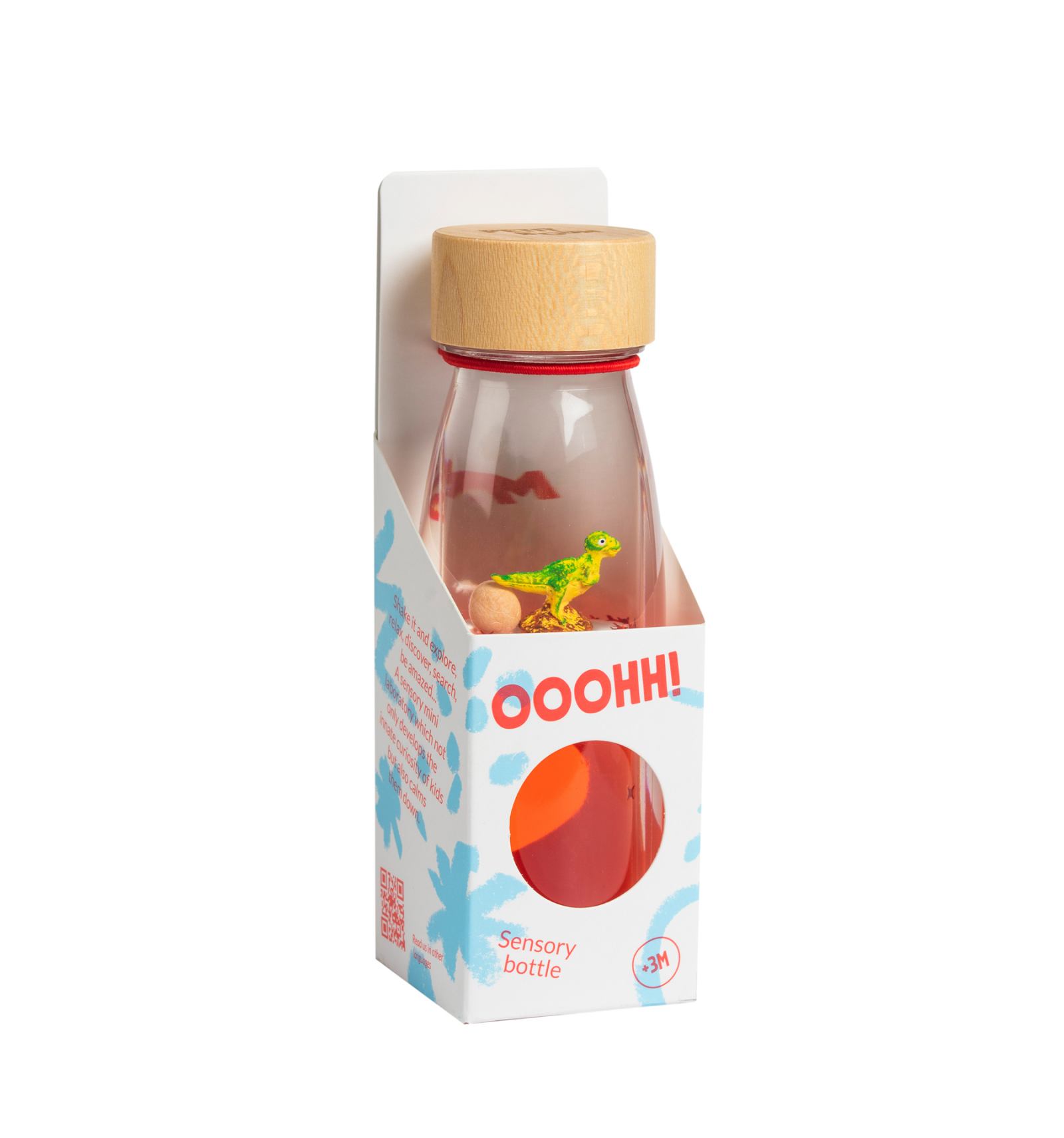 El T-Rex més majestuós flota dins d'aquesta Move Bottle sensorial. En agitar-la, el dinosaure i les bombolles es mouen suaument creant un efecte relaxant que estimula la calma i la imaginació. Totalment segellada i segura, perfecta per a acompanyar moments de tranquil·litat.